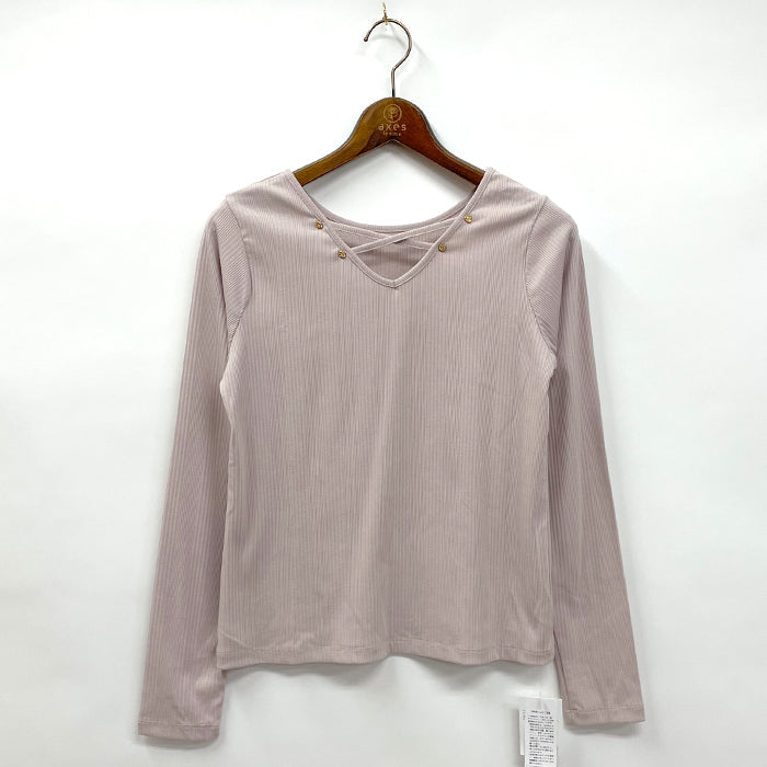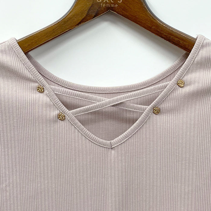 さりげないバラのパーツ使いと、クロスデザインがポイントのリブプルオーバーです。