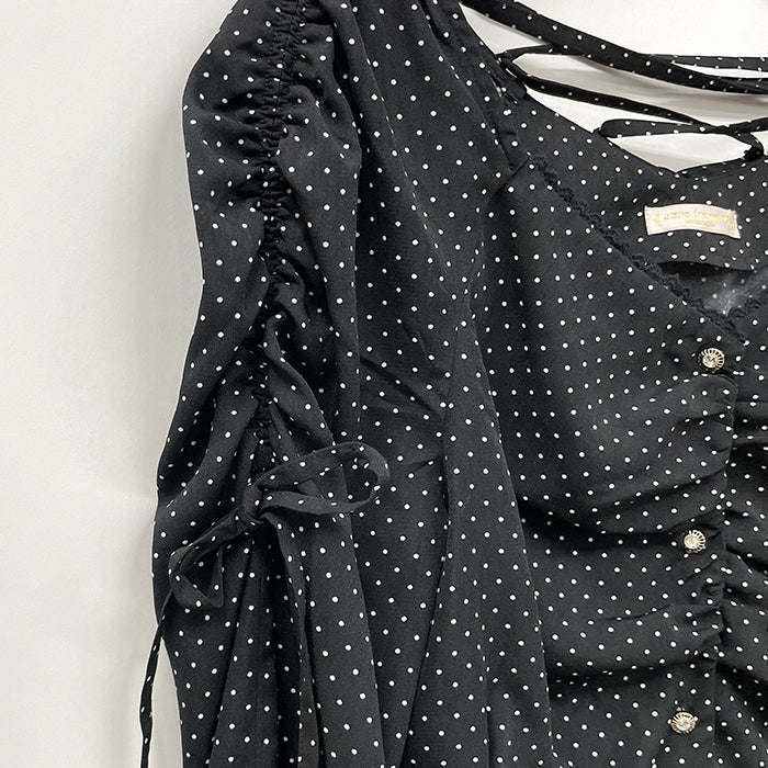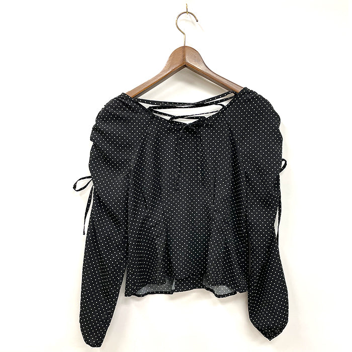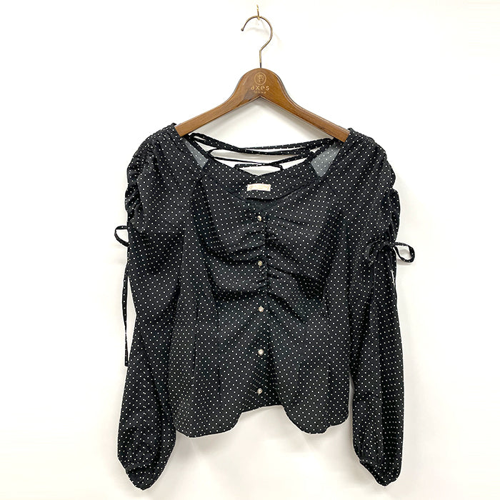 ドット柄で程よい光沢感のある素材がフェミニンなブラウスです。スッキリとしたデコルテデザインや後のレースアップデザインでトレンド感もプラス。