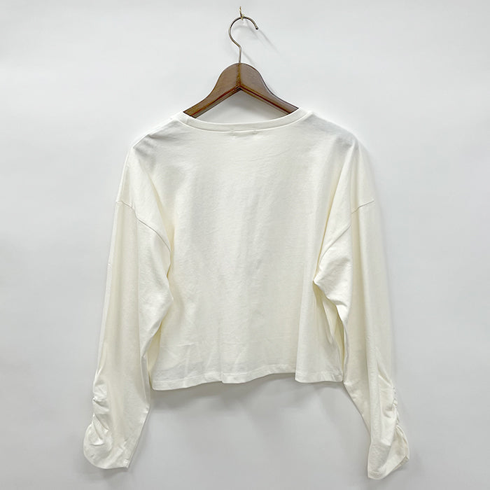 ドロップショルダーのゆったりしたシルエット×袖ギャザーデザイン。