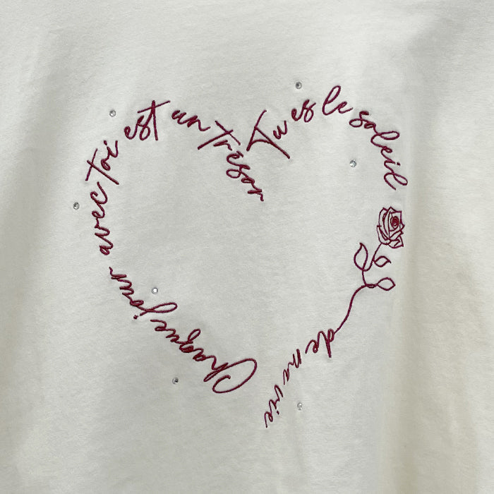 大きなロゴハート刺繍とフルーツスタンドプリント、photoプリントのアソートで、すべてホットフィックスでキラッとしたラインストーンを飛ばしたデザイン。