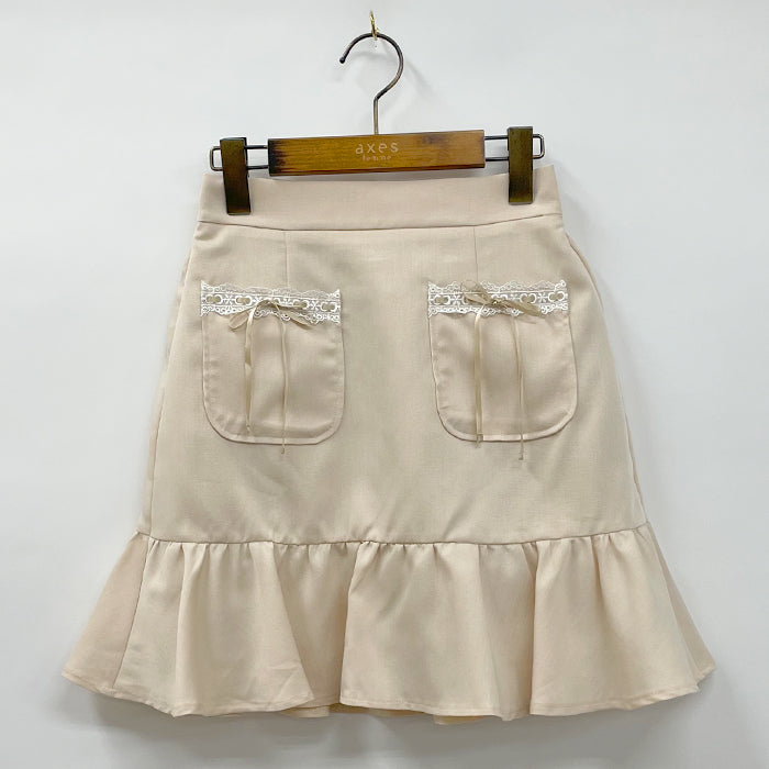 ポケットの縁にレースとリボンをあしらい、ガーリームードたっぷりに仕上げたスカートです♪