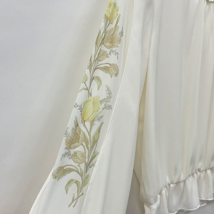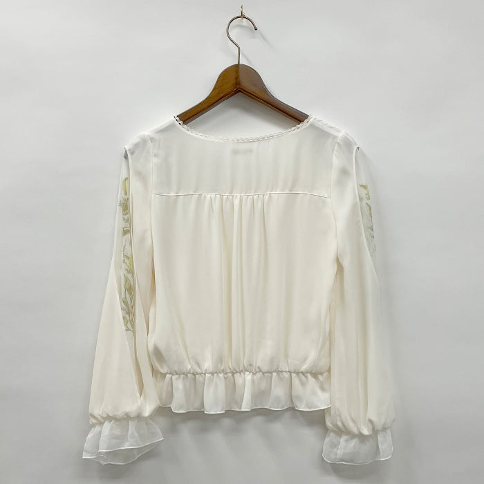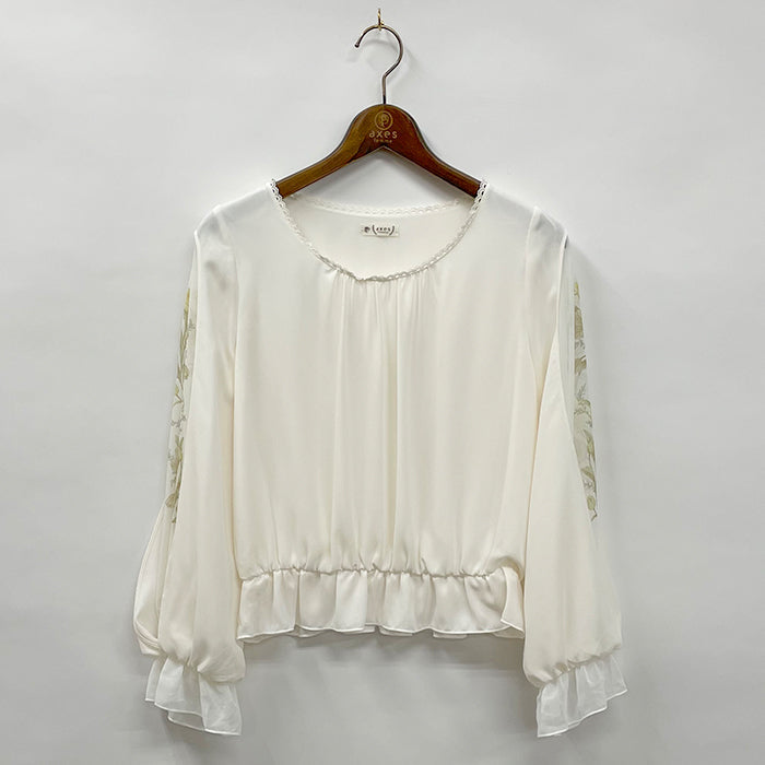 袖に繊細なチューリップ柄をプリントしたブラウスプル。裏地はカットソーで着やすさ◎。同じチューリップモチーフのスカートと合わせると春らしいエレガンスコーデに仕上がります。