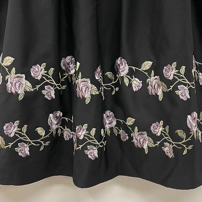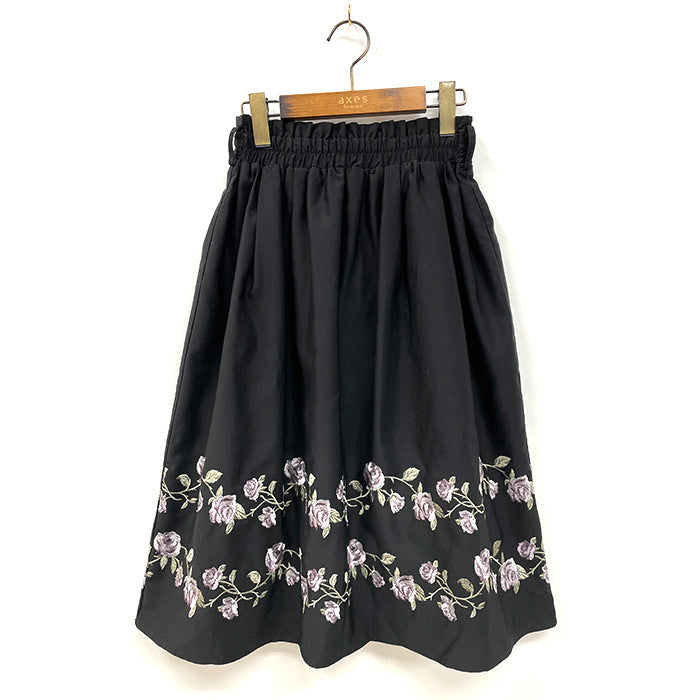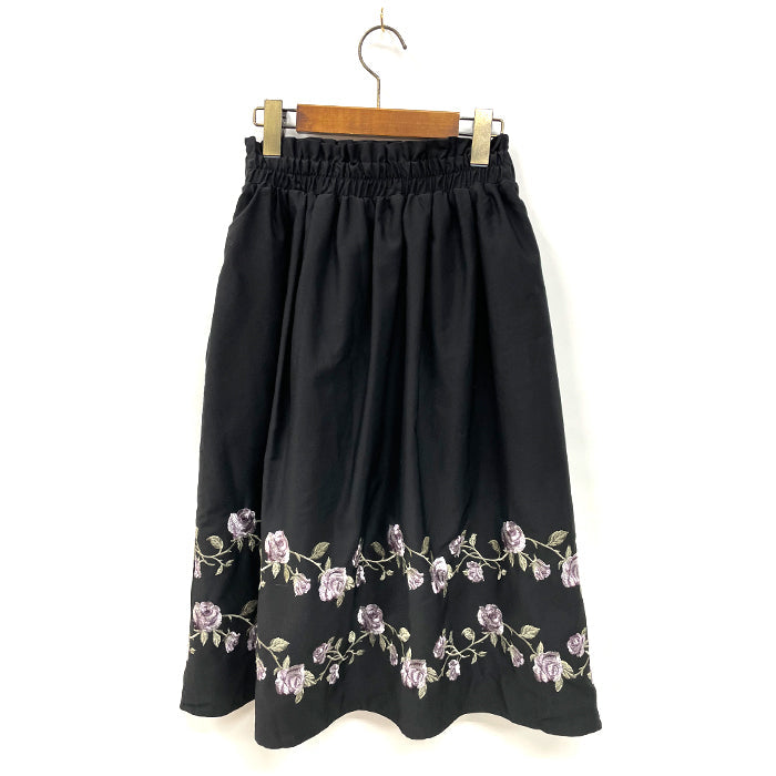 ばら柄の刺繍が裾にたっぷりあしらわれたスカートです。ウエストには取り外し可能なリボンがついています。
