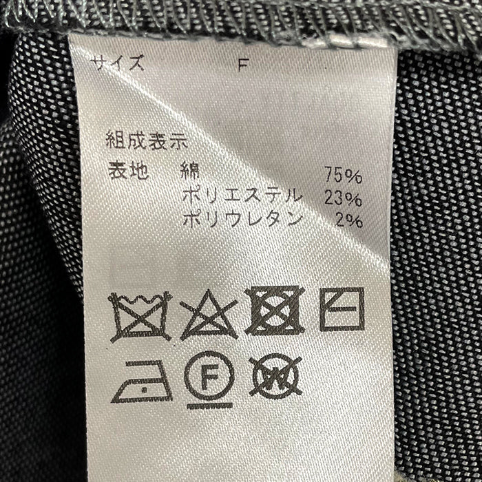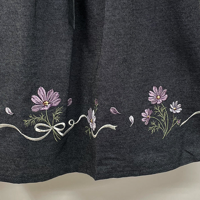 デニム地にあしらわれた、パネル状の裾の刺繍が存在感のある1着。