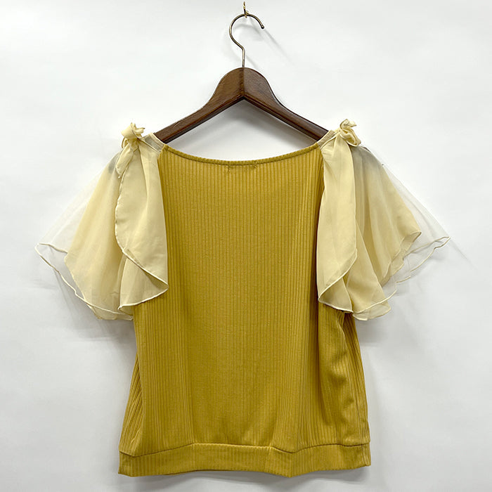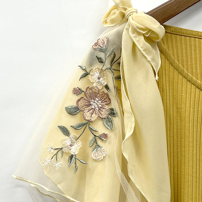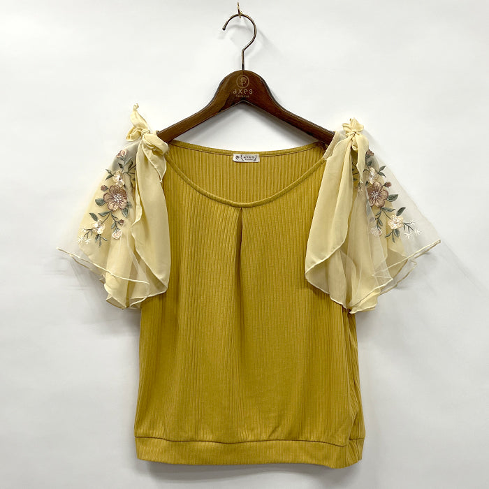 袖にあしらわれた刺繍がポイントのトップスです。袖のフレア感と透け感が涼しげでフェミニンです。裾のリブ切り替えで、インでもアウトでもボトムスに合わせやすく、コーデしやすいのが嬉しいポイント。