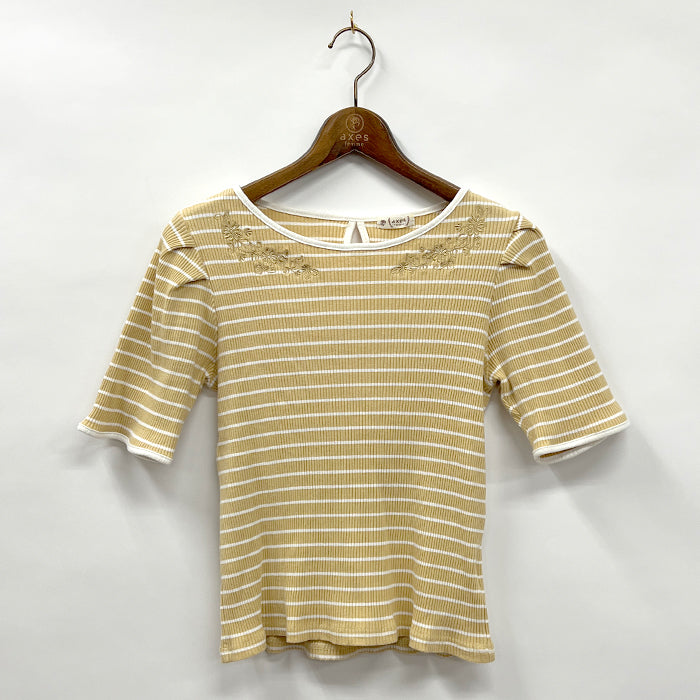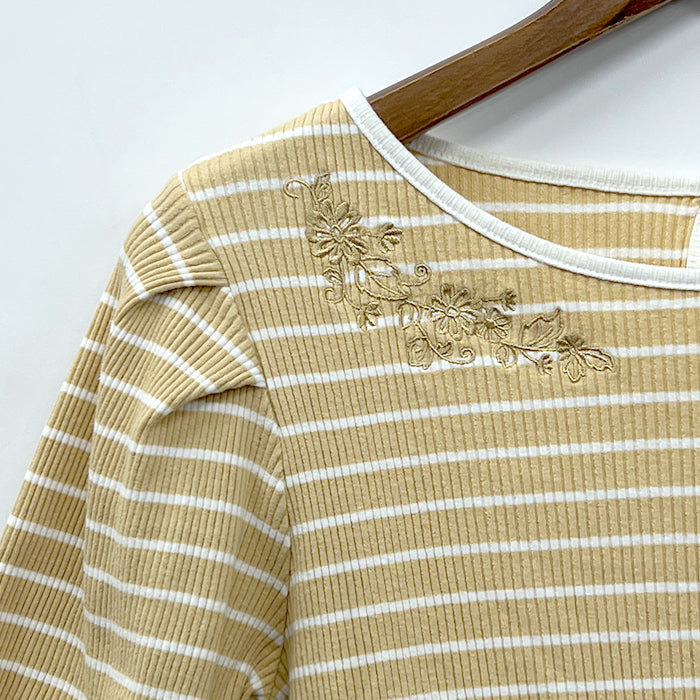 フロントの花刺繍がポイントで、繊細な柄がカジュアルながらも上品な印象に。