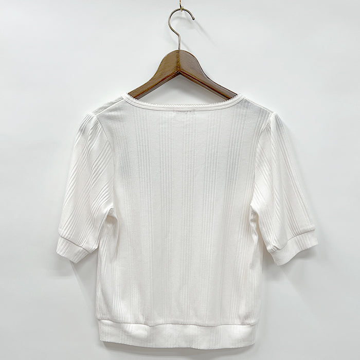 胸元のラベンダー刺繍がゴージャスなカットソー素材のカーディガン。リブ素材はストレッチがきいており、きれいな目面でカジュアルすぎないシルエットが◎。パールをほどこしよりエレガントな印象に。前をとじてトップスのように着用しても◎