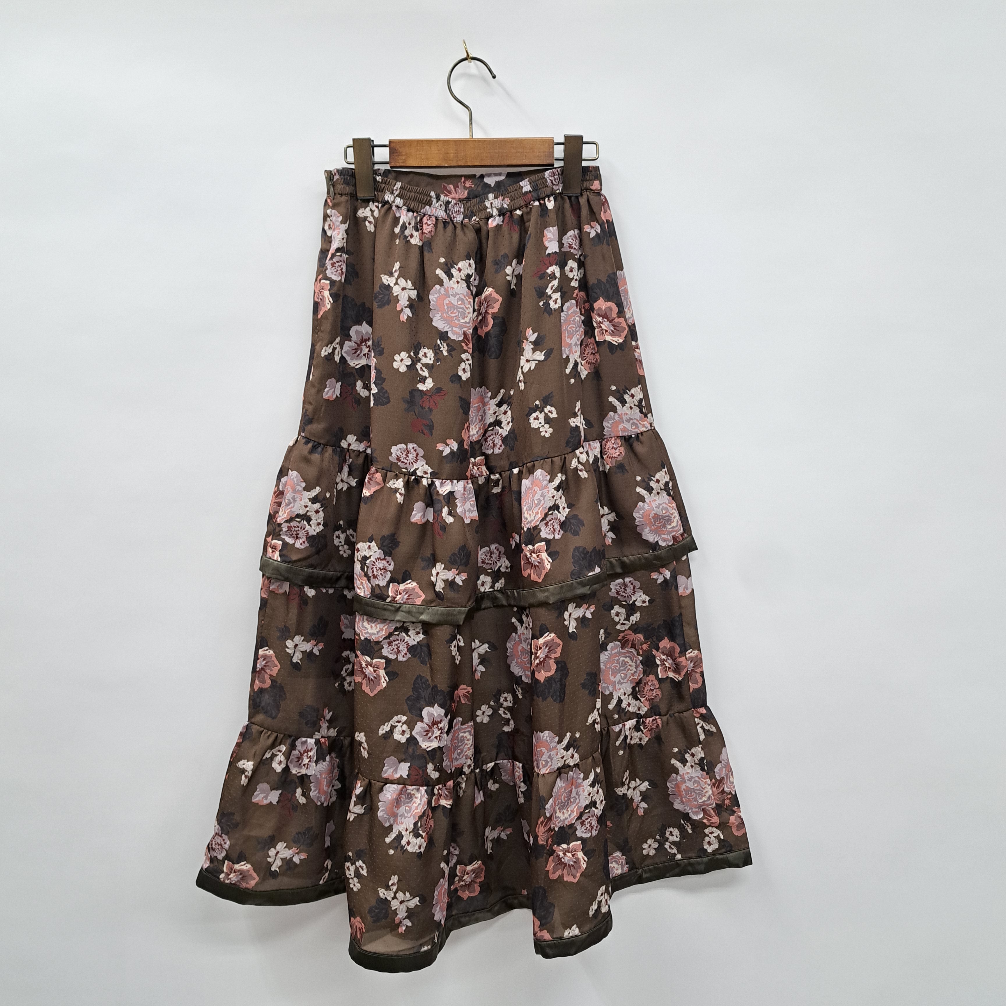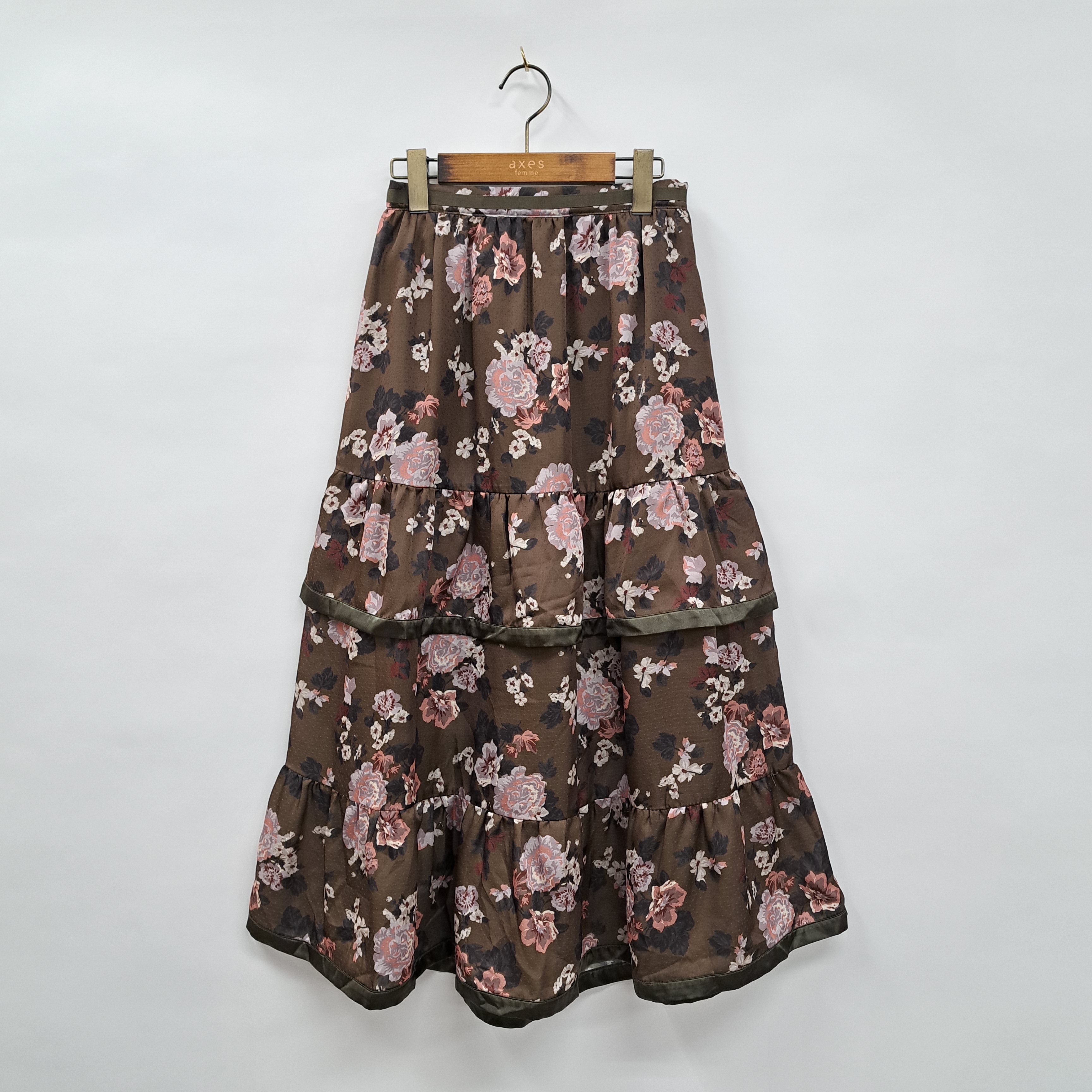 ヴィンテージライクな大花プリントのティアードスカートです。トップスをインしてベルト合わせでエレガントな印象に、ゆったりトップスをアウトで重ねた着こなしもトレンド感がでておすすめです。