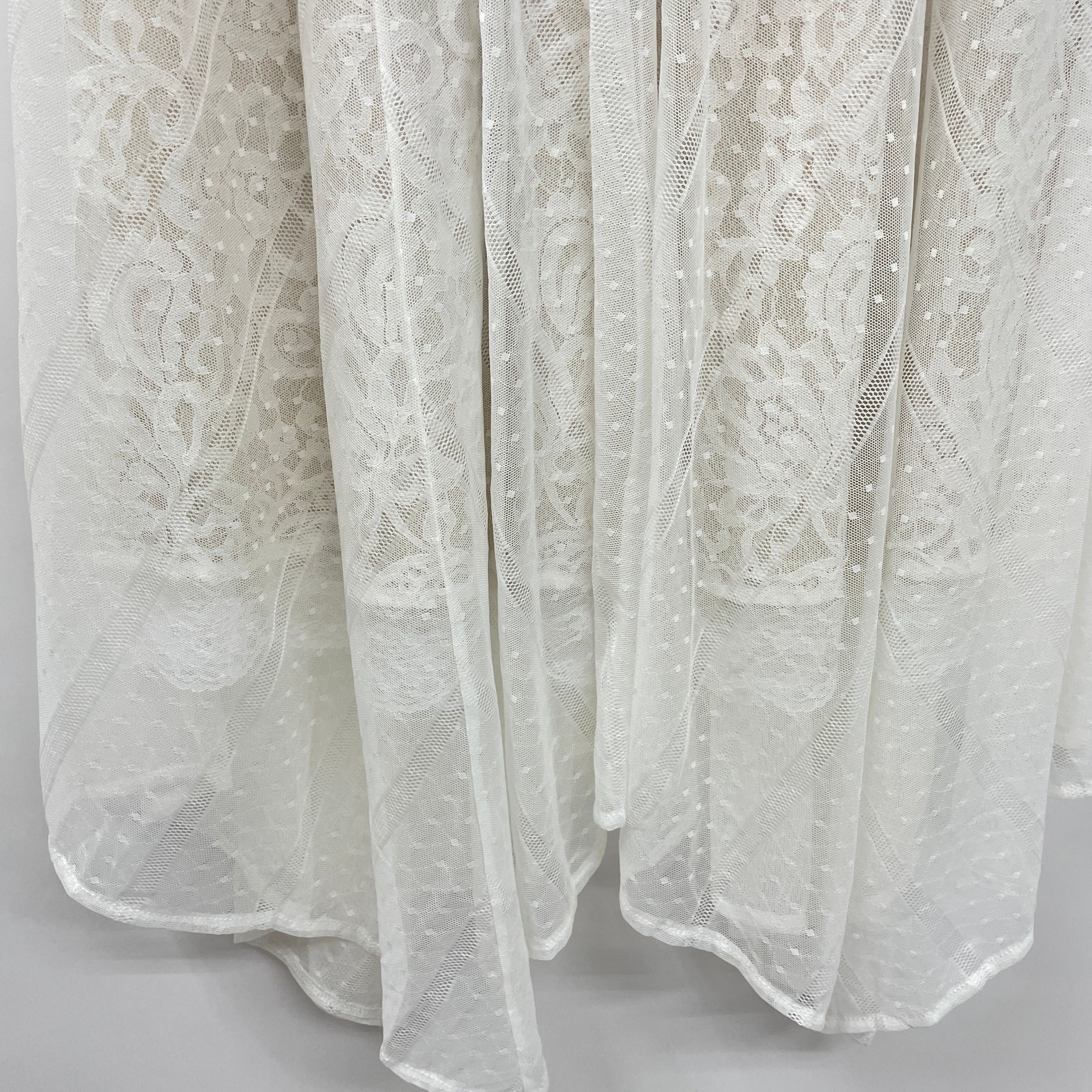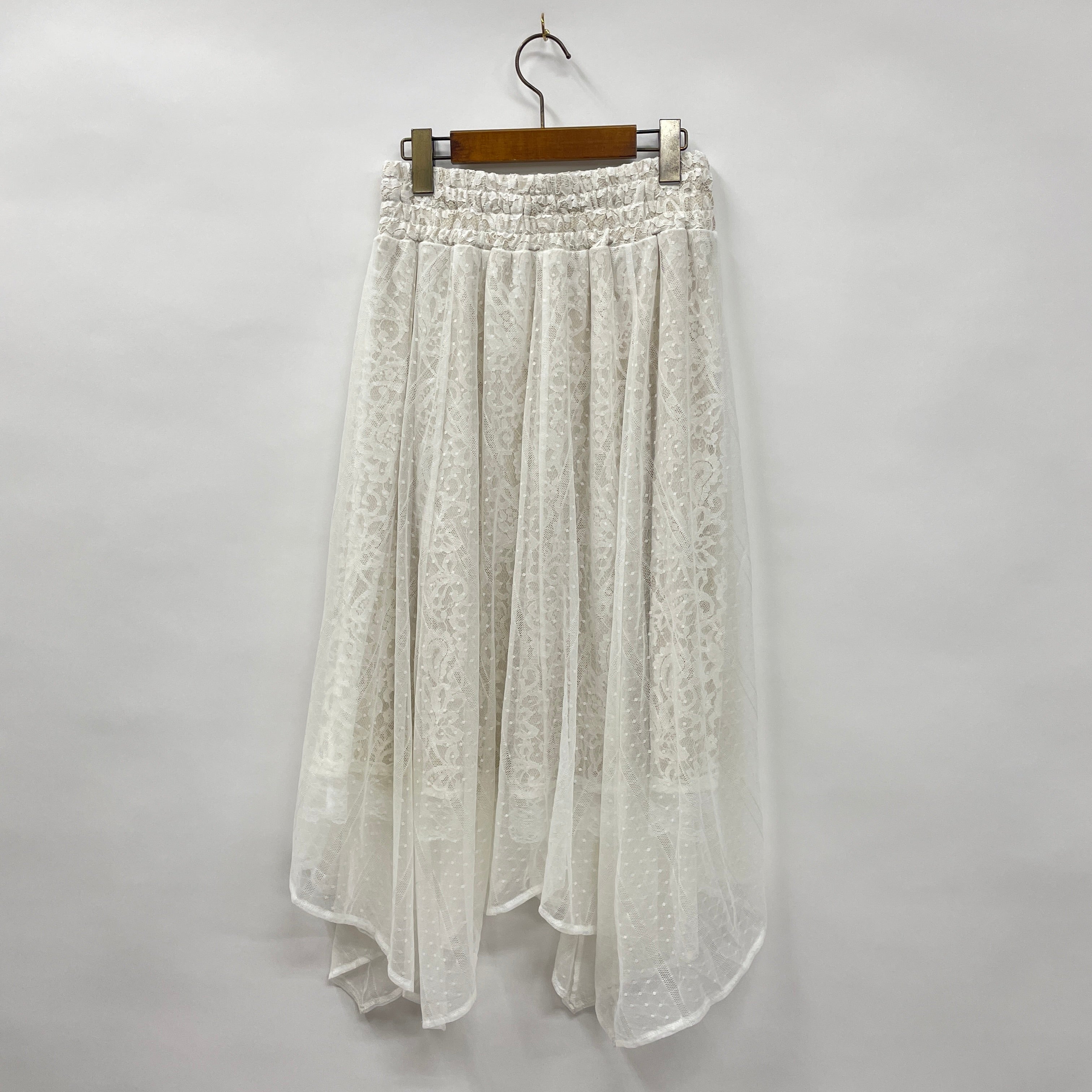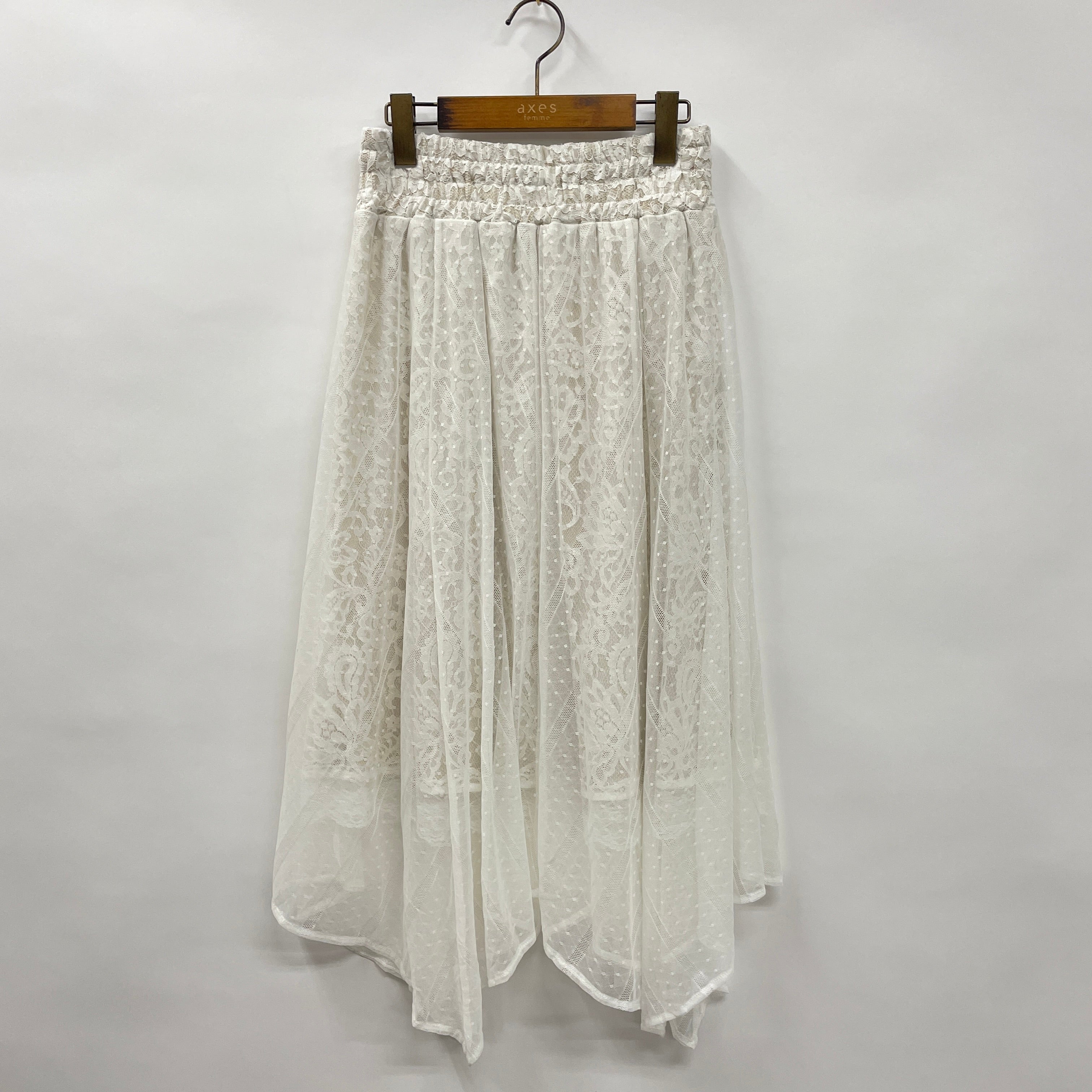 レースを重ねたデザインが華やかなスカート。イレヘムデザインでゆれるシルエットが繊細でフェミニンな印象を与えてくれます。ウエストはシャーリングゴムで着やすさ◎。トップスをインしてベルト合わせでエレガントな印象に、ゆったりトップスをアウトで重ねた着こなしもトレンド感がでておすすめです。