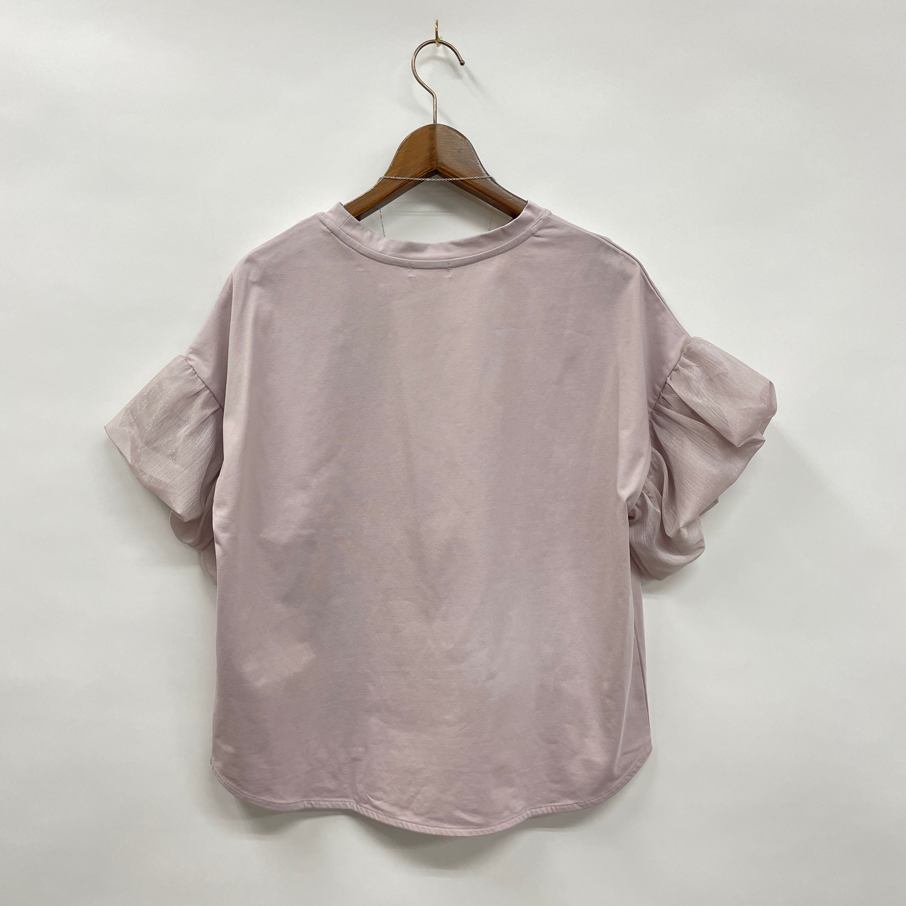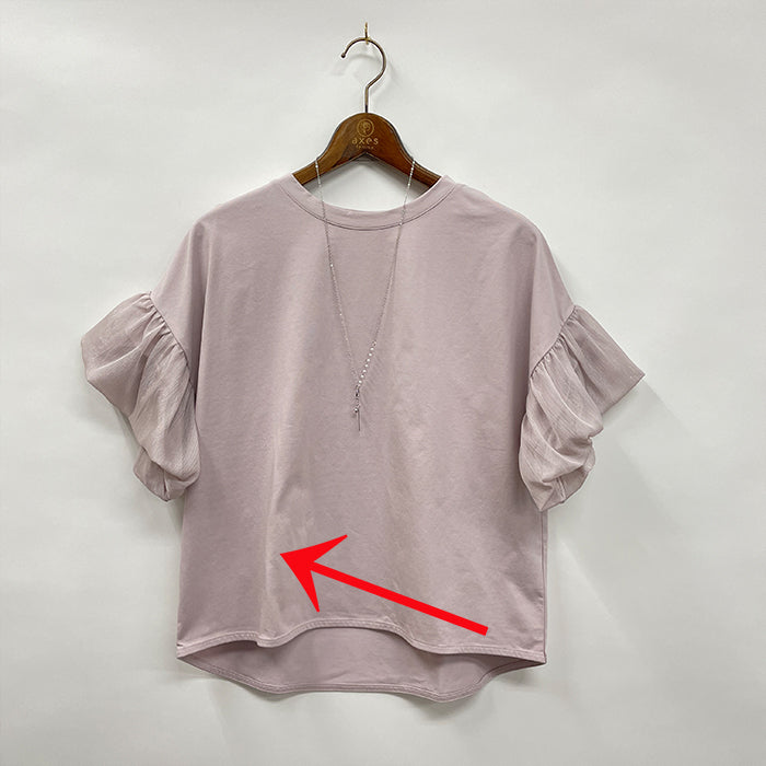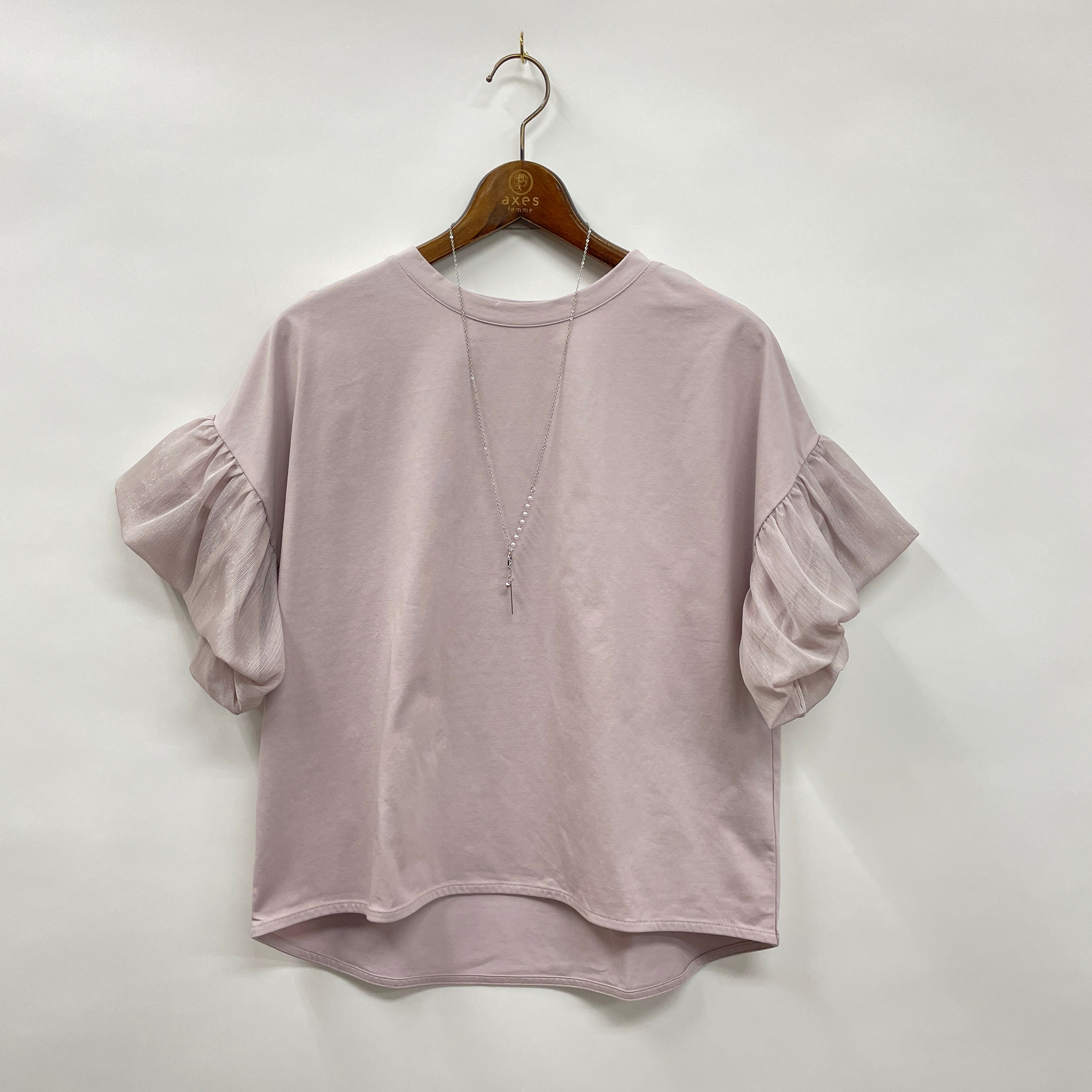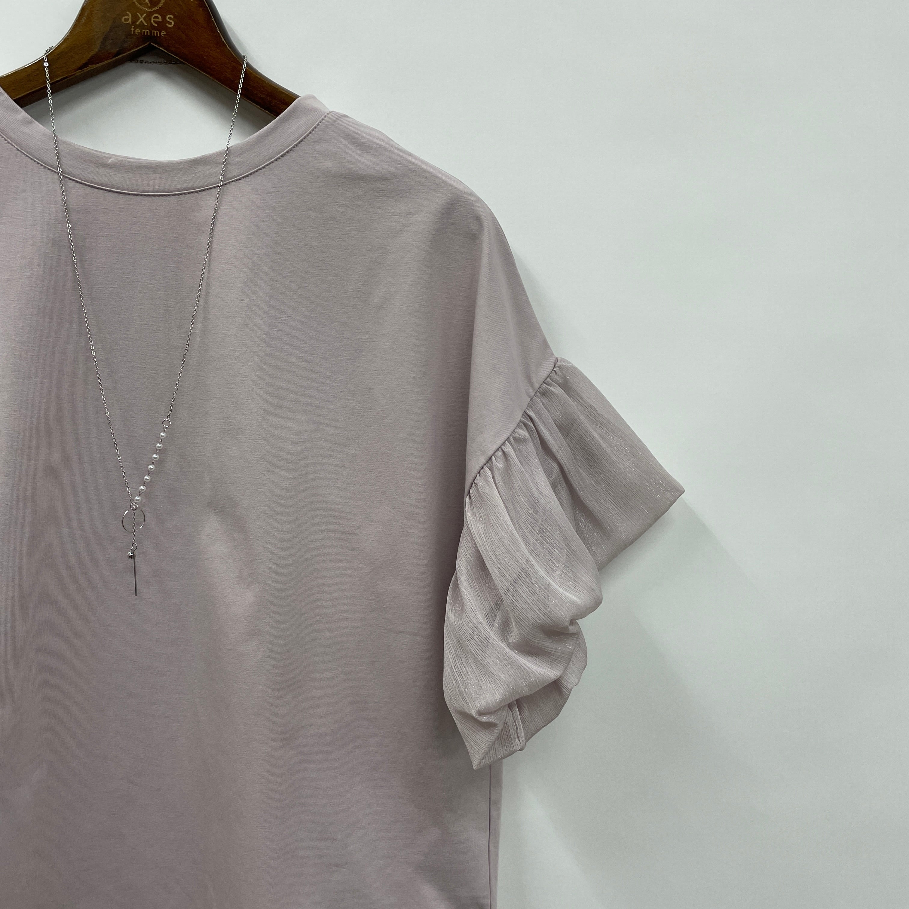 キラキラしたラメ糸混の楊柳生地との袖切替がポイントのカットプルオーバーです。