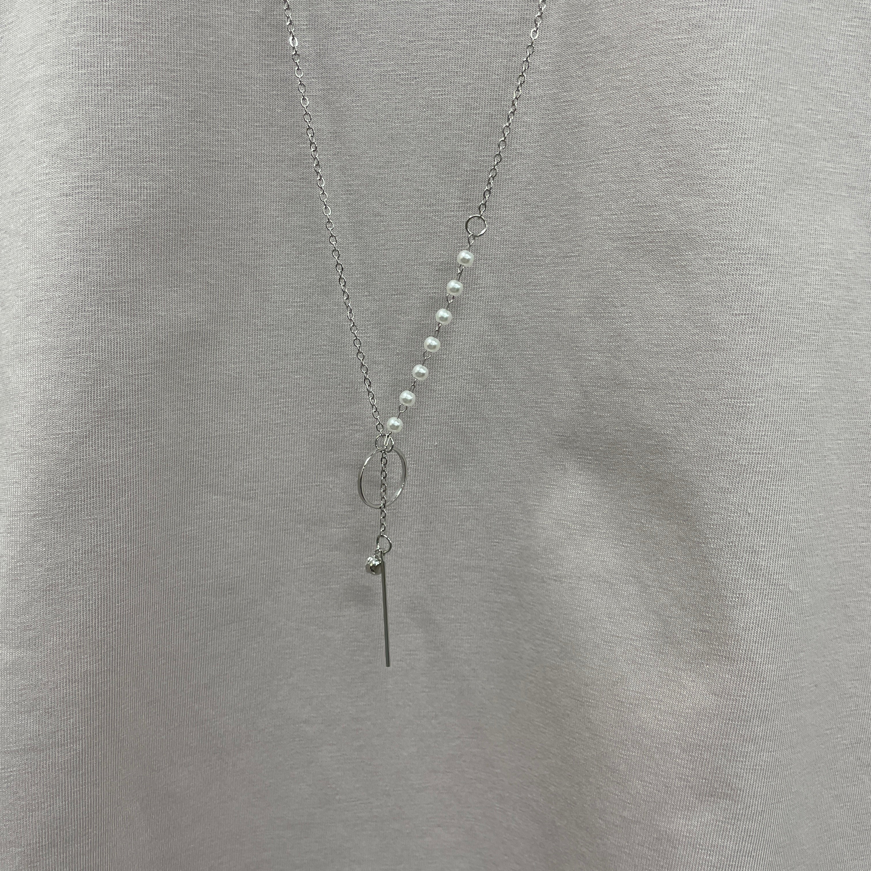 ワンポイントのビジューがキラッと光るロングネックレスもセットです。