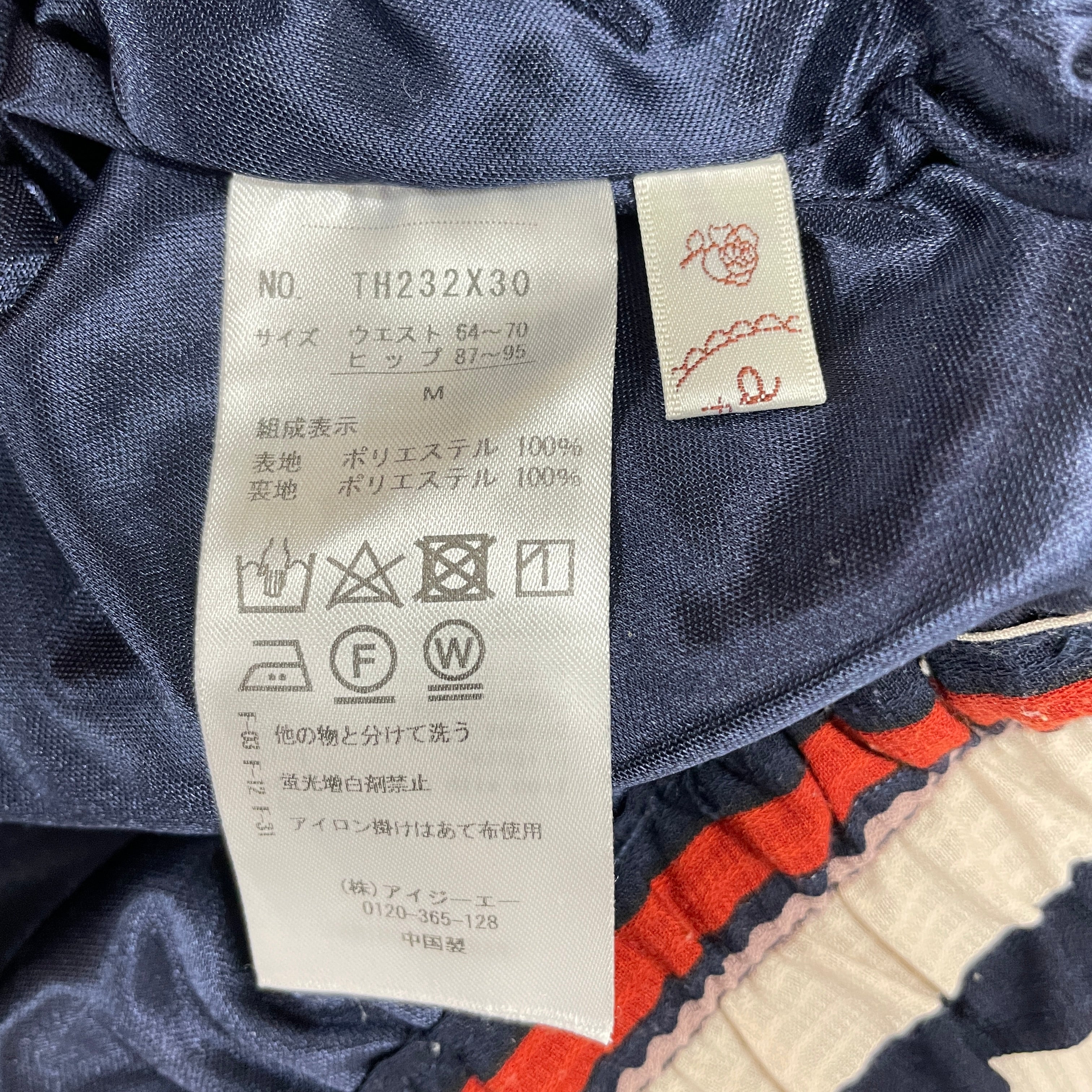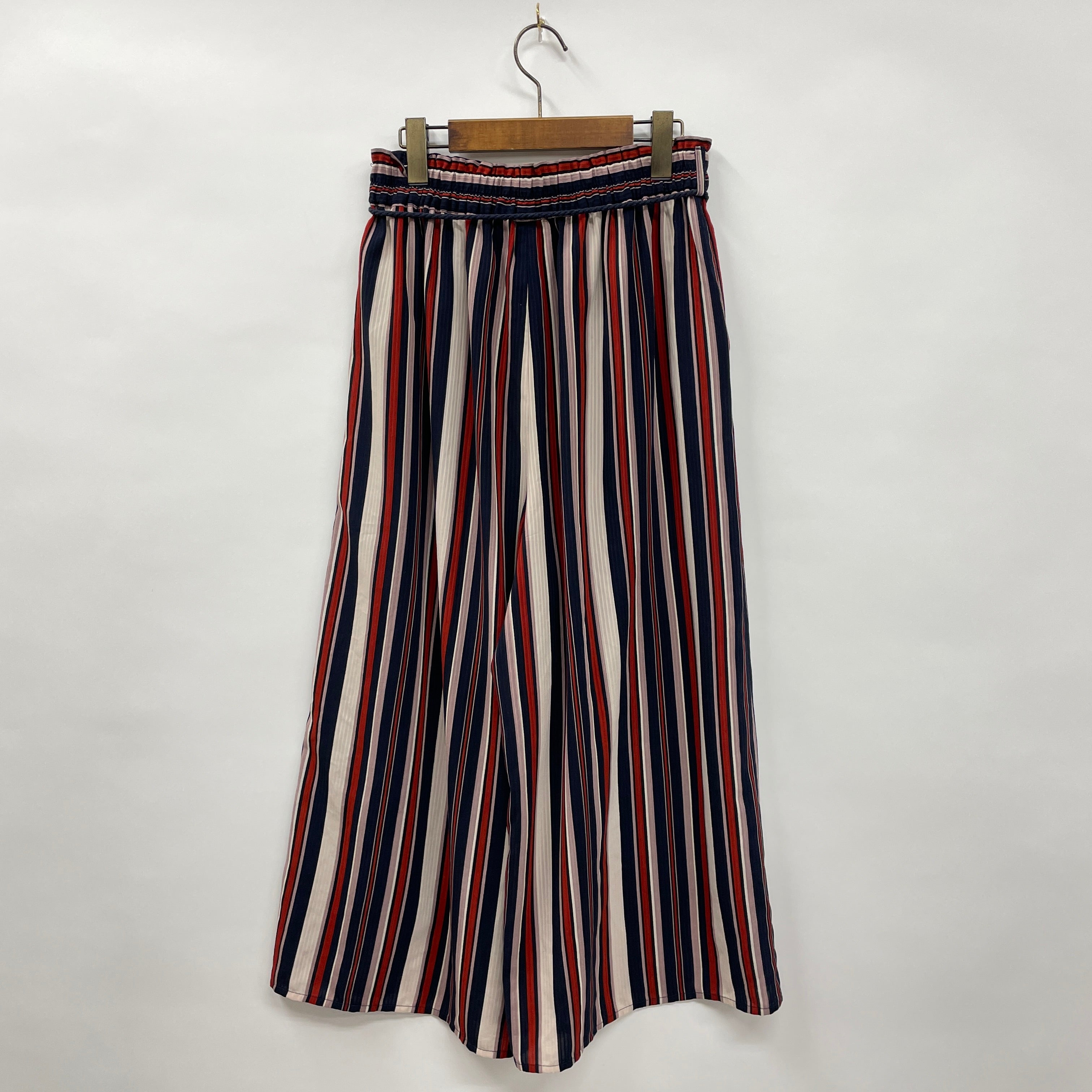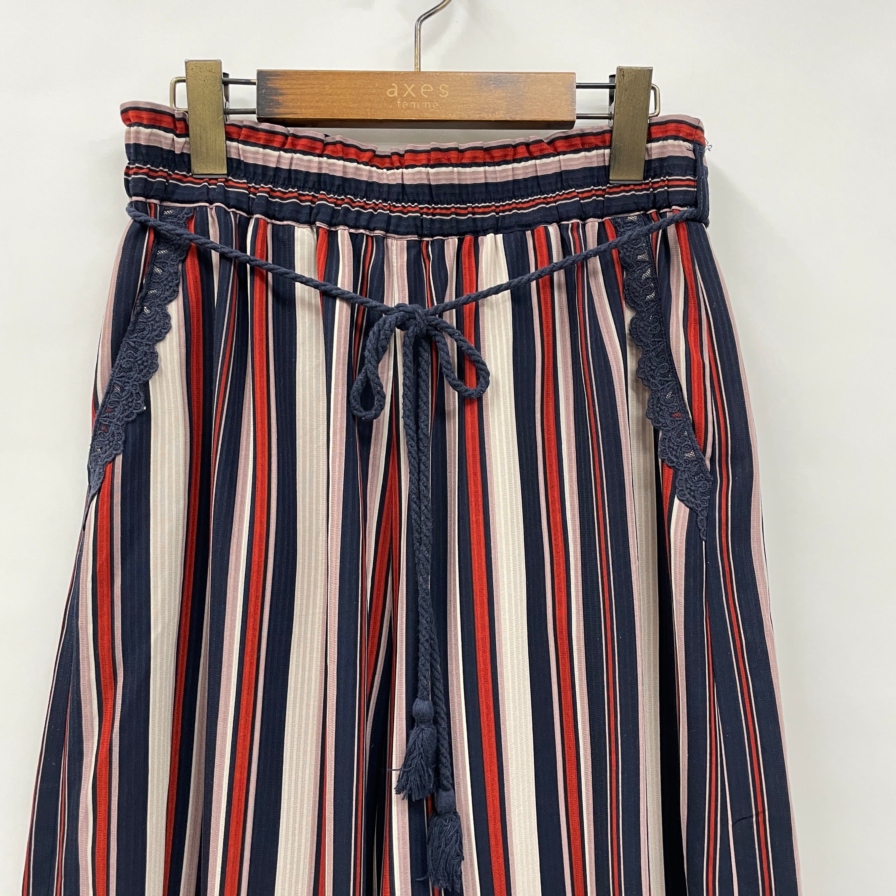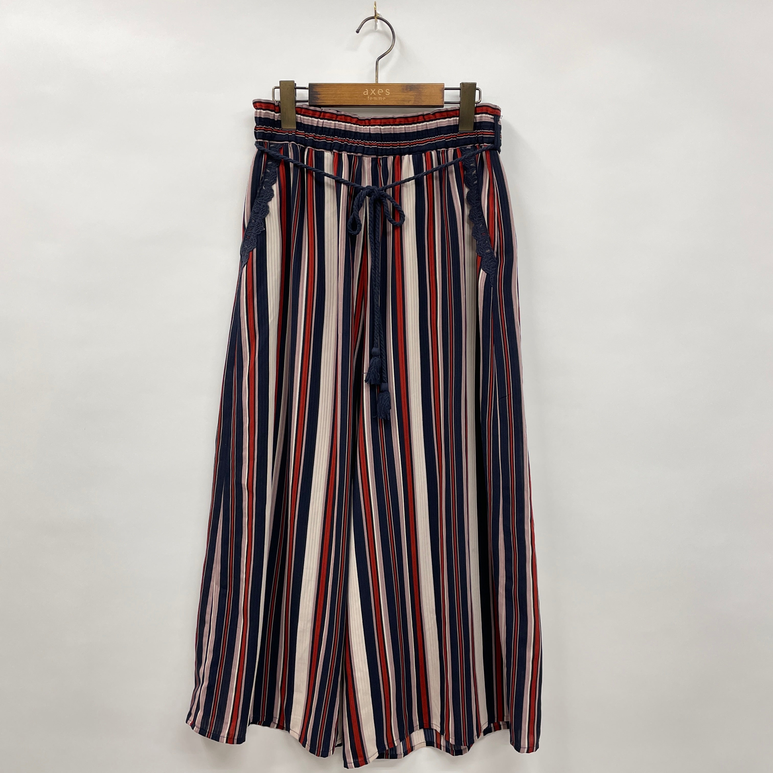 マルチストライプ柄のワイドパンツです。ストライプ柄の表面変化のある生地を使用しており、涼しく履き心地が良いのがポイントです。ウエスト紐は今年らしいタッセルデザインになっています。これから夏に向けてのマストアイテムです。