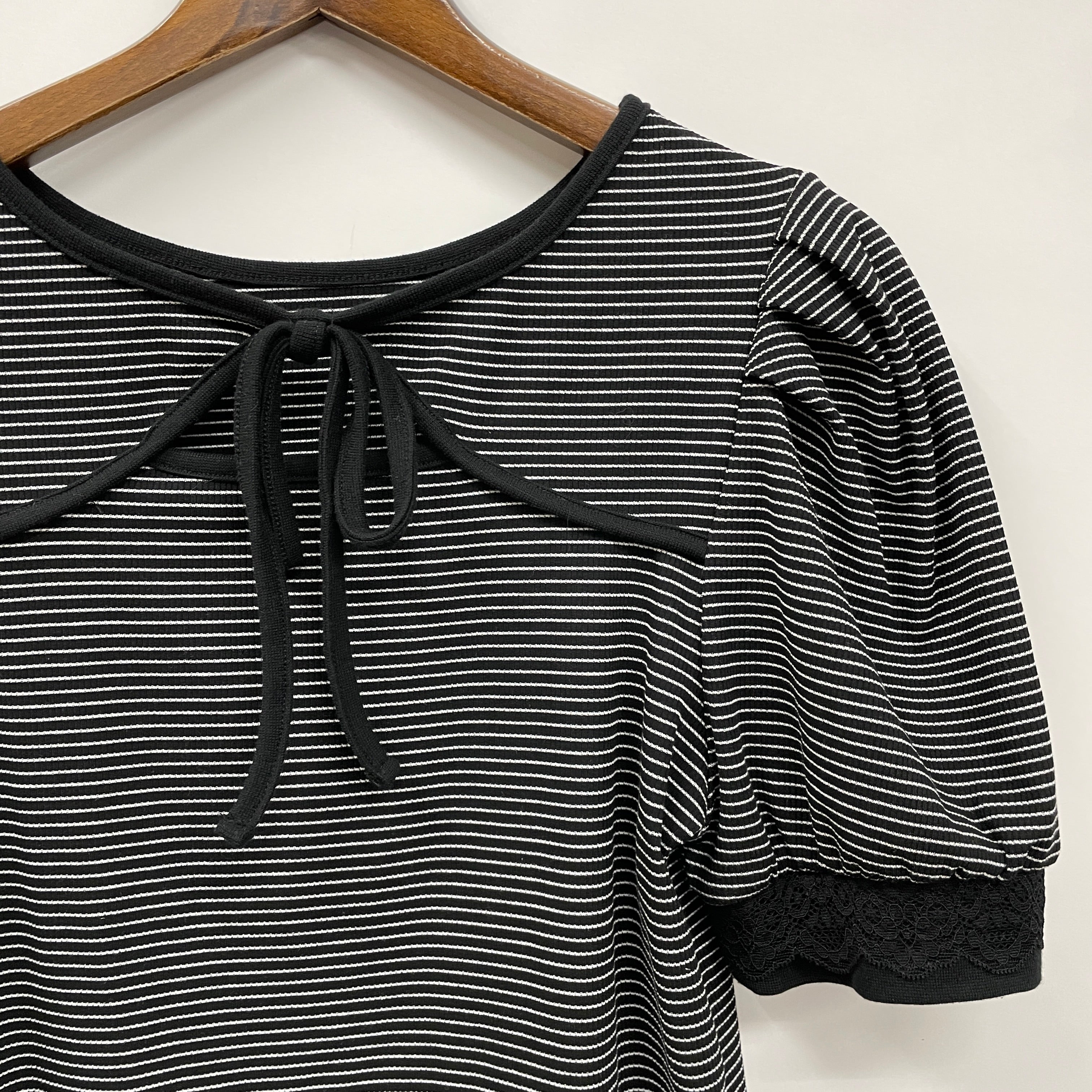 すっきりとしたクルーネックと、フェミニンなリボンデザインが楽しめます。