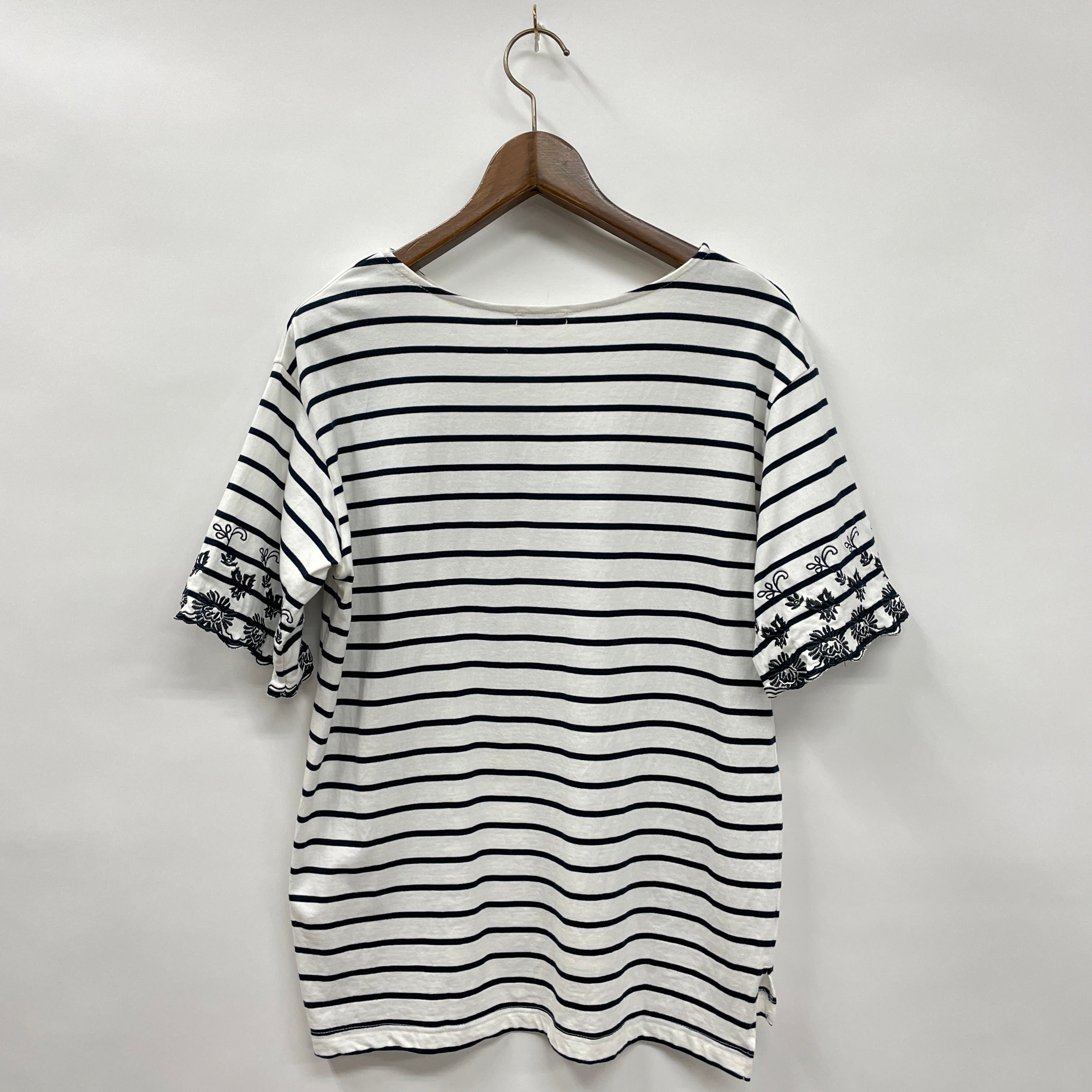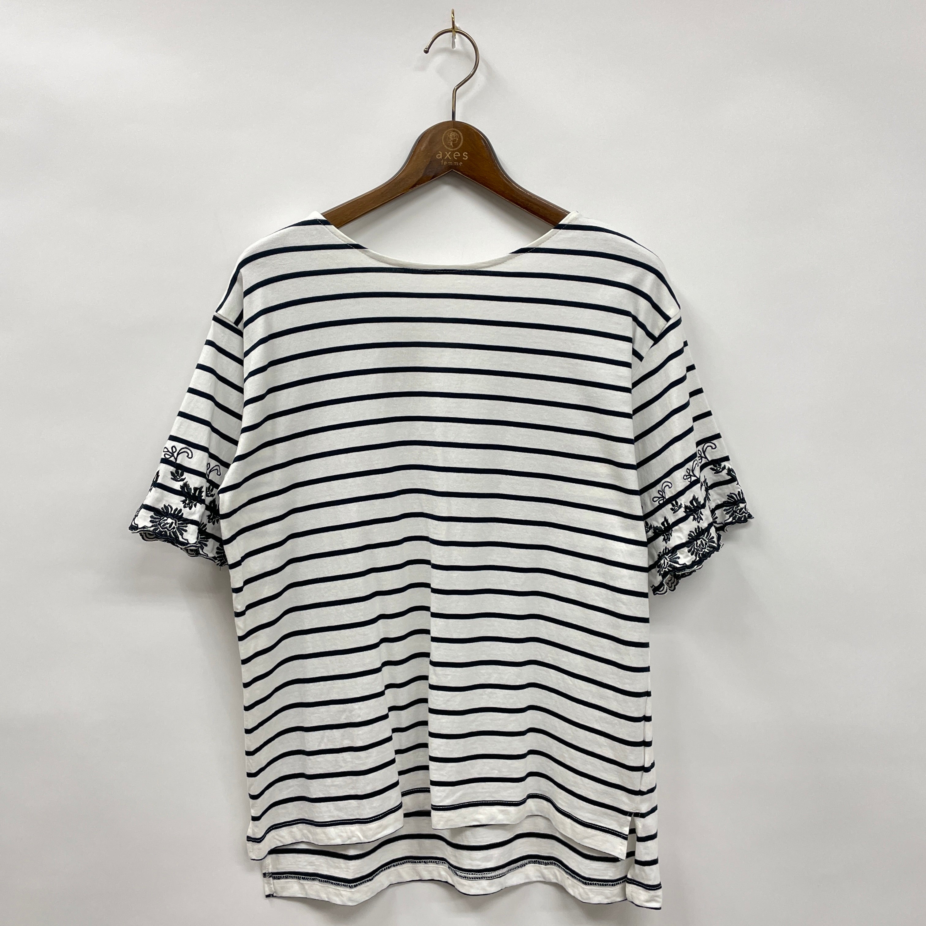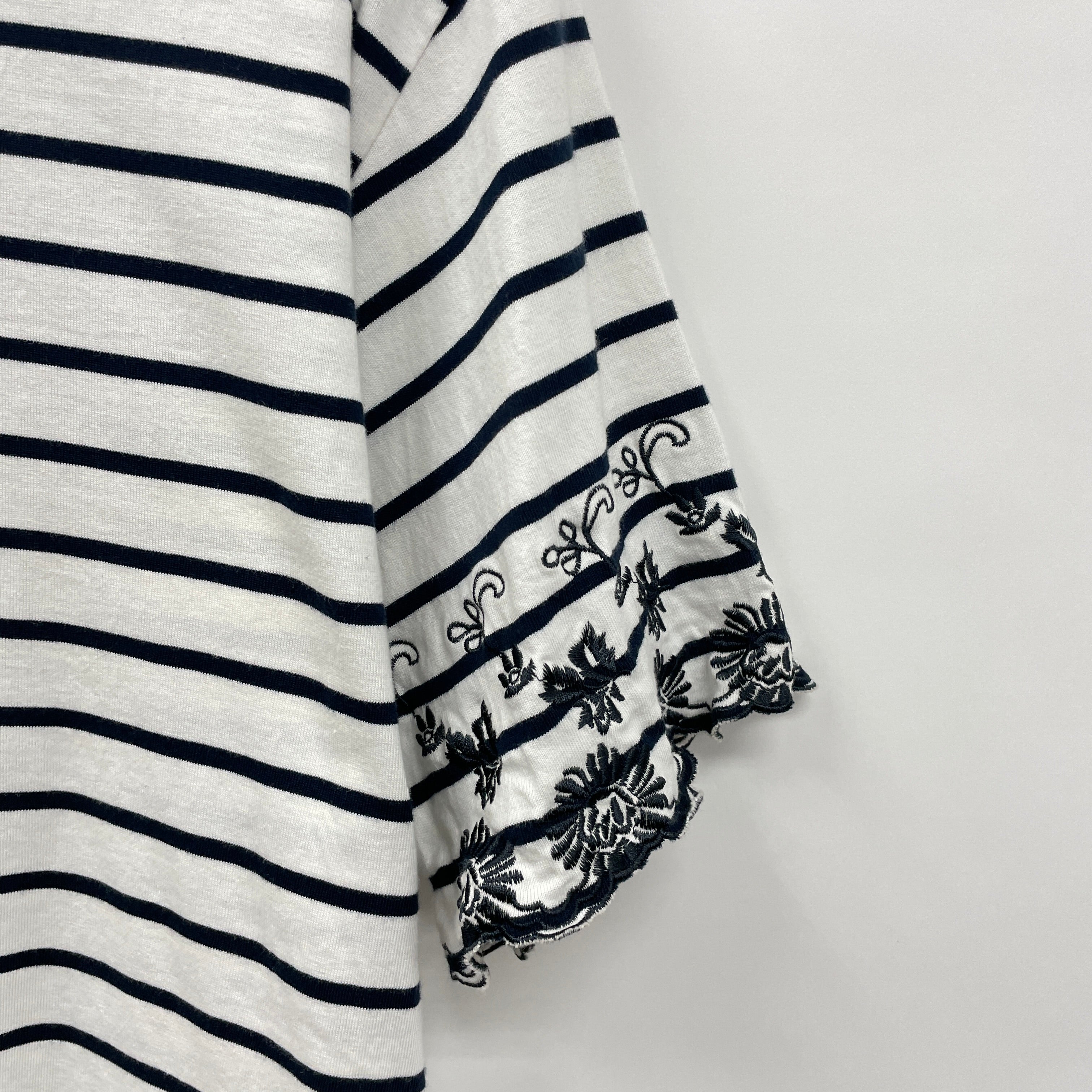 袖口を縁取るように施された花刺繍がポイントのTシャツです。