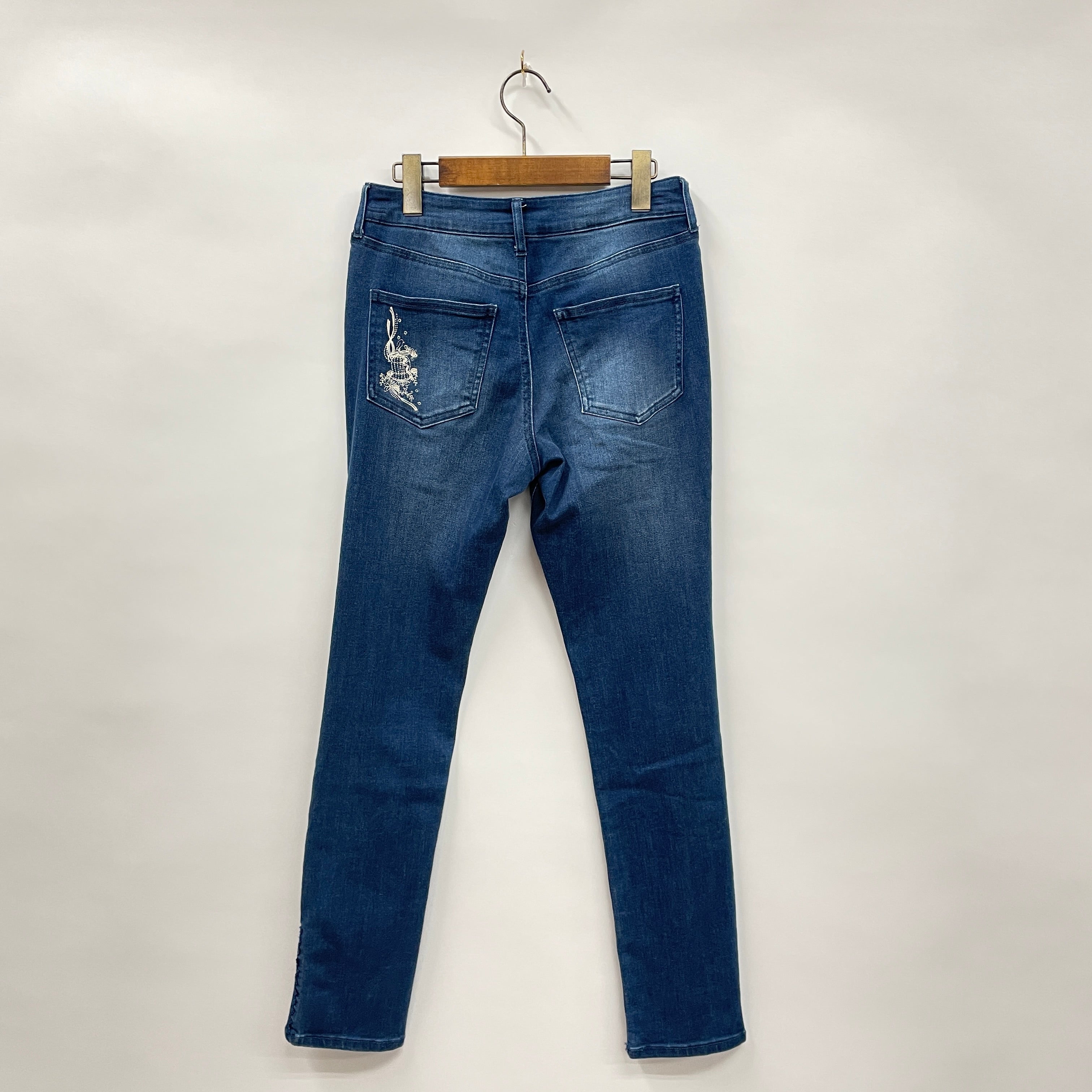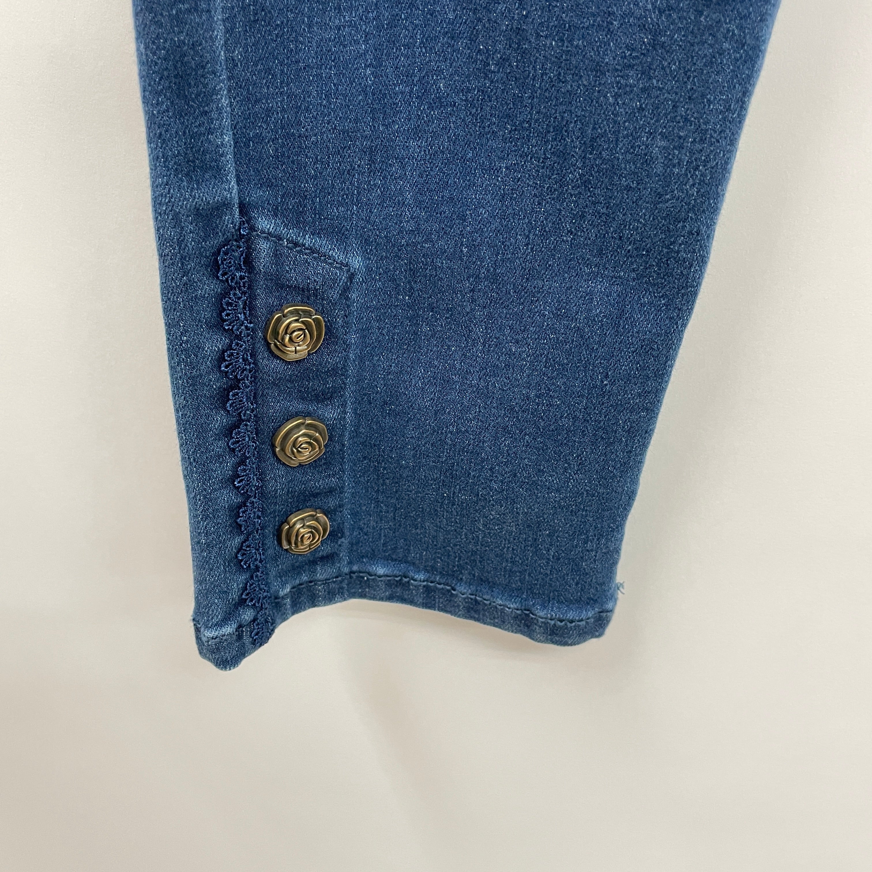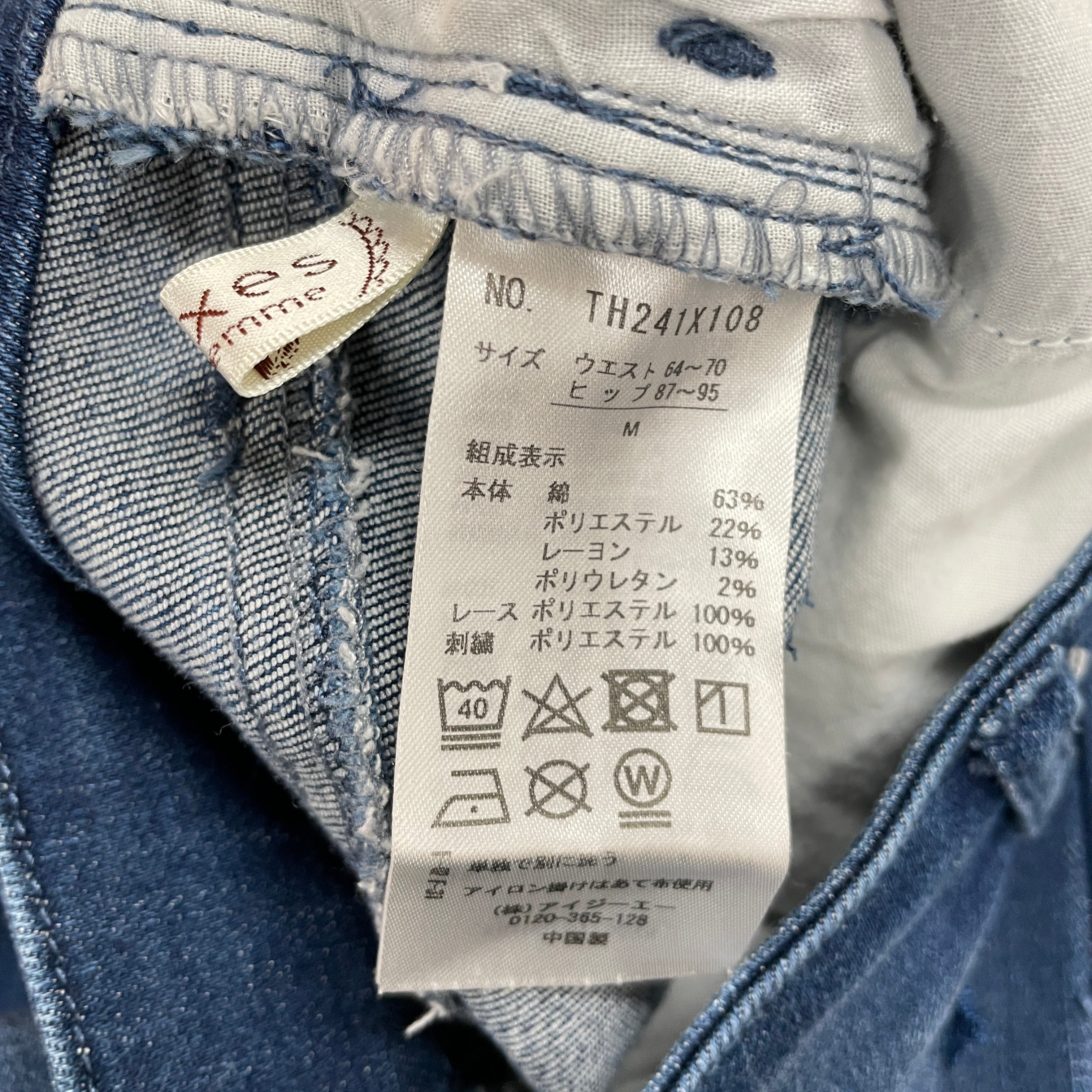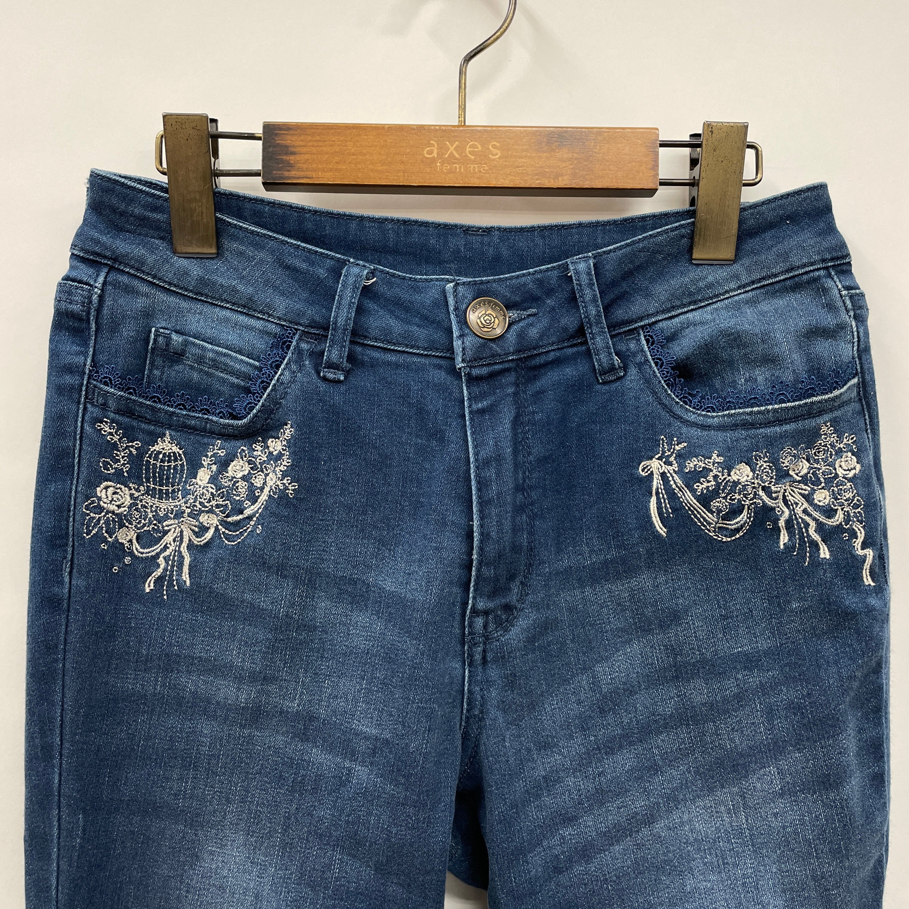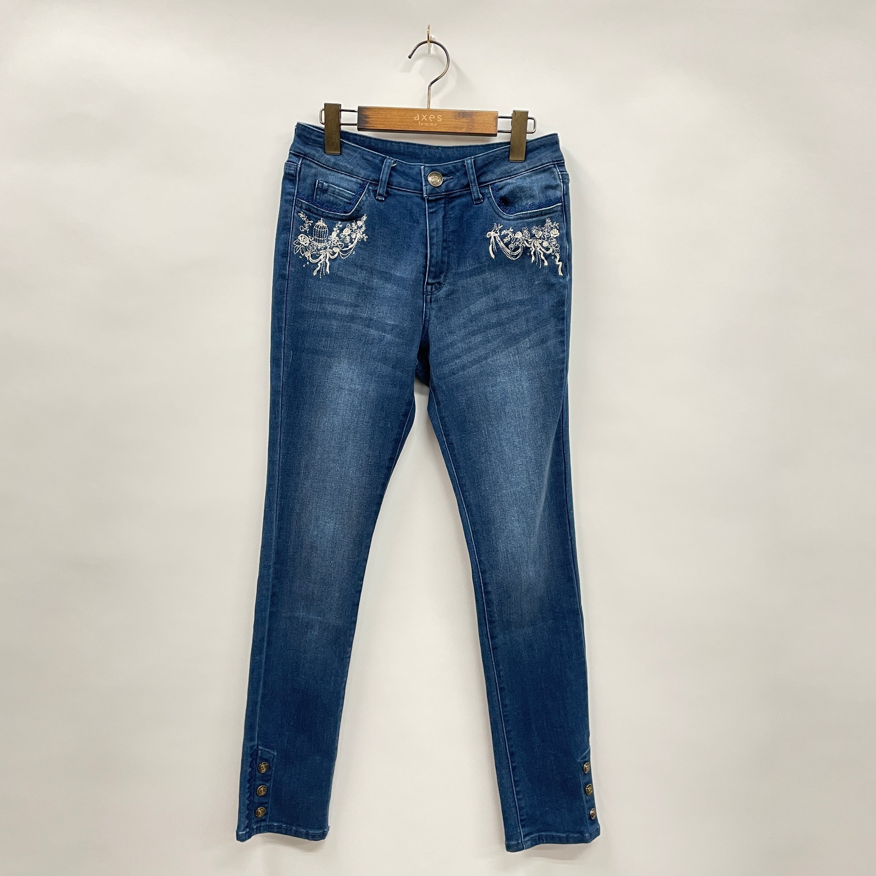 ストレッチ素材で履きやすい、定番のデニムパギンスです。花と鳥かごの刺繍があしらわれています。チュニックなど丈の長いトップスと合わせても、裾の連ボタンデザインが見えるアイテムです。