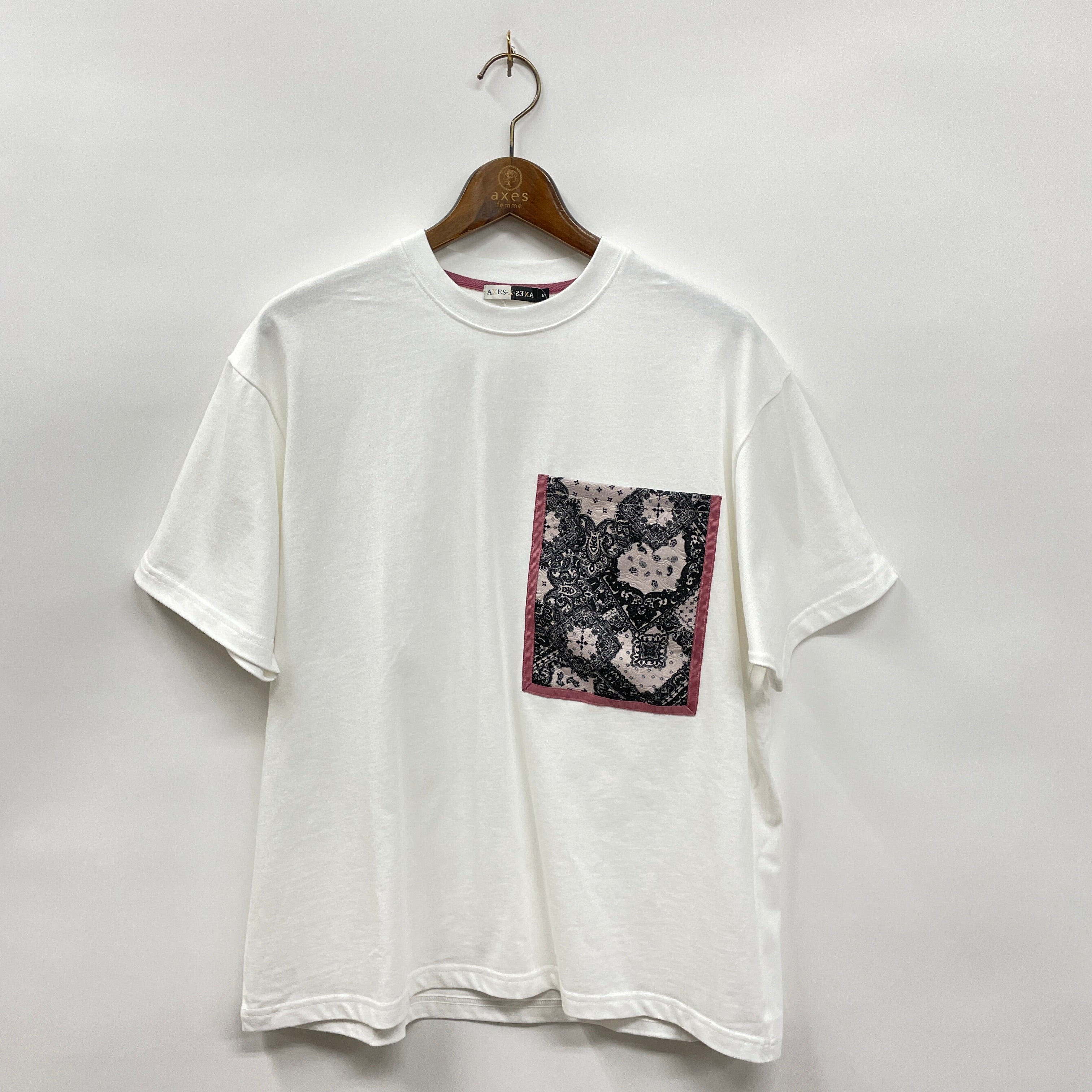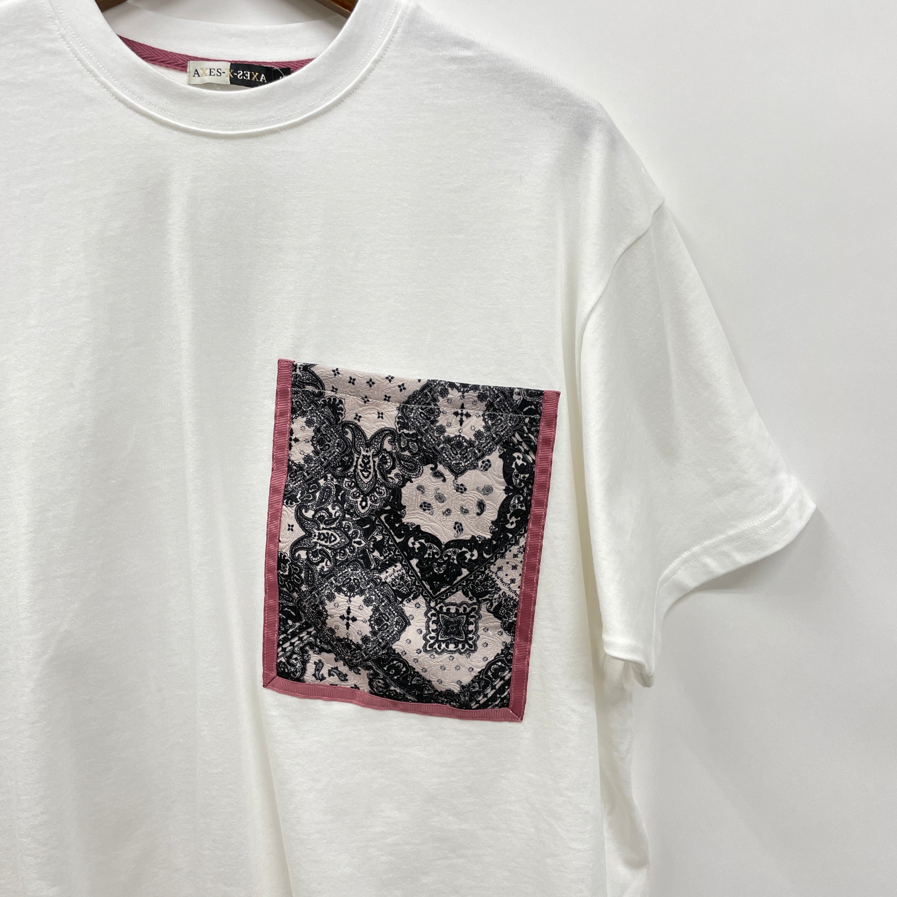 ゆったりとしたシルエットのTシャツです。表面変化のあるジャガードを下地にアラベスク風のオリジナルオリエンタル柄をポケットに施し、ポケット縁をアクセントカラーでトリミングさせてエッジを利かせたTシャツに仕上げました。<br><br>ショートパンツとの連動コーデもしやすいアイテムになっております。