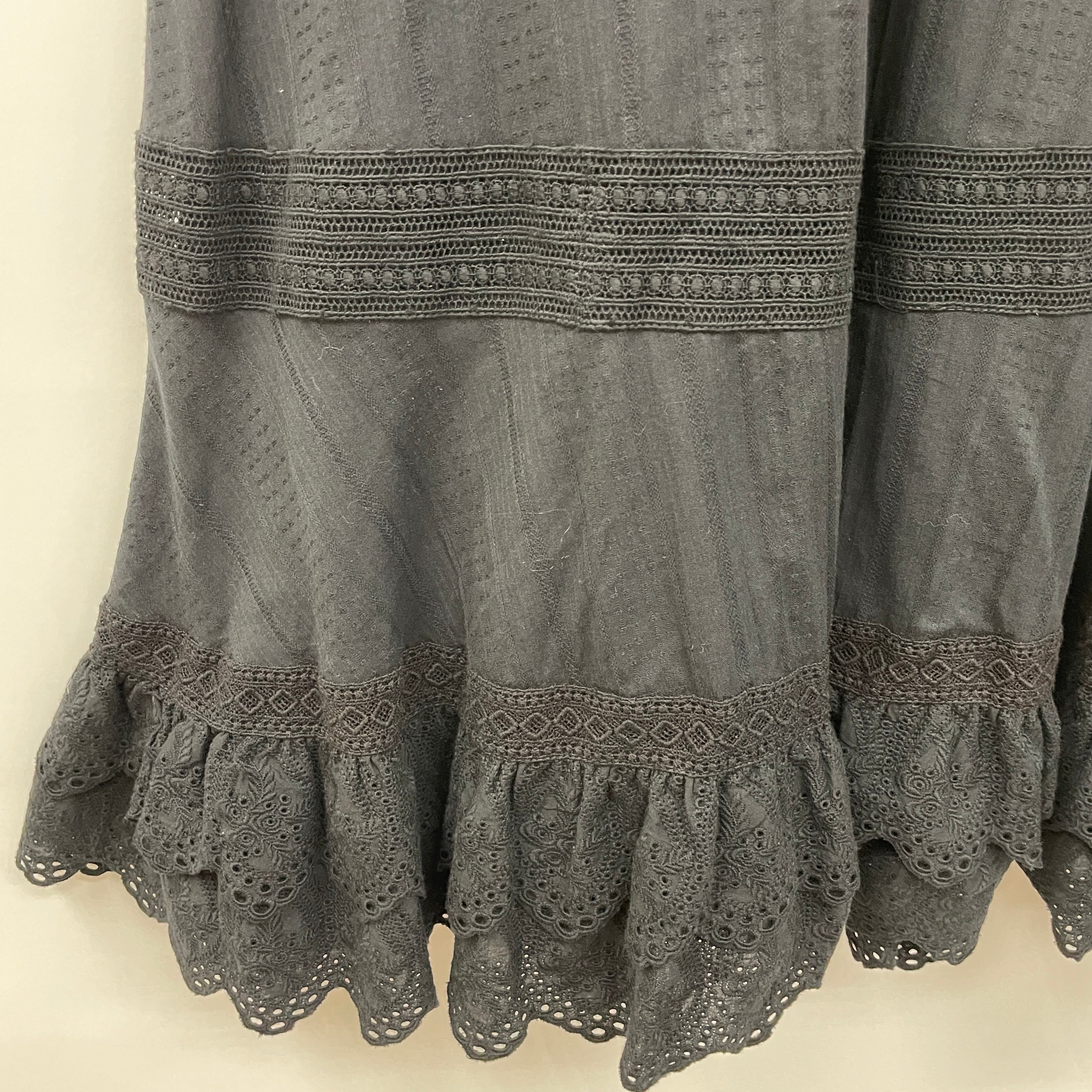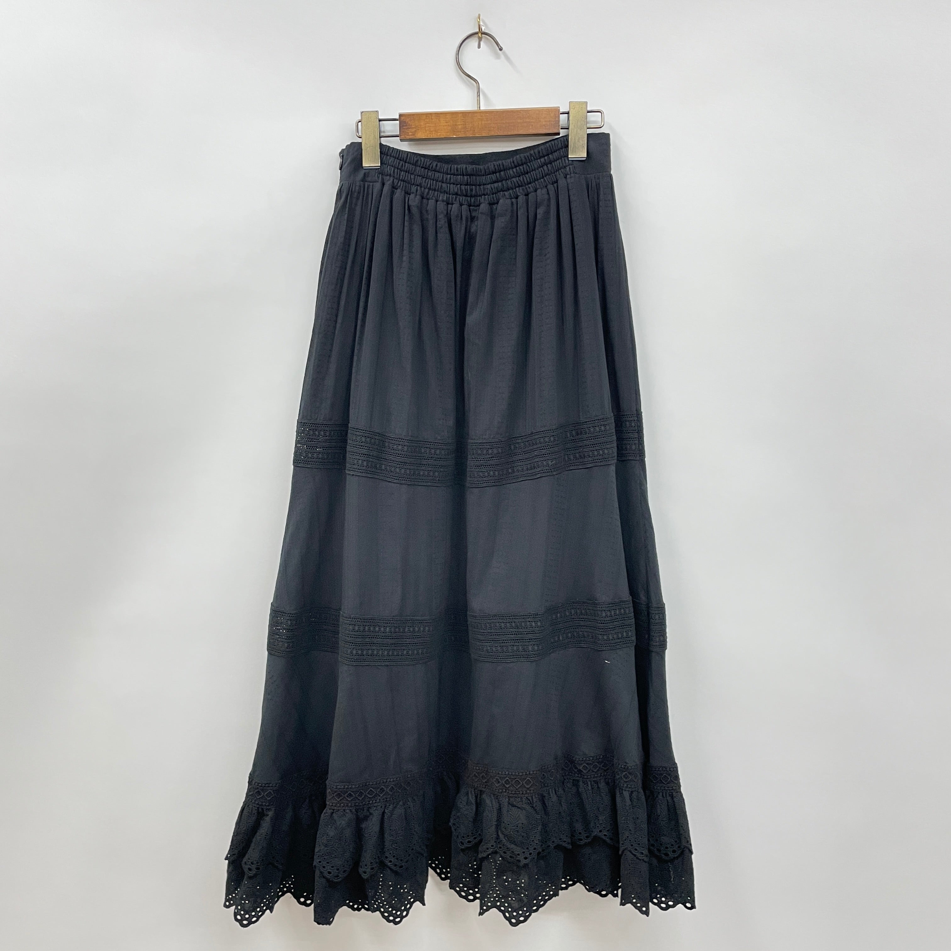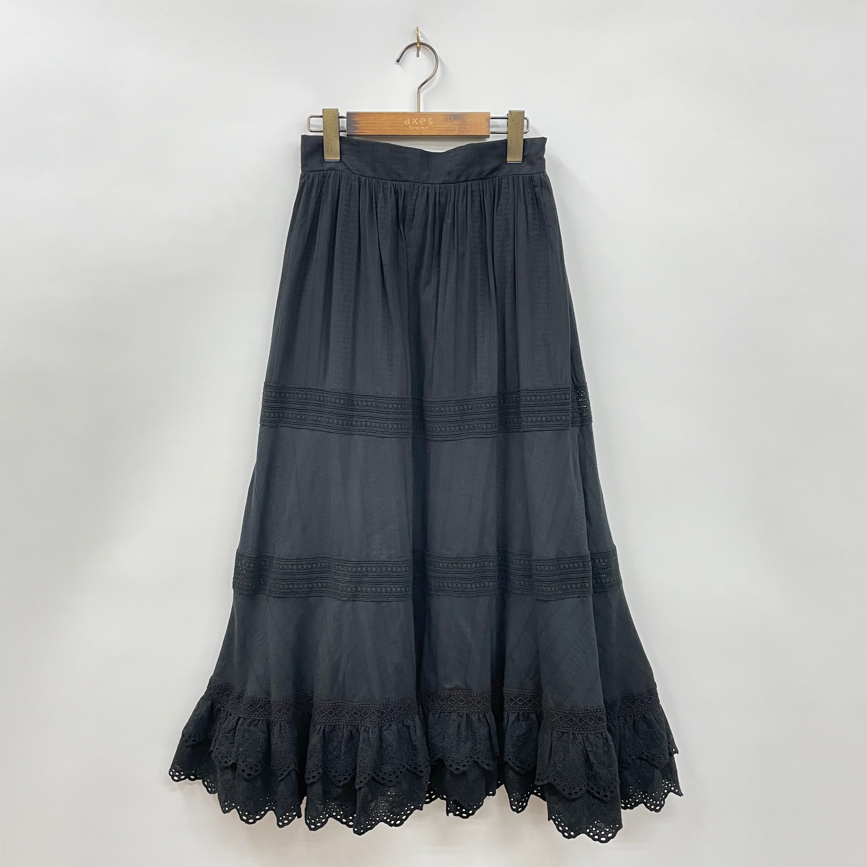 コットン風の織柄生地に、繊細なレースを贅沢にあしらったロングスカートです。