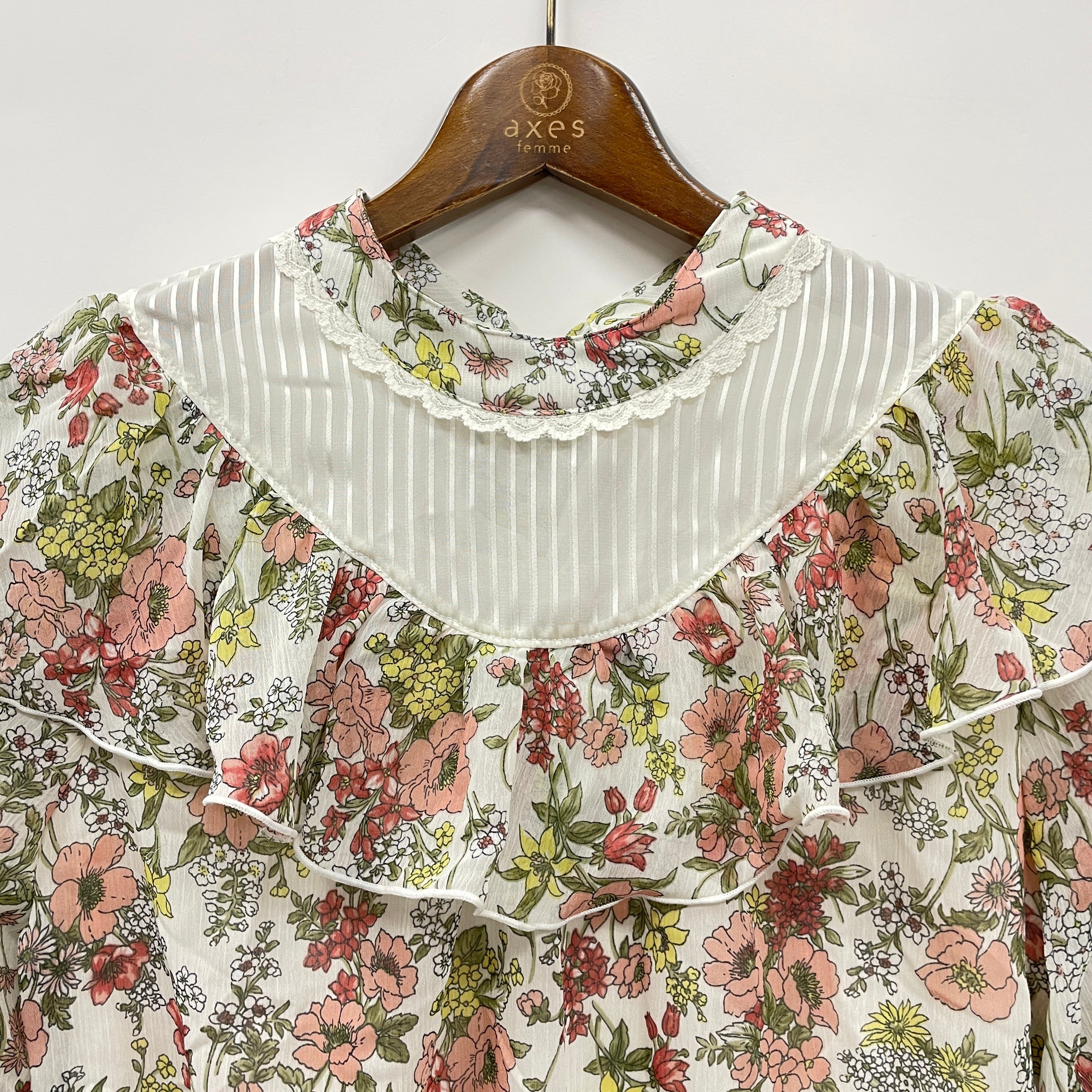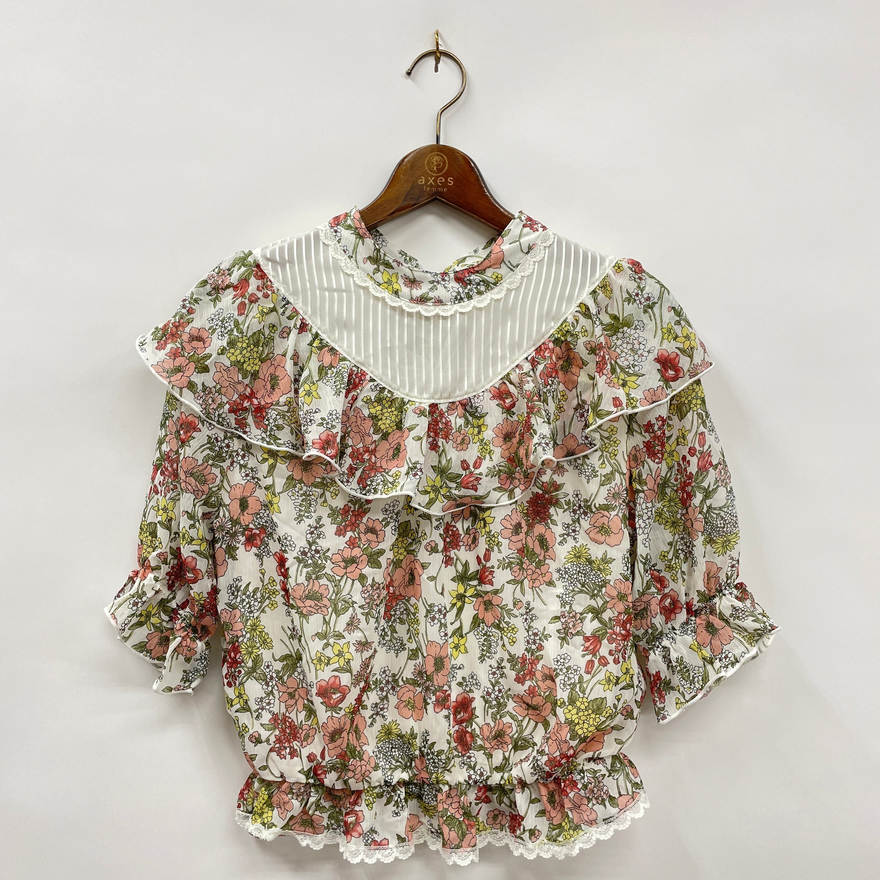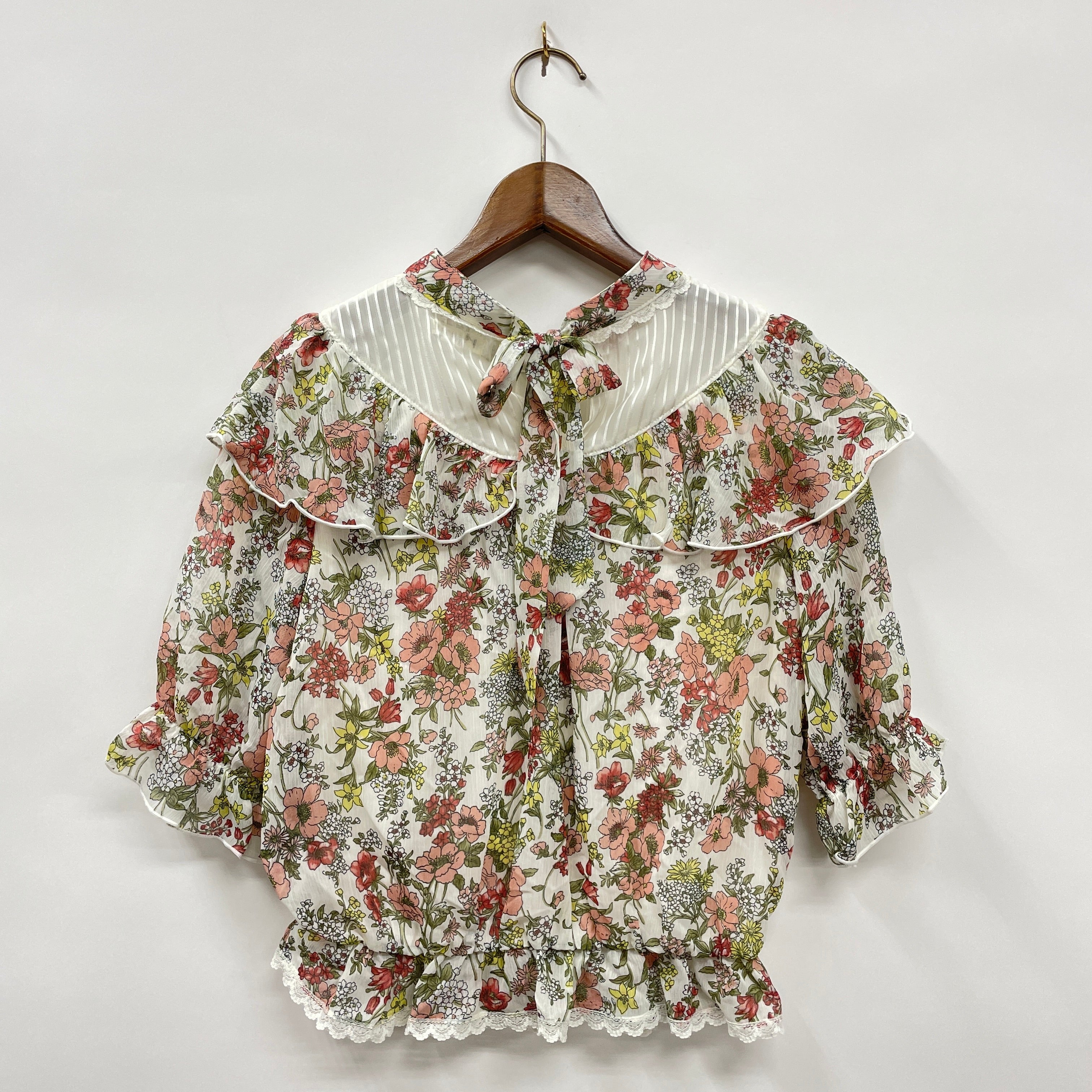 バックリボンがかわいいブラウス。シロ・クロは花柄、アワピンクは無地でご用意しております。ウエストゴムでスタイルアップ効果も。