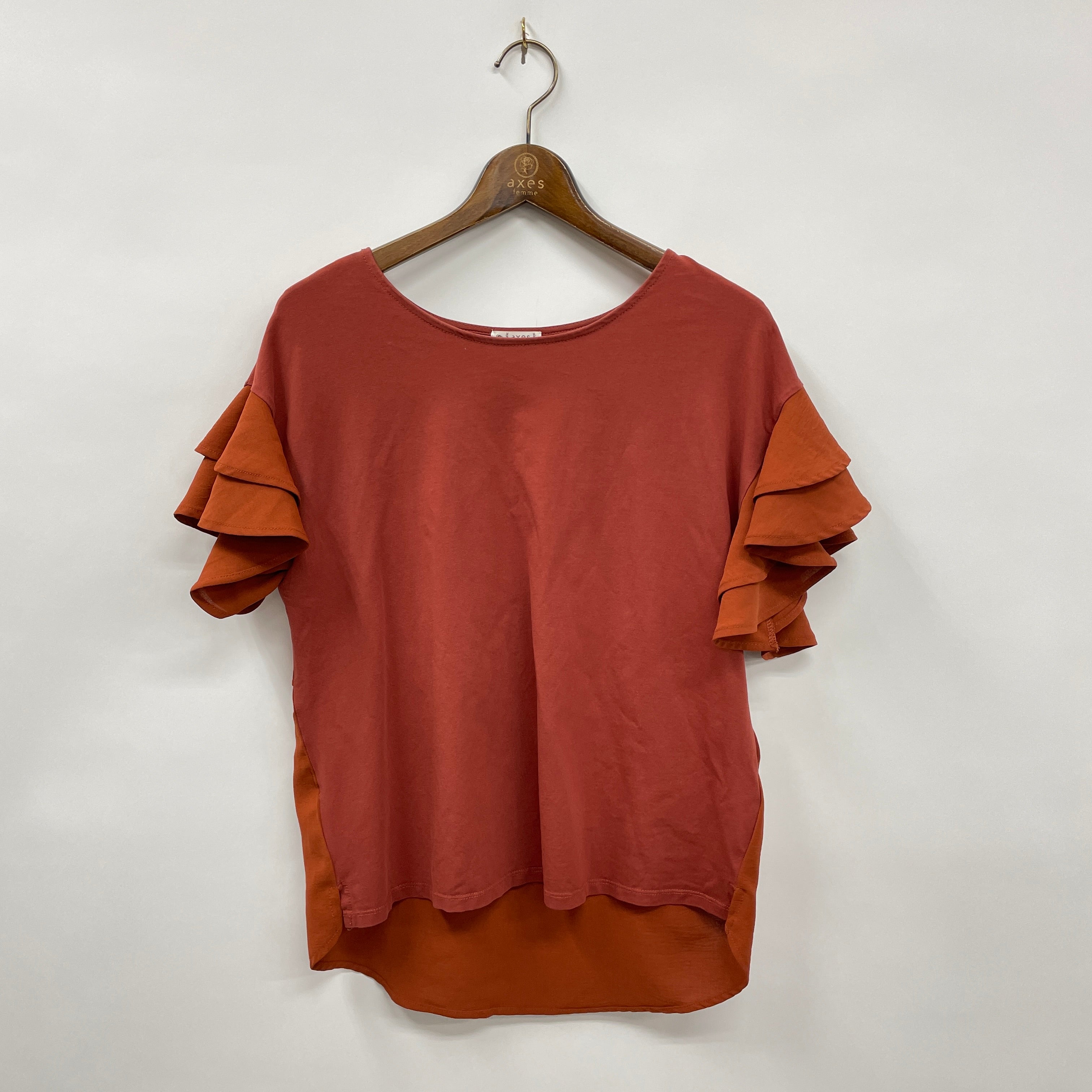 袖とバックの素材切替と、ボリューム感のあるフリルのシルエットが綺麗なトップスです。軽くてサラッとした着心地の良いカット素材をメインに使用しており、涼しく着られるアイテムです。ゆったりとしたシルエットなので、体系カバーも◎ネックレス付きなので胸元も華やかになります。