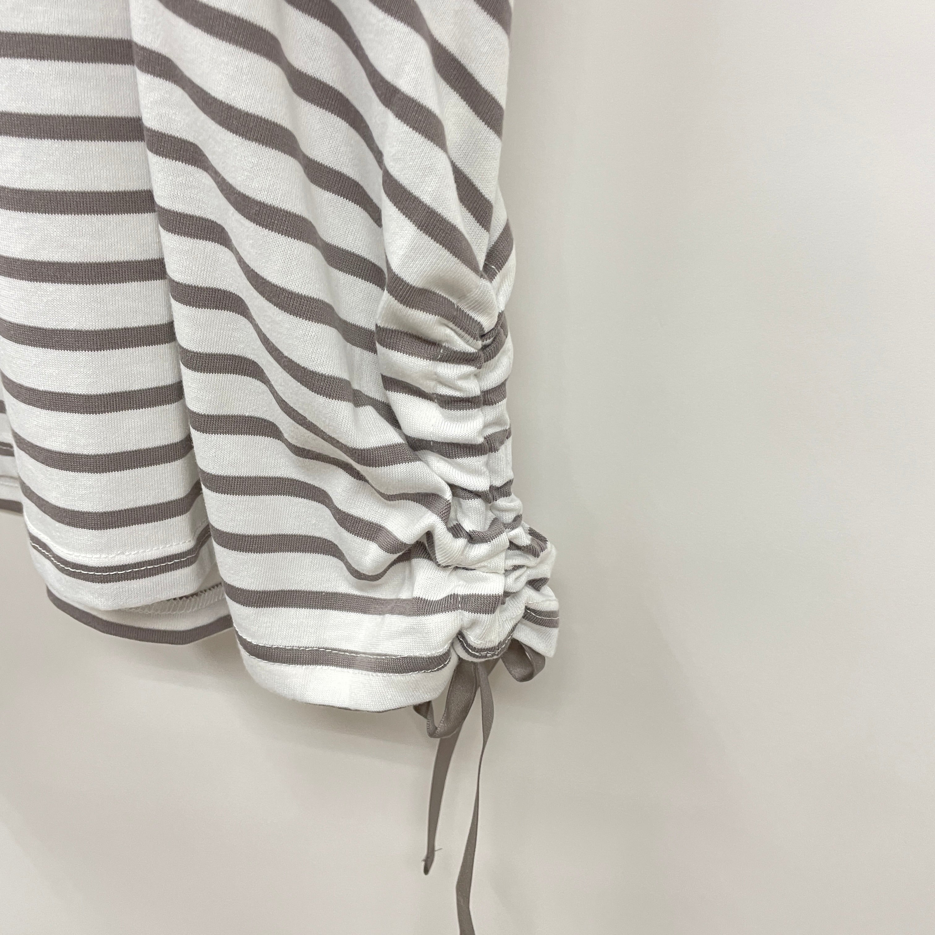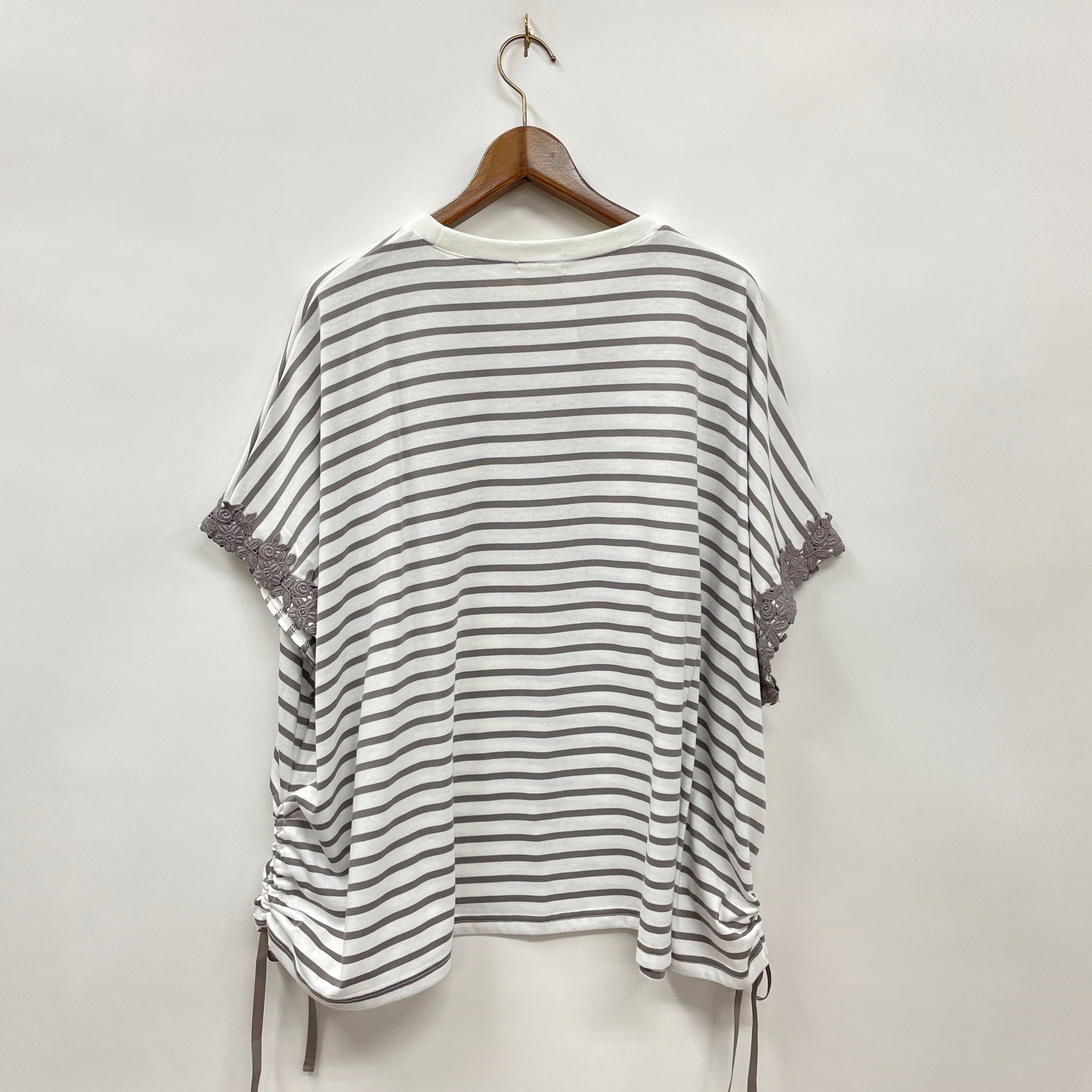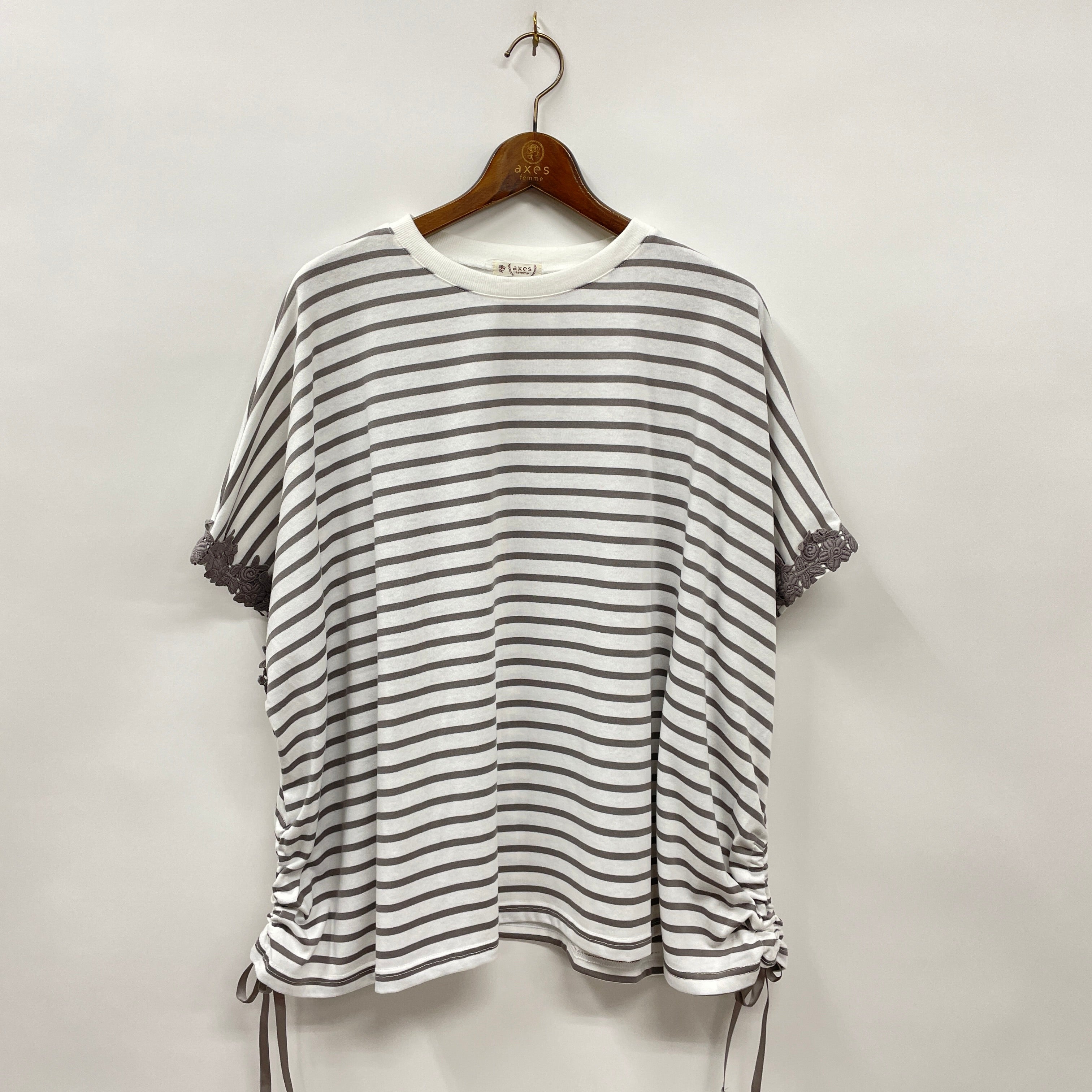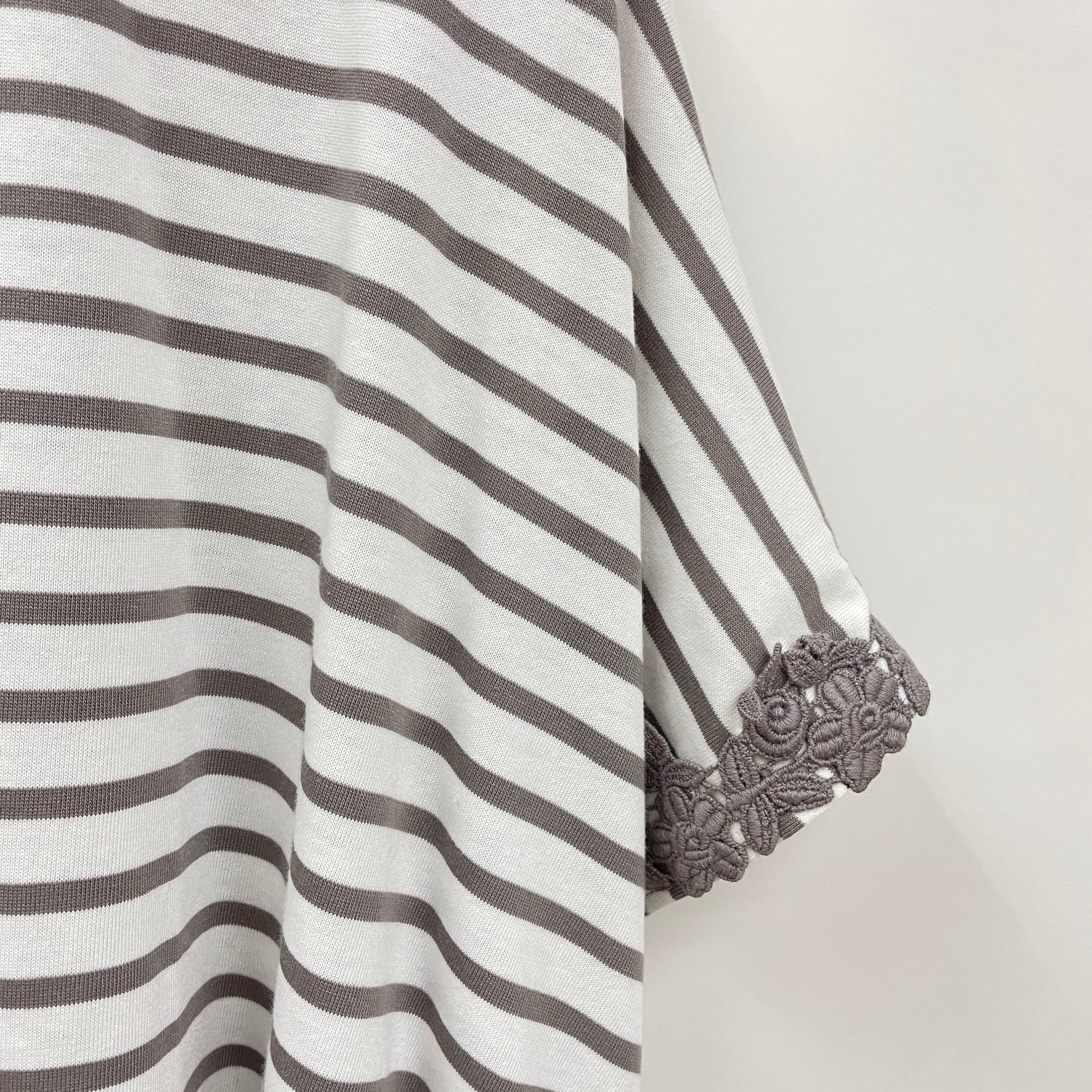 大人カジュアルな細めのボーダー柄に、袖口を飾るモチーフレースがポイント。
