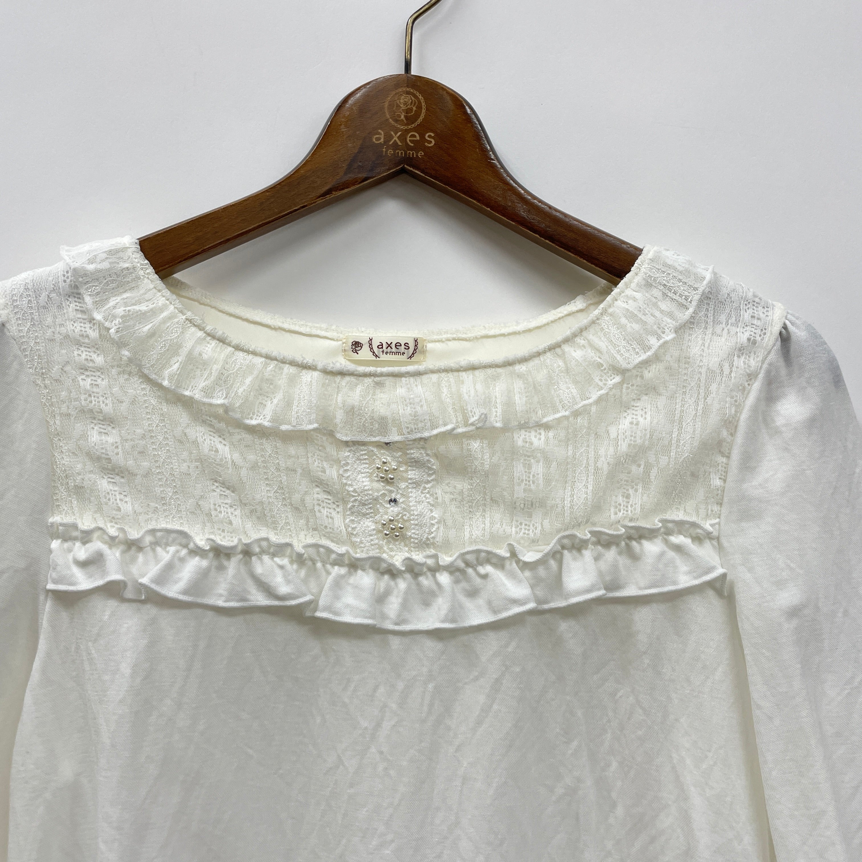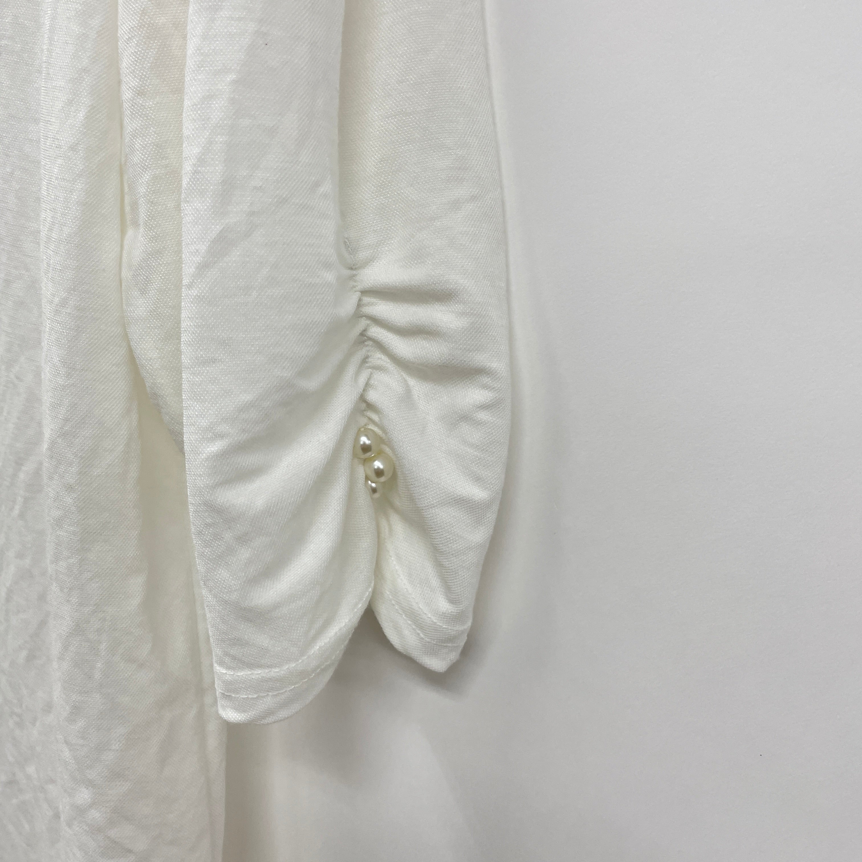 トレンド感のある袖口ギャザーのデザインに、首元の手付パールや袖口のパール使いが上品見えする一枚です。