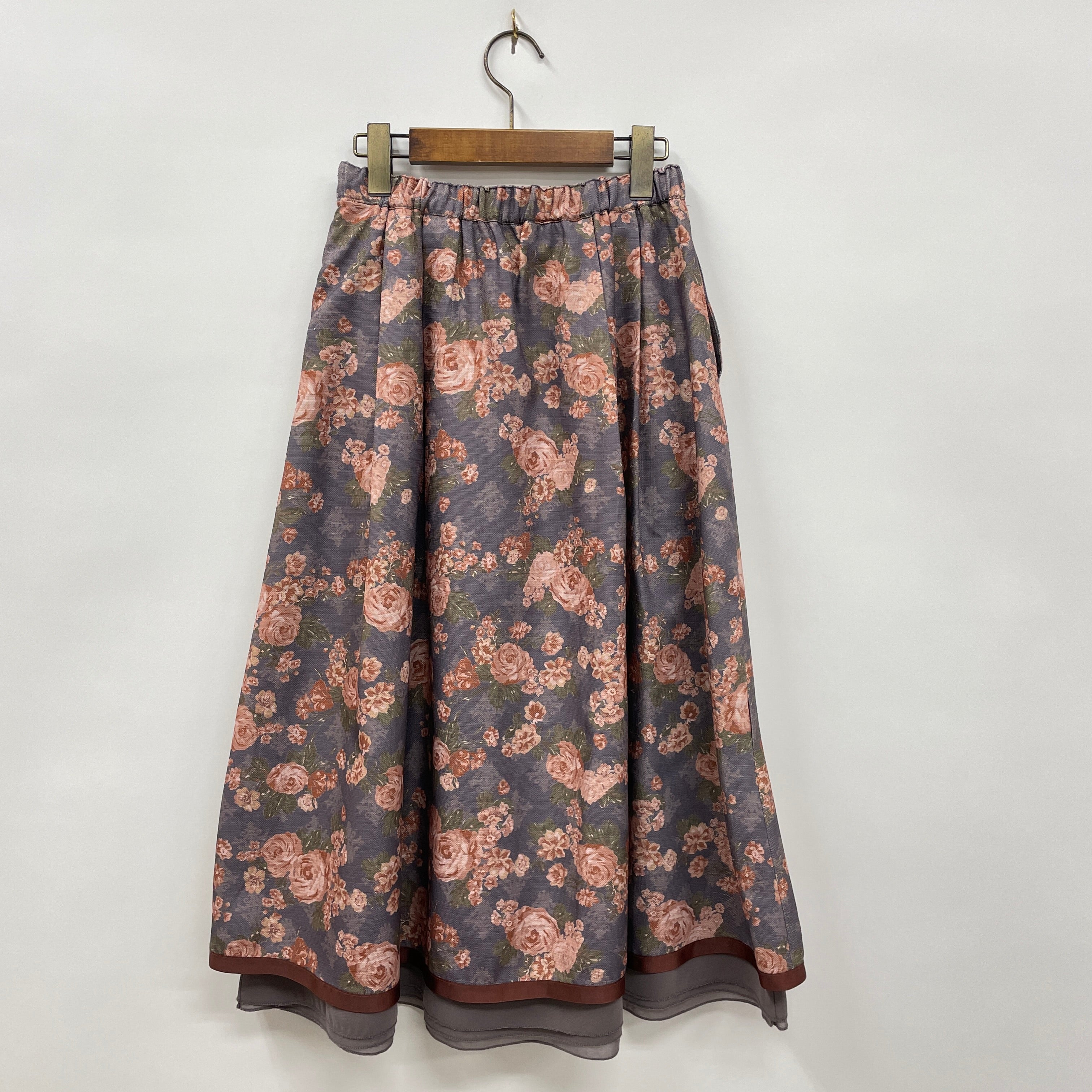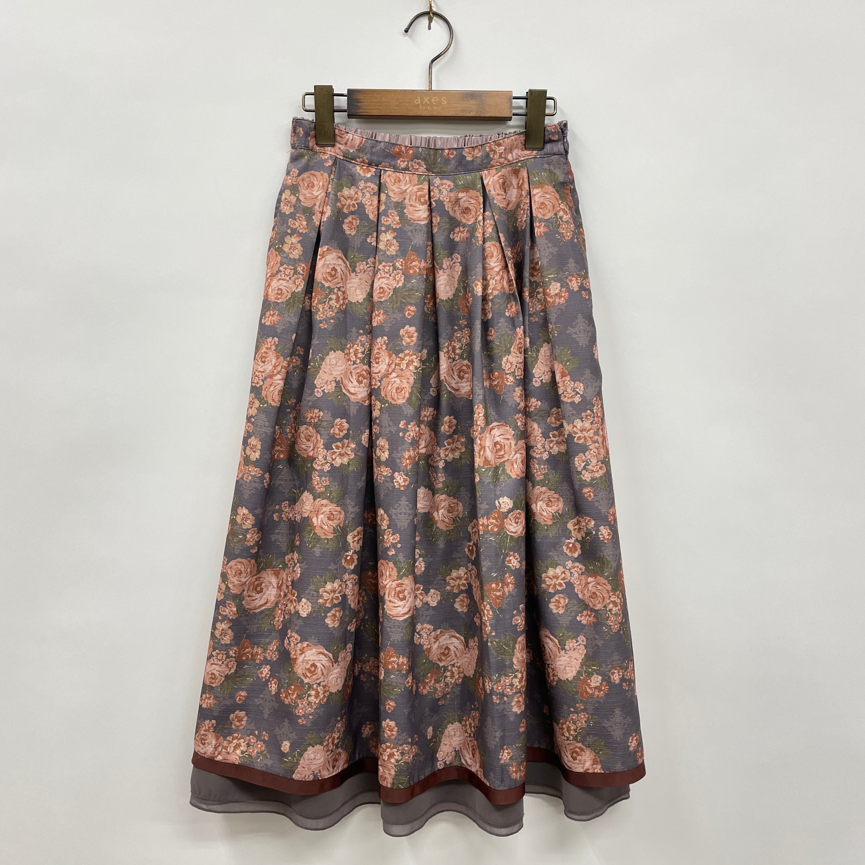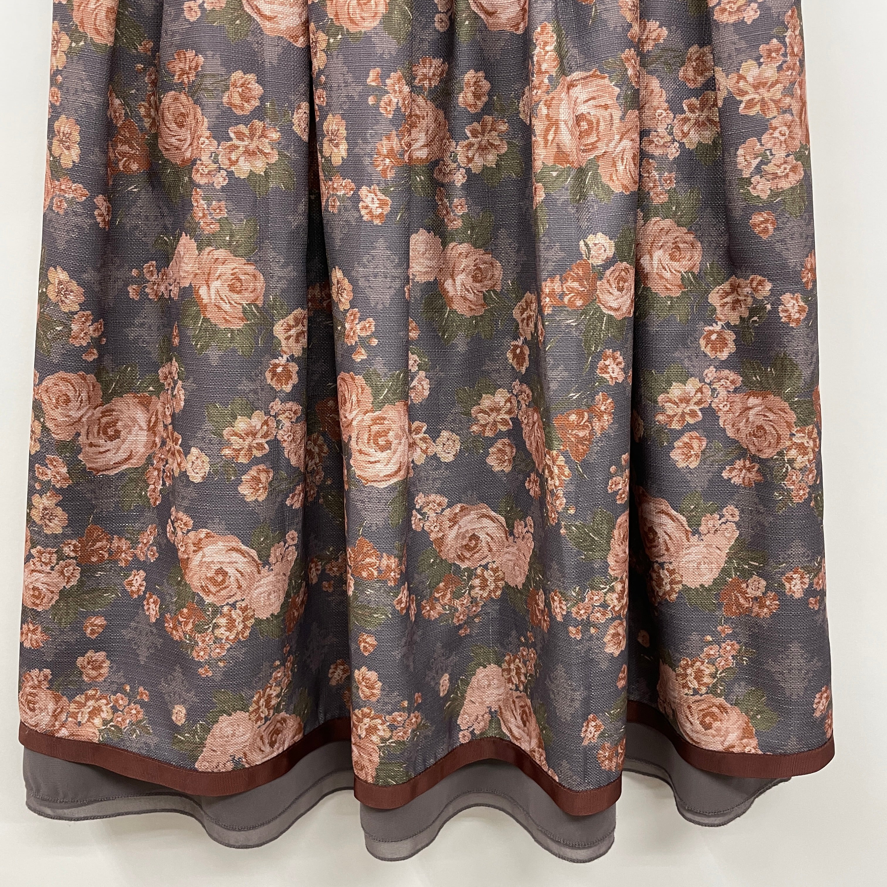 ヴィンテージ感のあるオリジナルのフラワープリントのタックスカートです。裾の配色グログランテープがアクセントになり、裾から見えるシフォンのフリルで上品に着こなせます。ウエスト後ろをゴム仕様にして穿き心地の良さにもこだわりました。