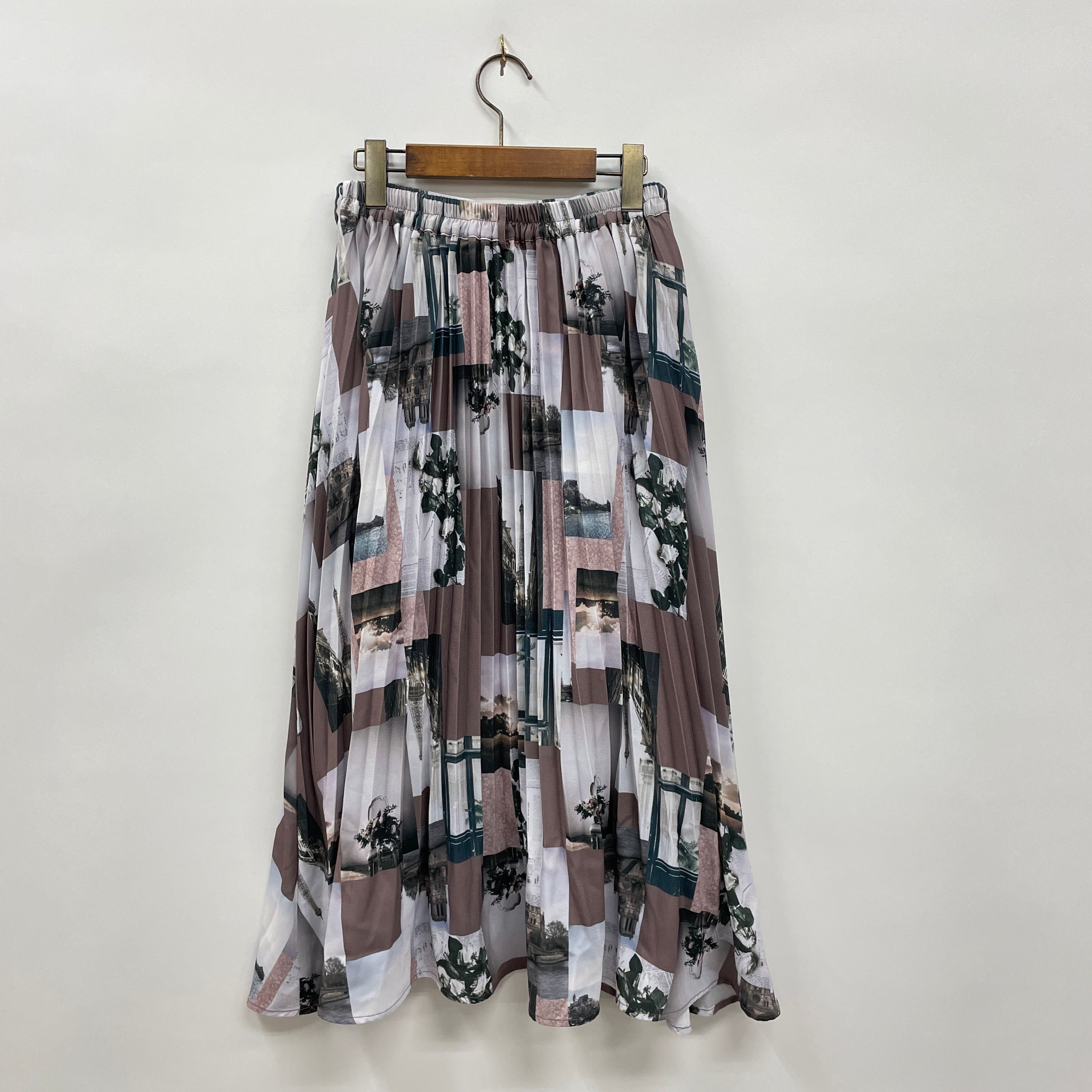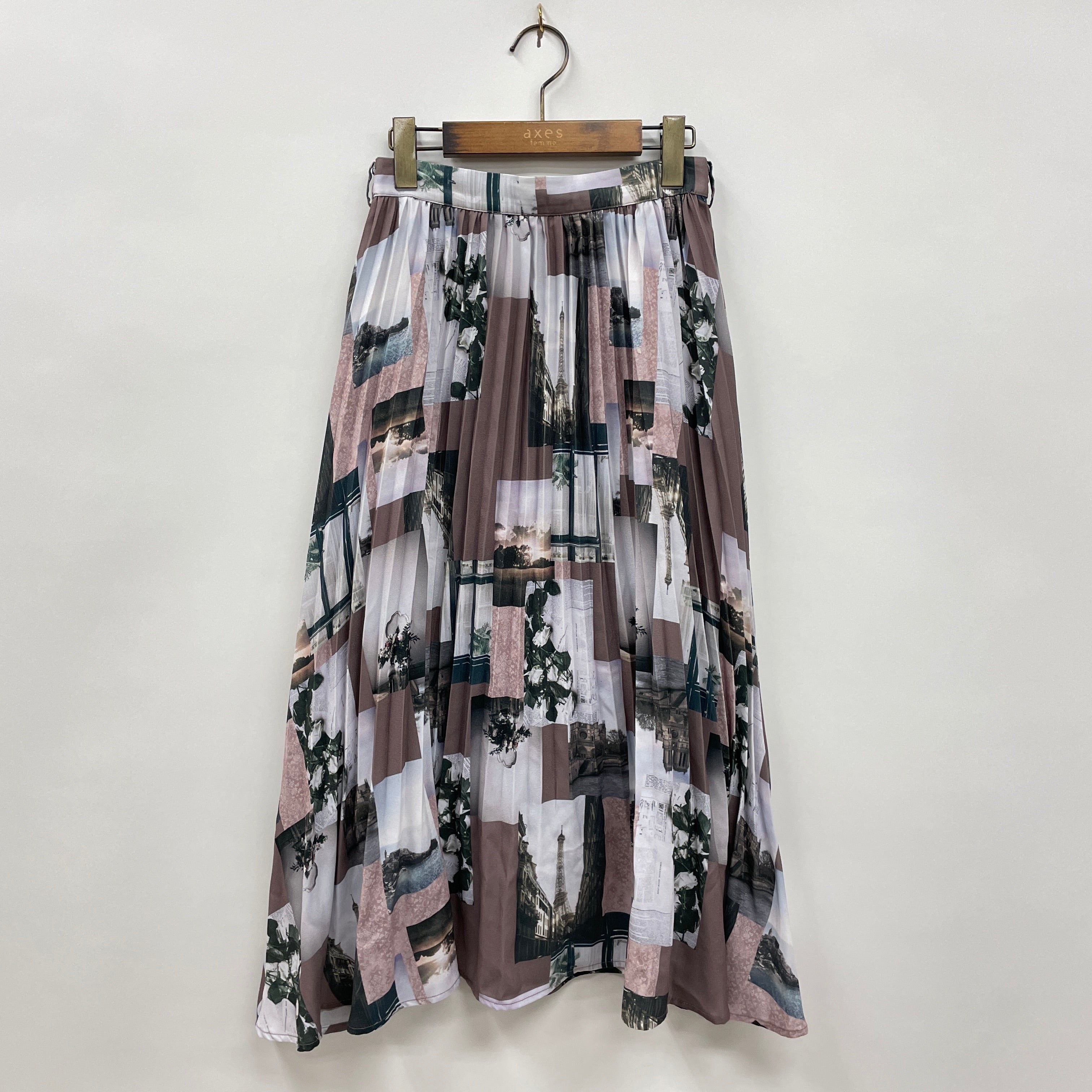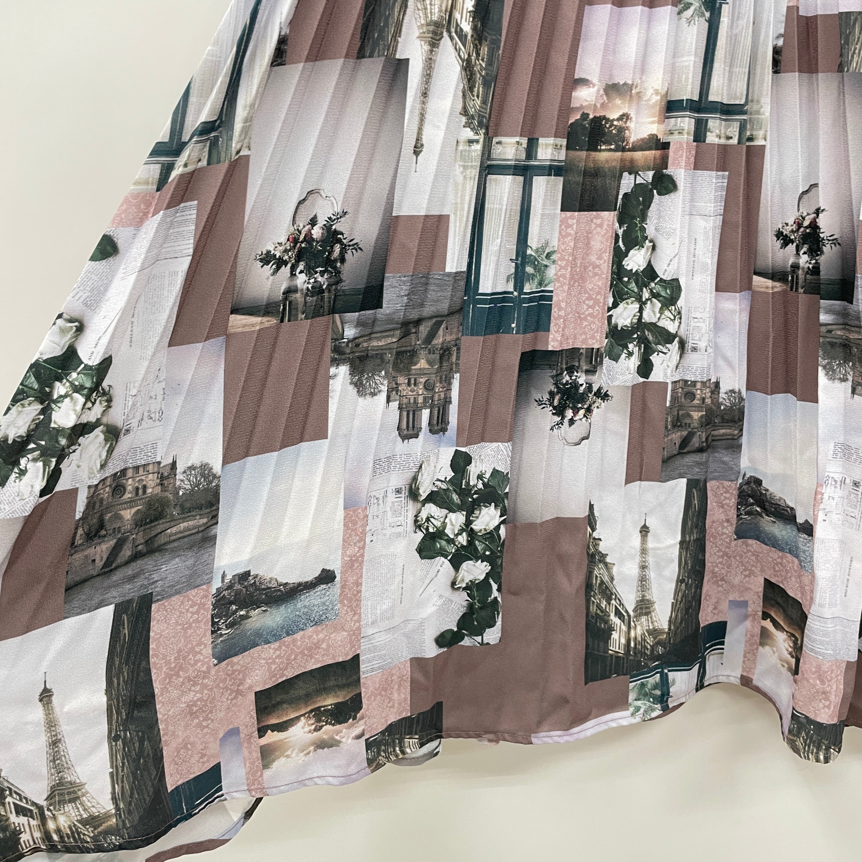 花や街並みなどのコラージュプリントが、モードな雰囲気溢れるスカートです。