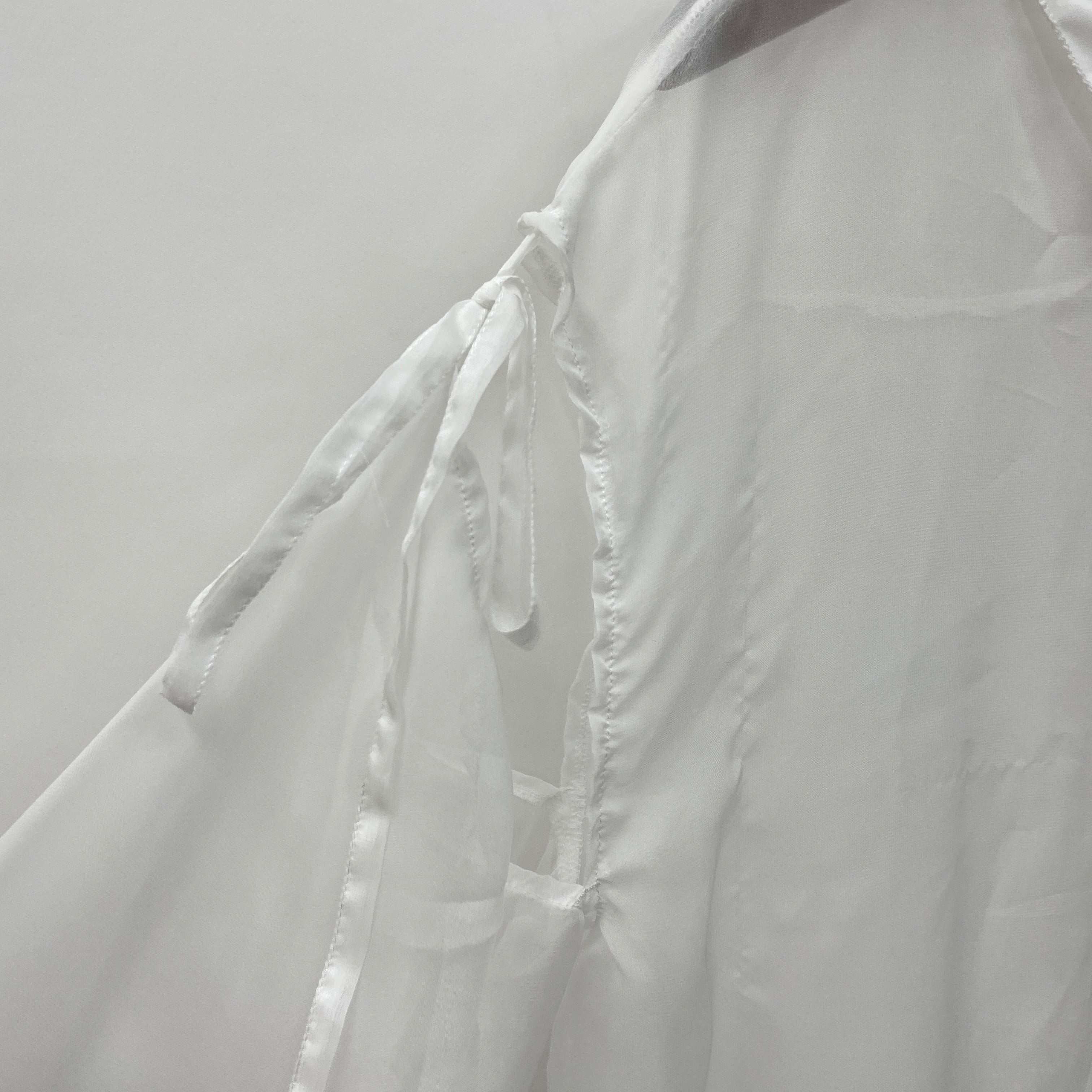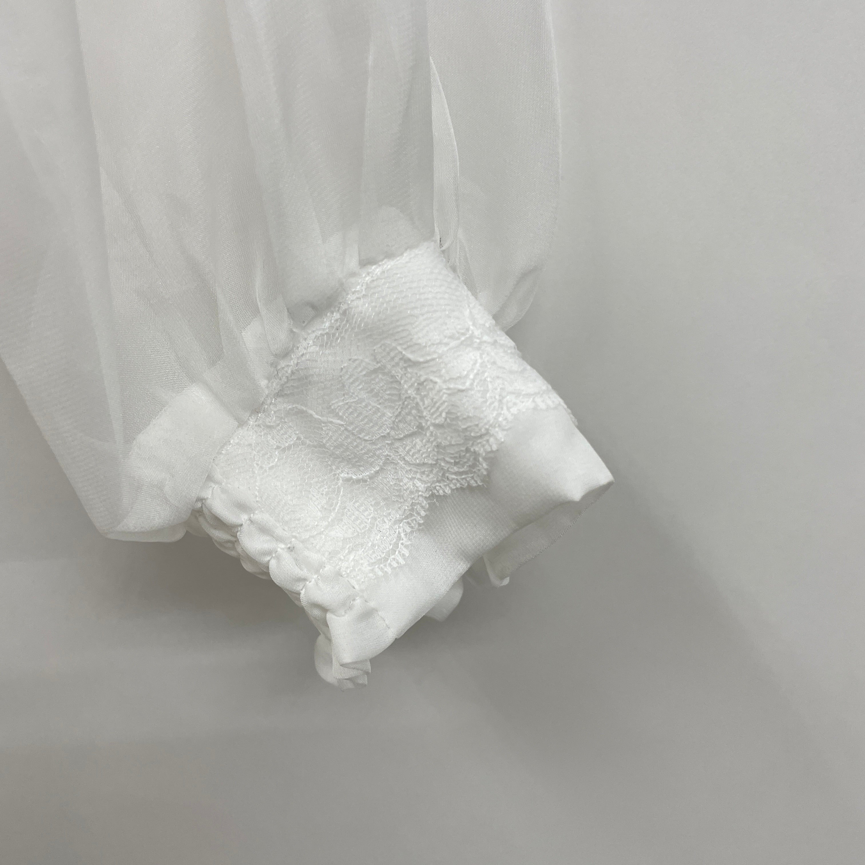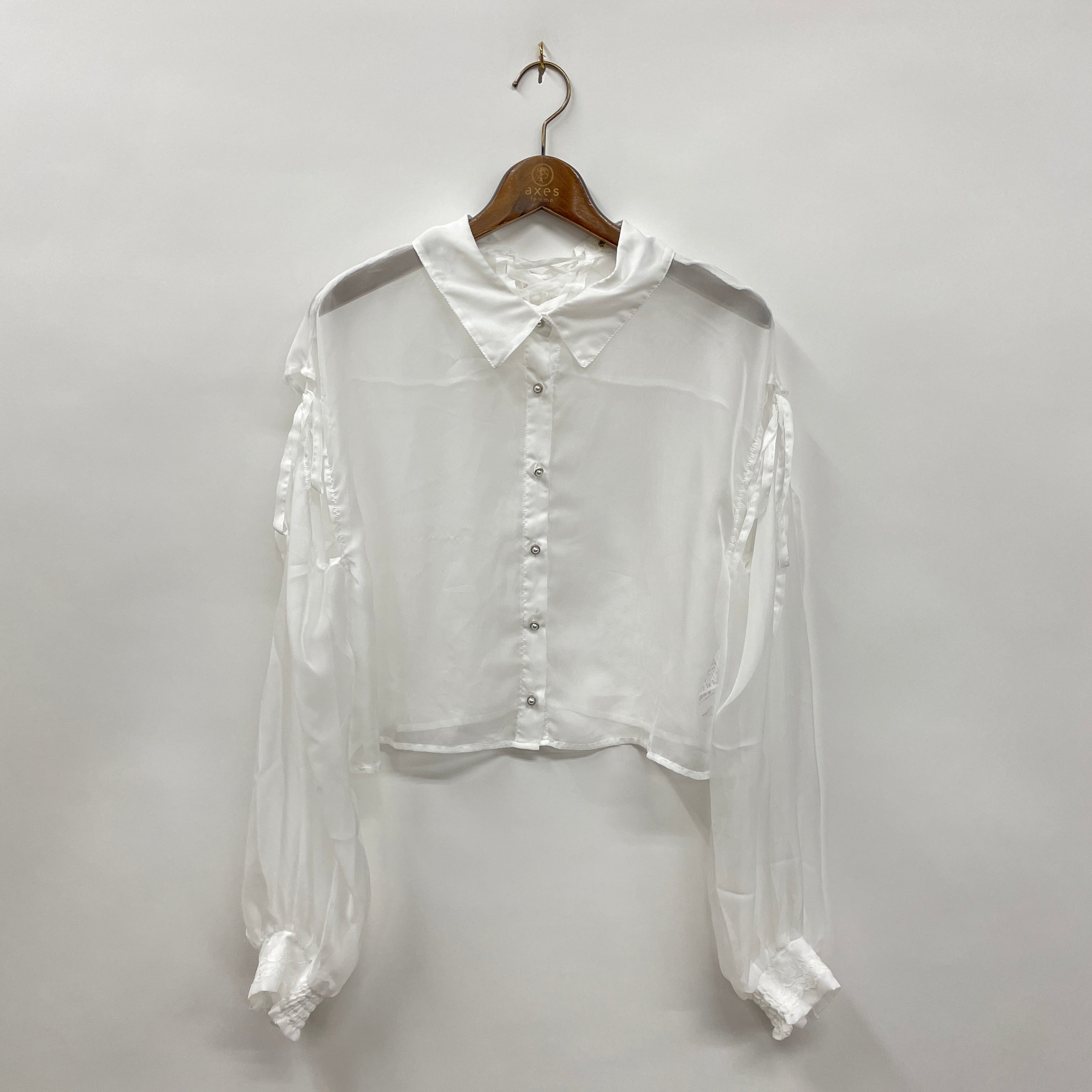 肩開きのデザインがトレンドライクなシアーシャツ。