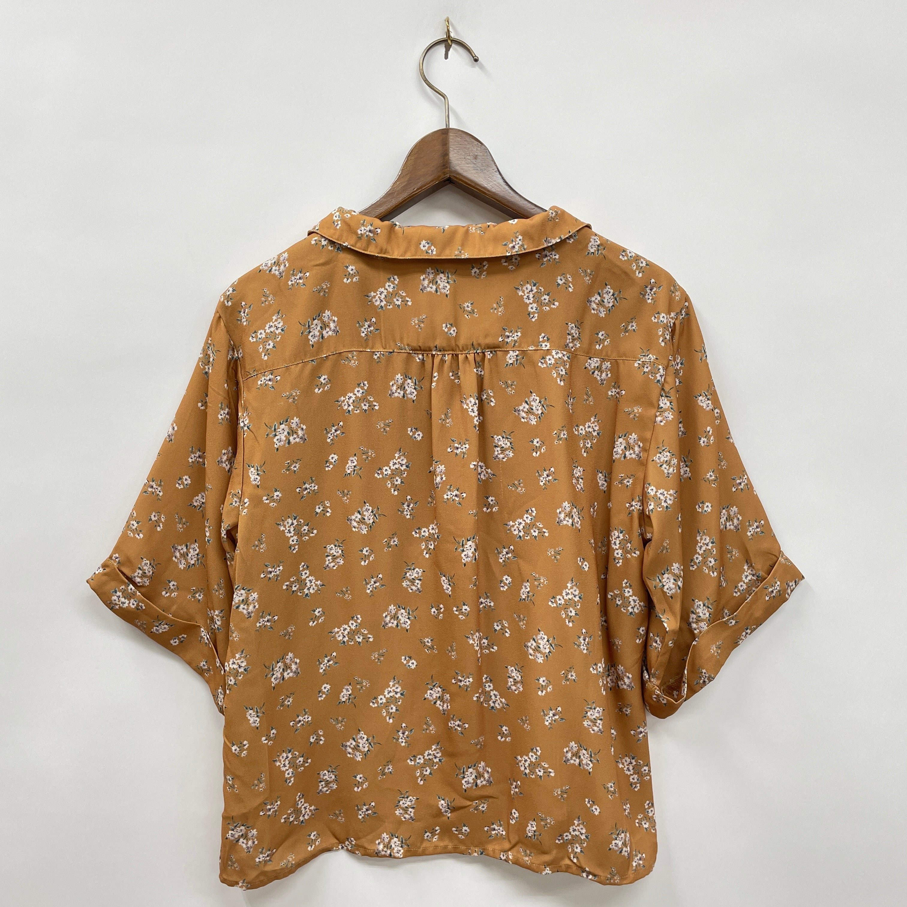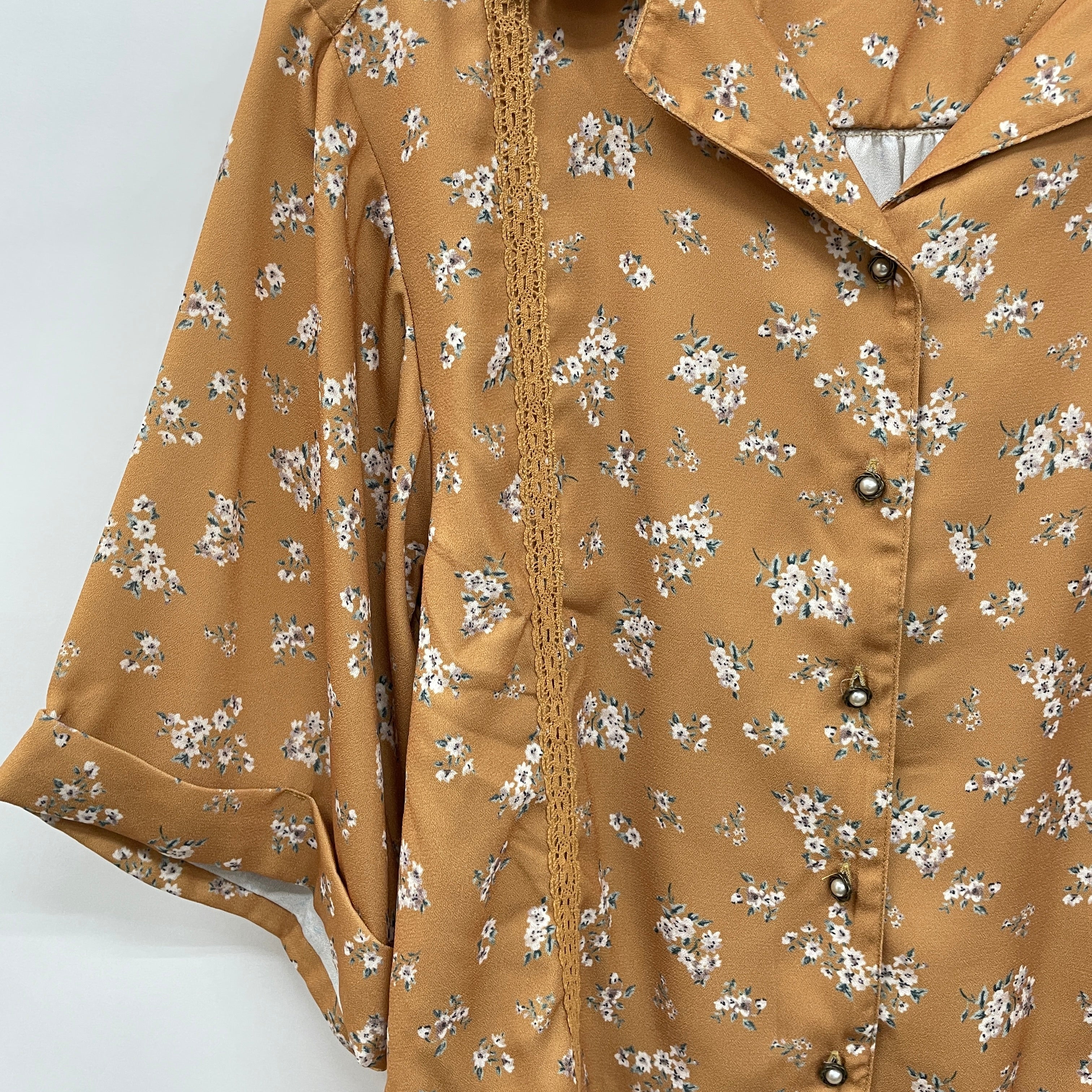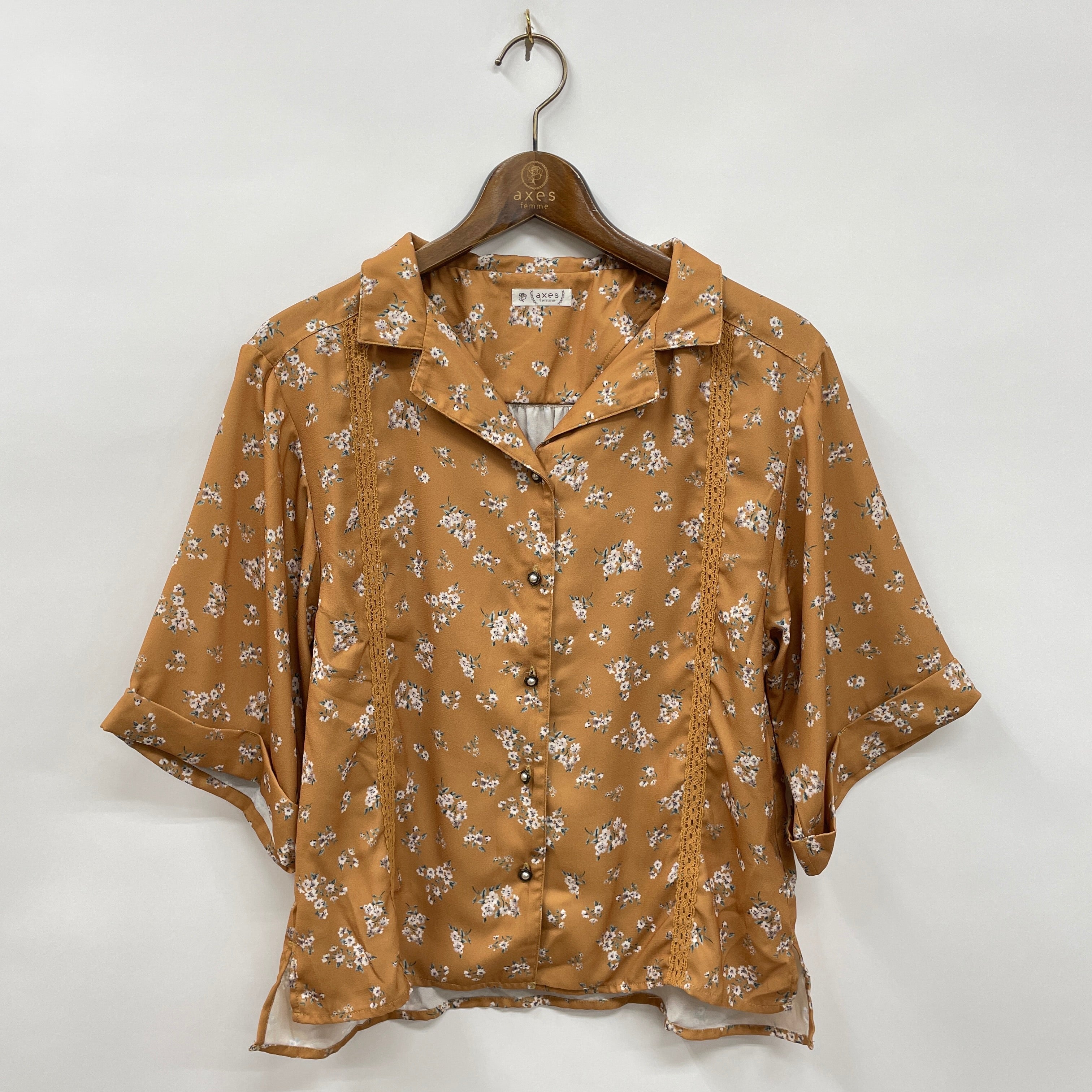 小花柄がポイントの開襟ブラウス。落ち着いた花の色味なので、秋まで長く着まわせるアイテム。首元から重ね着したレースインナーをのぞかせても◎ガウチョなどのパンツ合わせがオススメです。