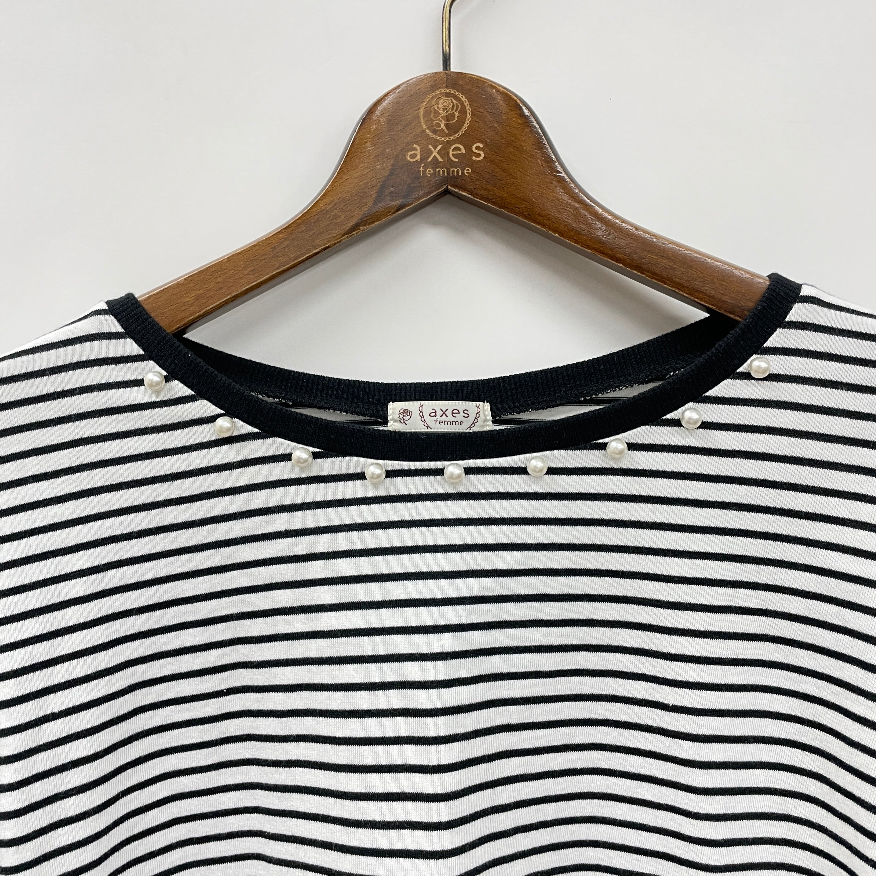 カジュアルながらもキレイ見えする細ボーダー柄は、デイリーに使いやすいアイテム。