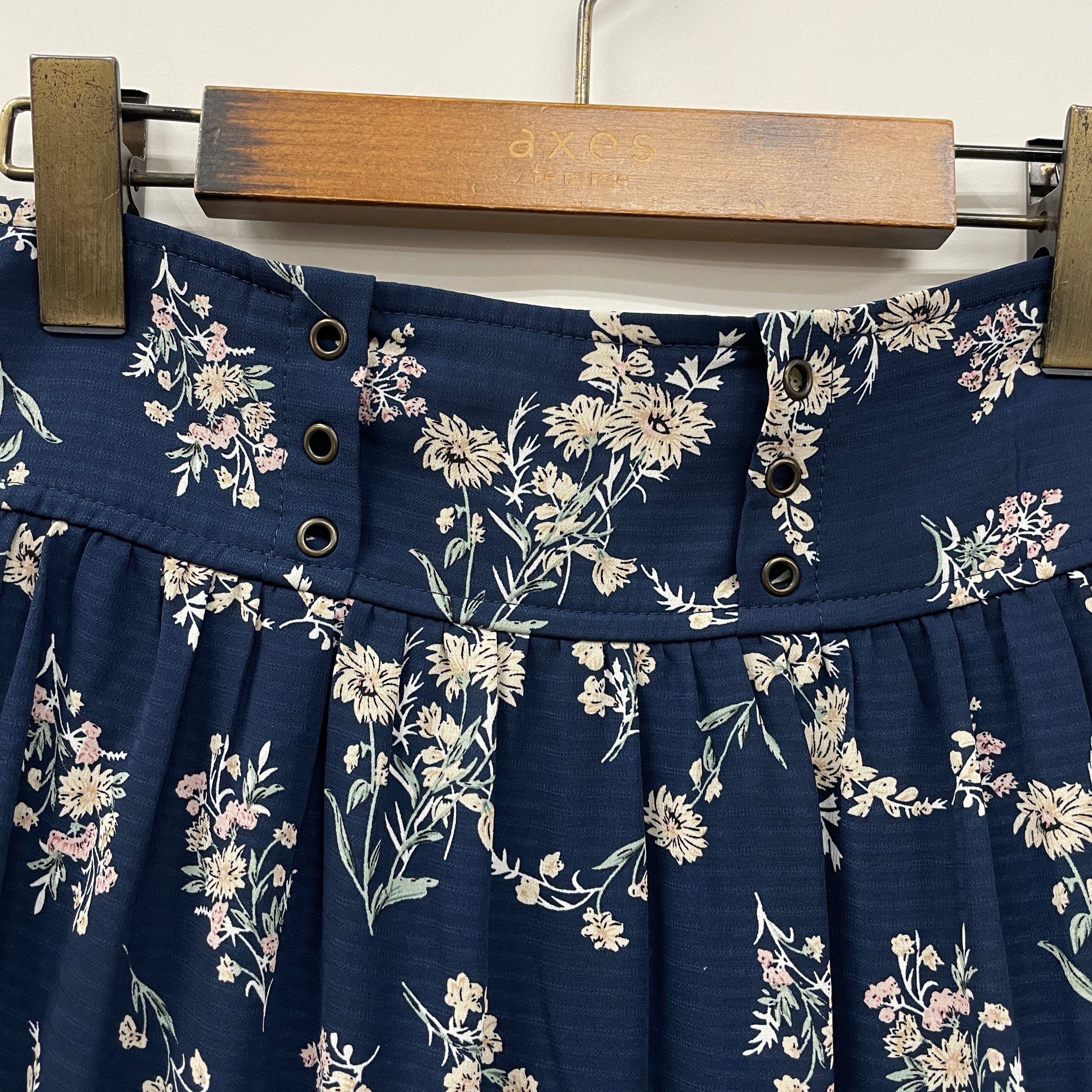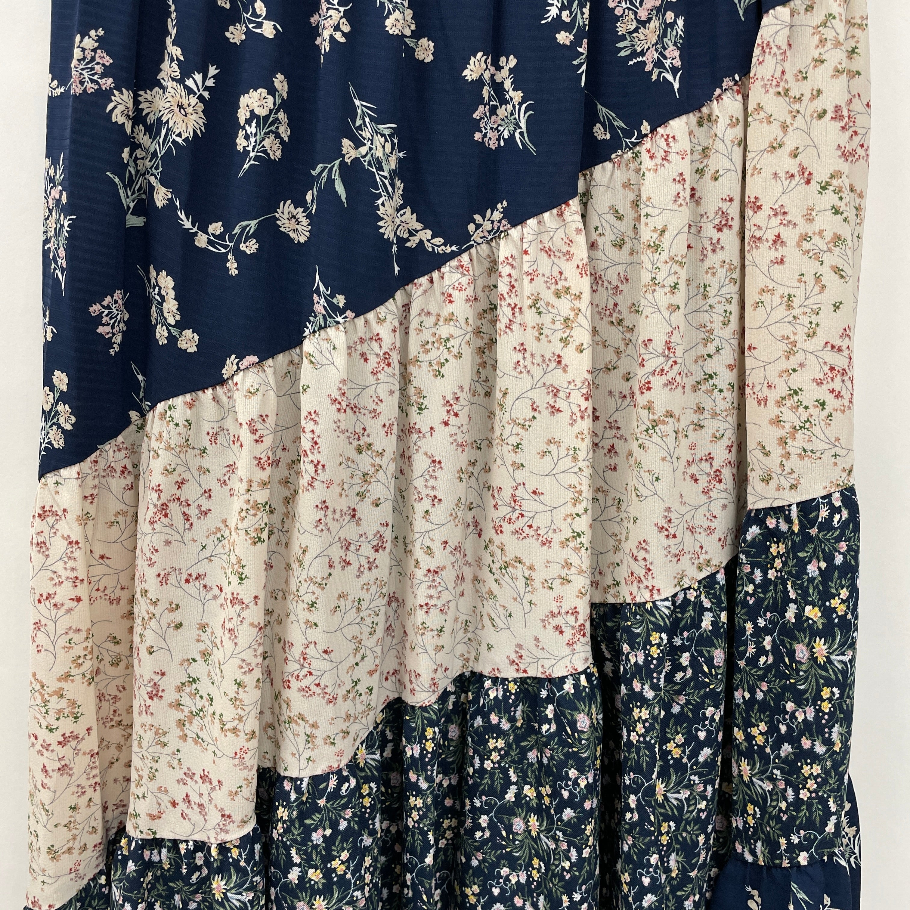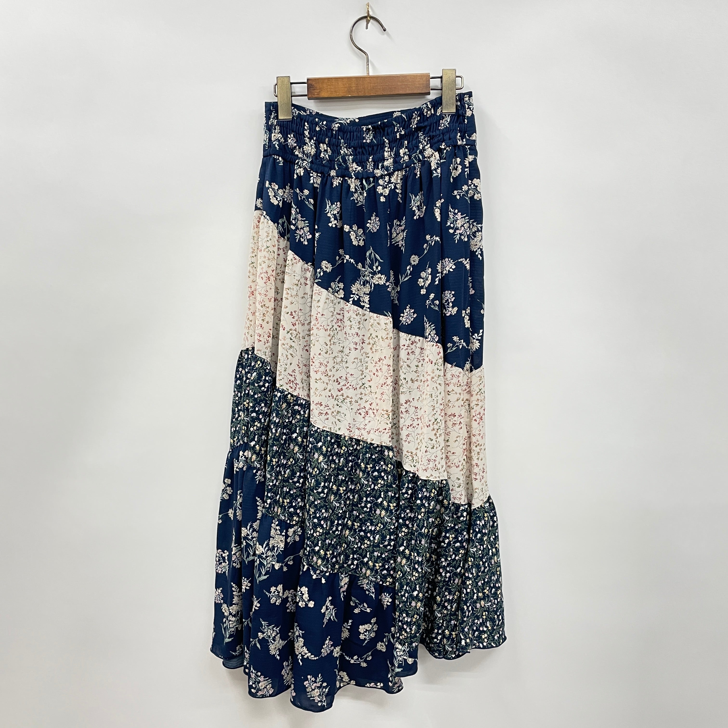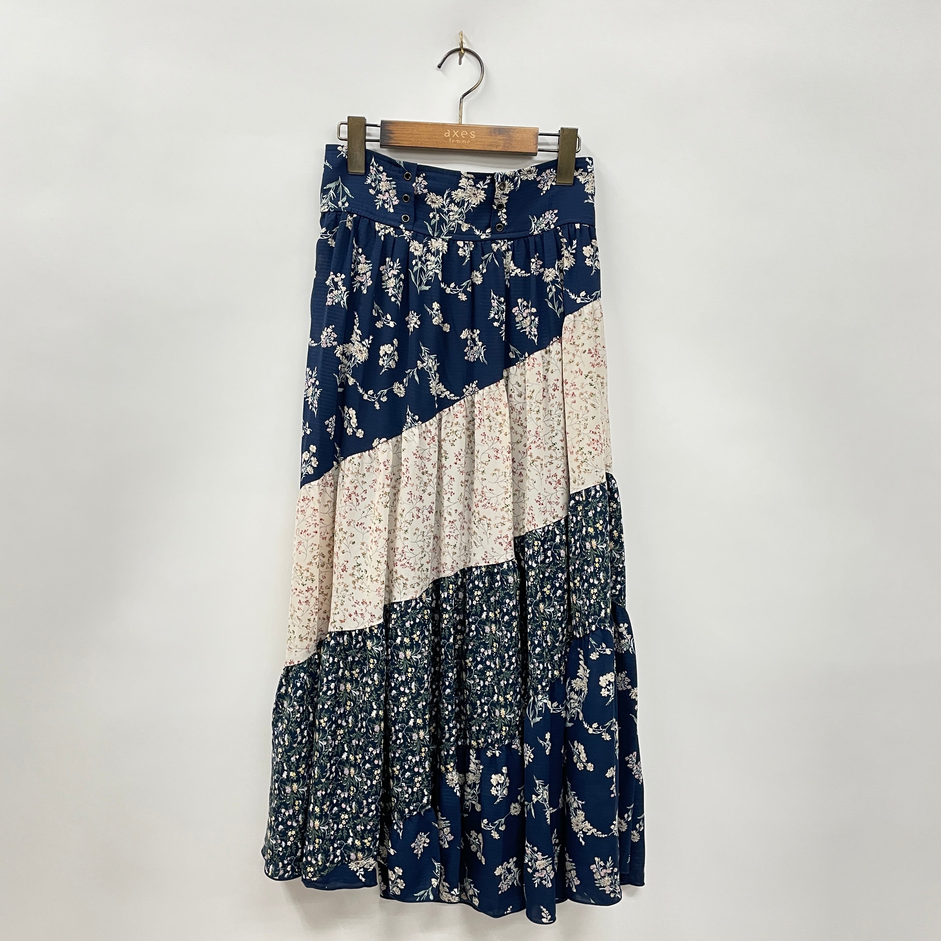 3種類の柄を使用したエスカルゴスカート。秋まで使えるカラーリングでコーディネートの主役になります。ウエストはレースアップデザインで女性らしいシルエットに、後ろはシャーリングゴムなので着脱らくちん&締め付けが無くトップスをインしても圧迫感無く着用いただけます。ロング丈で揺れるシルエットがフェミニンなアイテム。