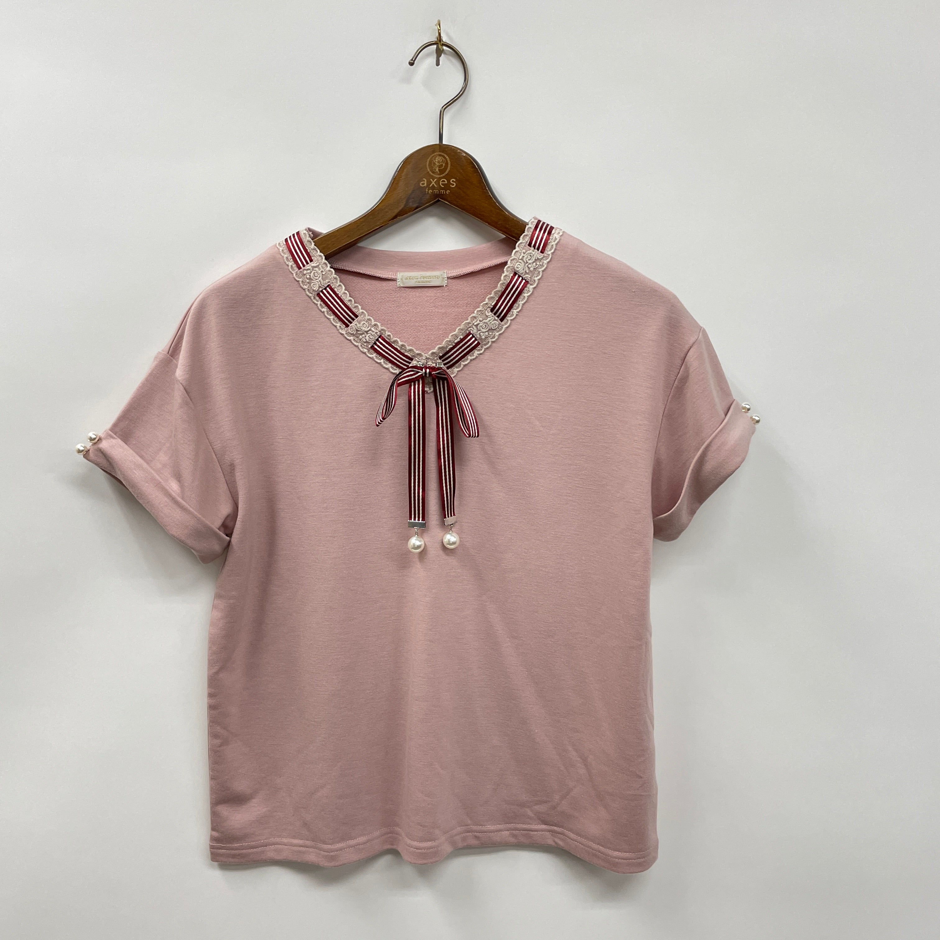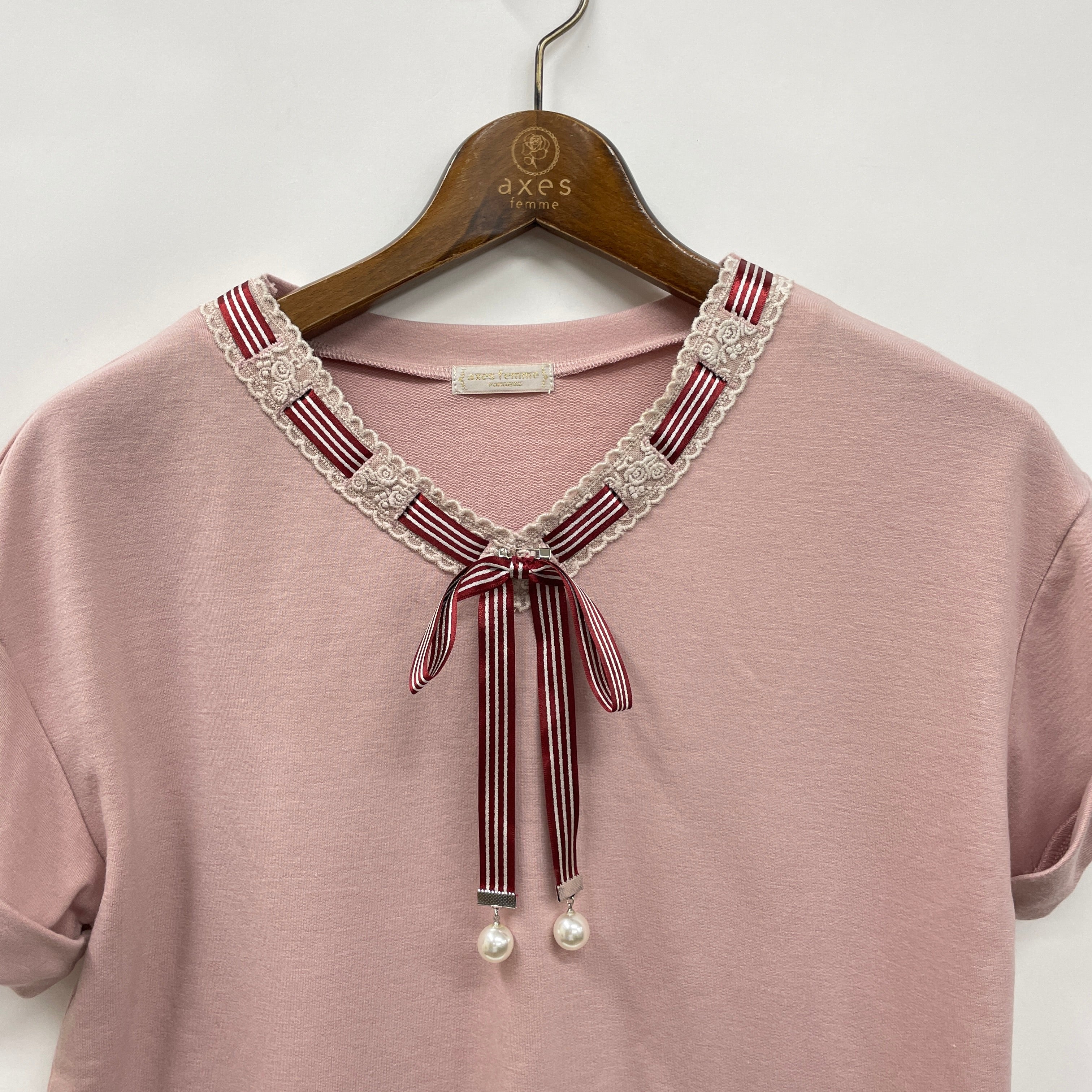 ストライプのリボンをポイントにあしらったマリンデザインが可愛いカットプルオーバーです。胸元のリボン先に揺れるパールチャームがガーリーなアイテム。リボンは取外し可能です。