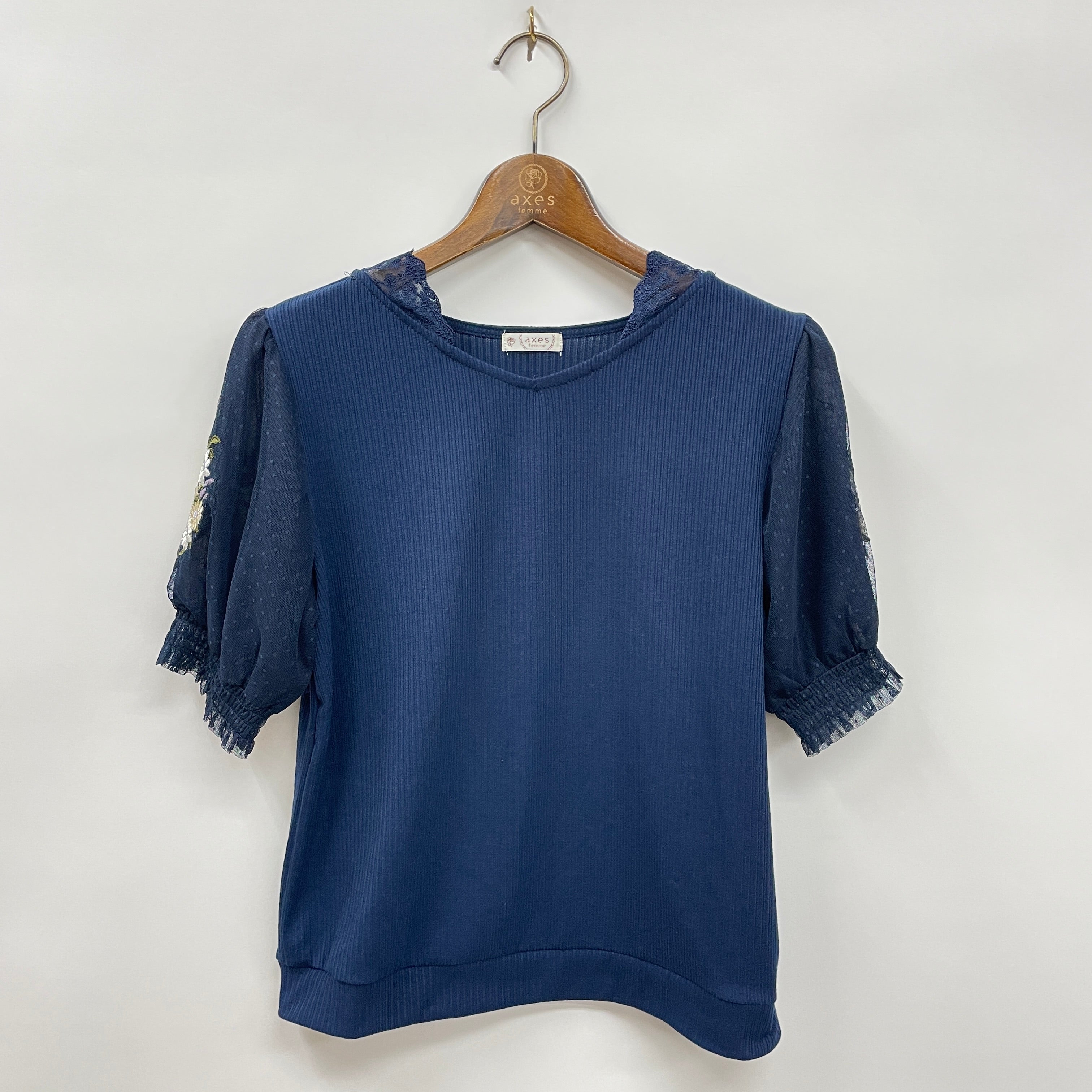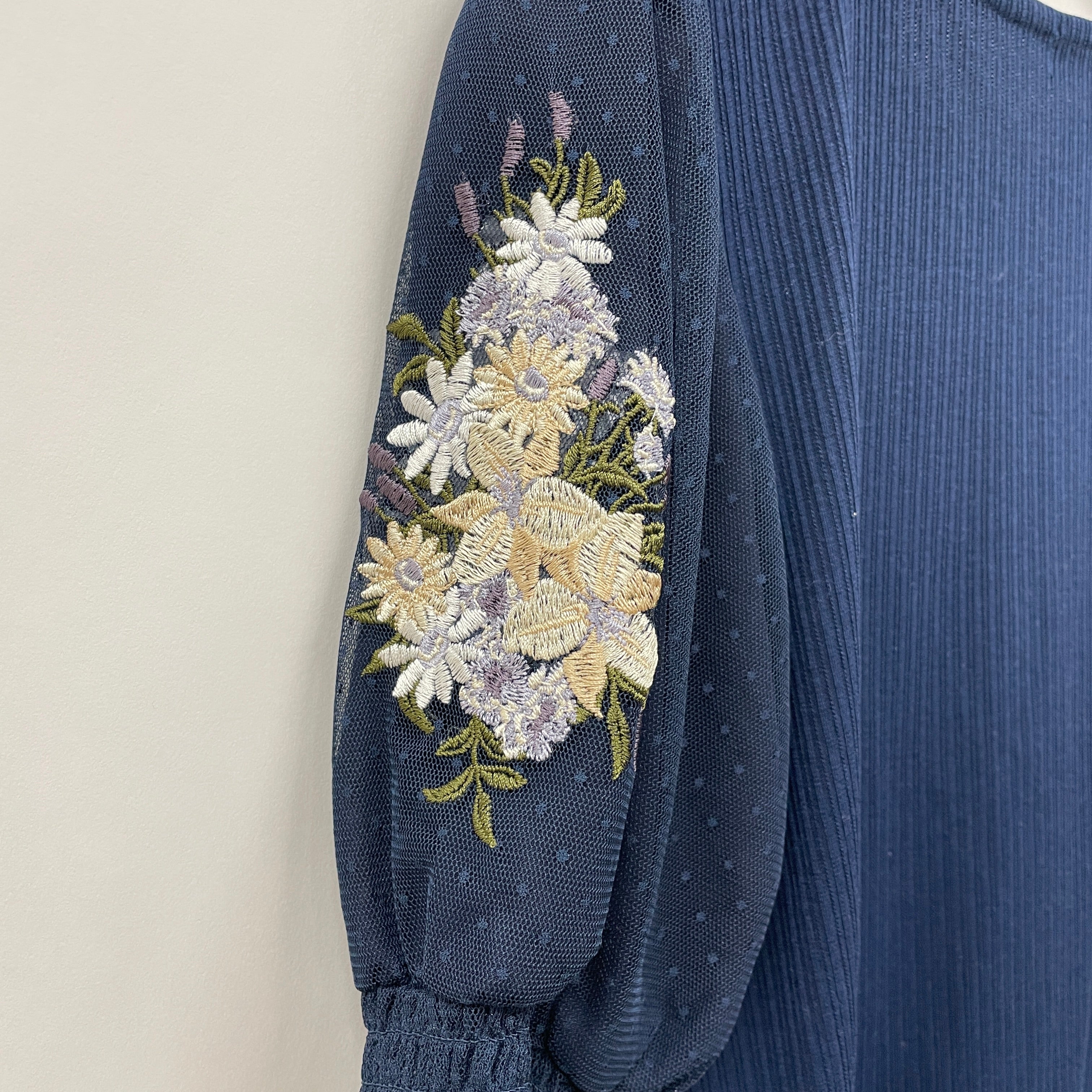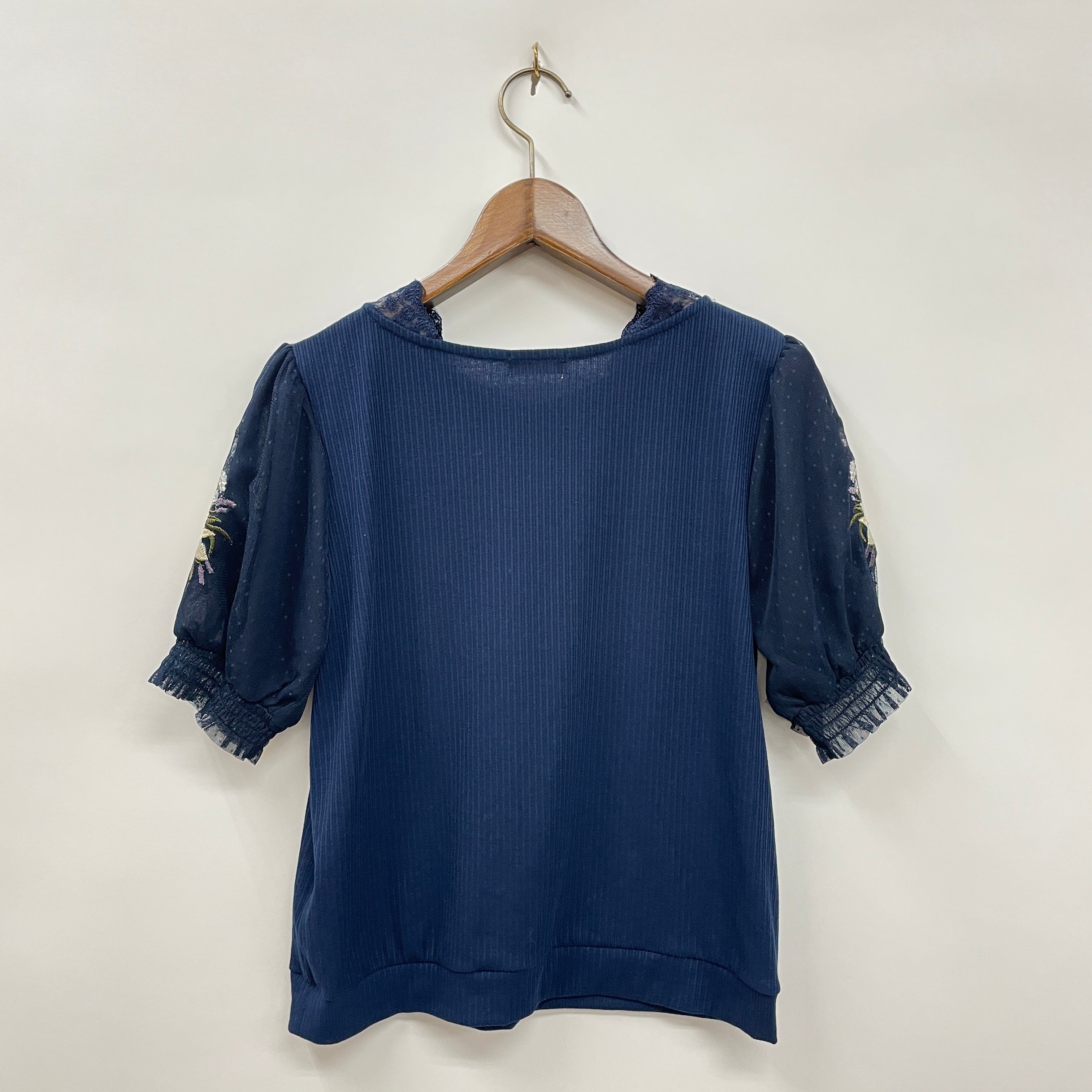 華やかな、ドットチュール×ブーケ刺繍の袖がポイントのリブトップスです。