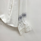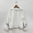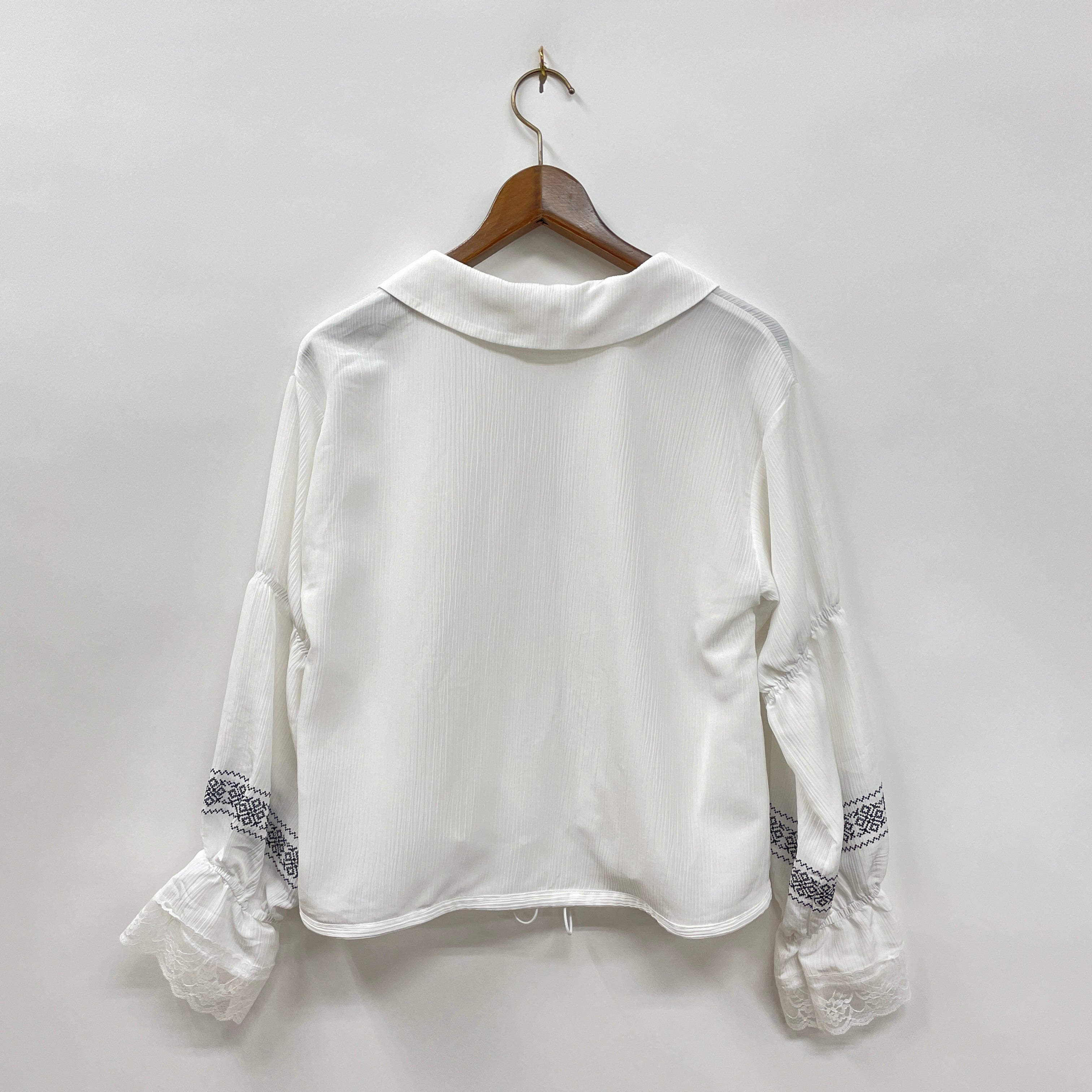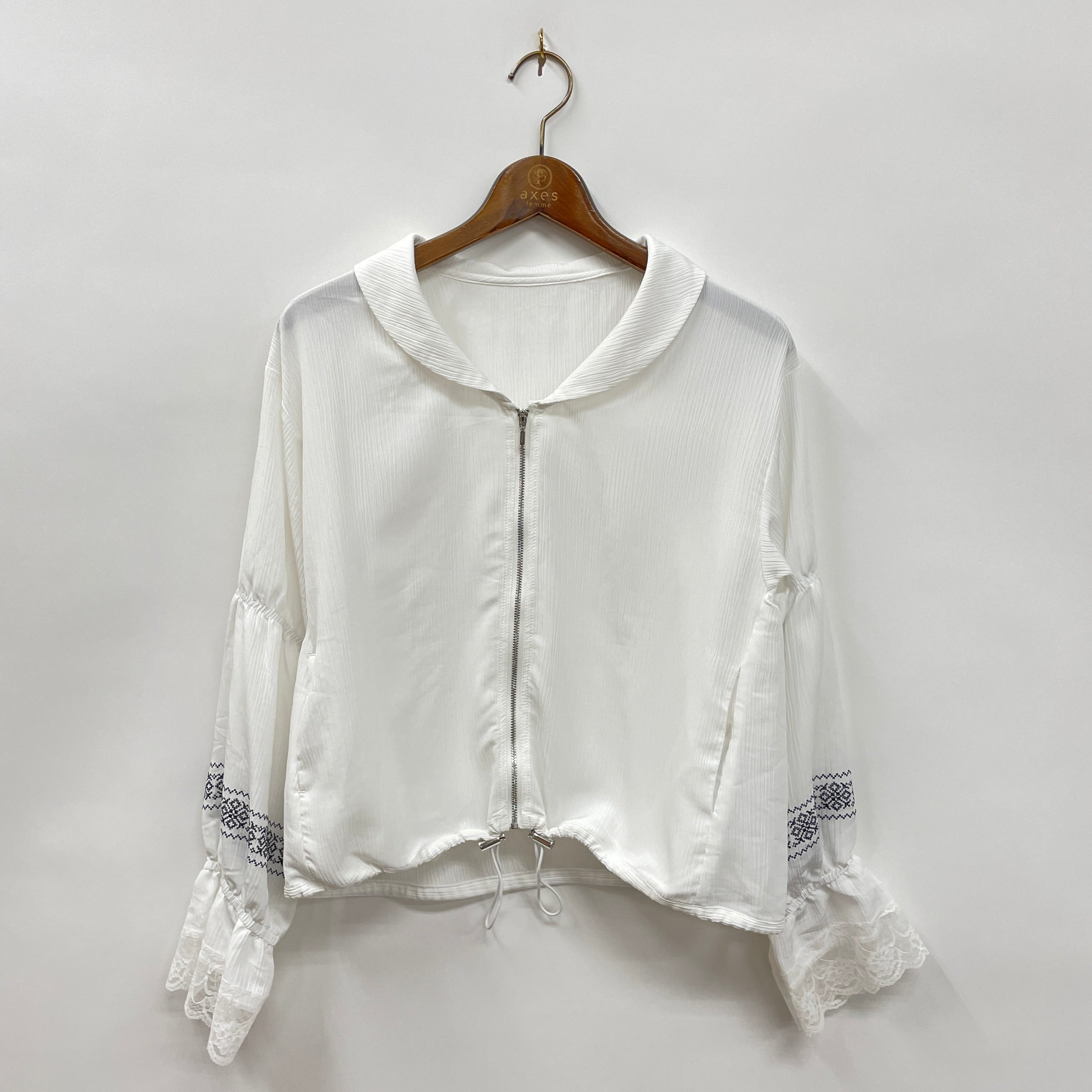 透け感のある楊柳素材を使用したブルゾン。袖口にレースをほどこしフェミニンさをプラスし、刺繍がアクセントに。