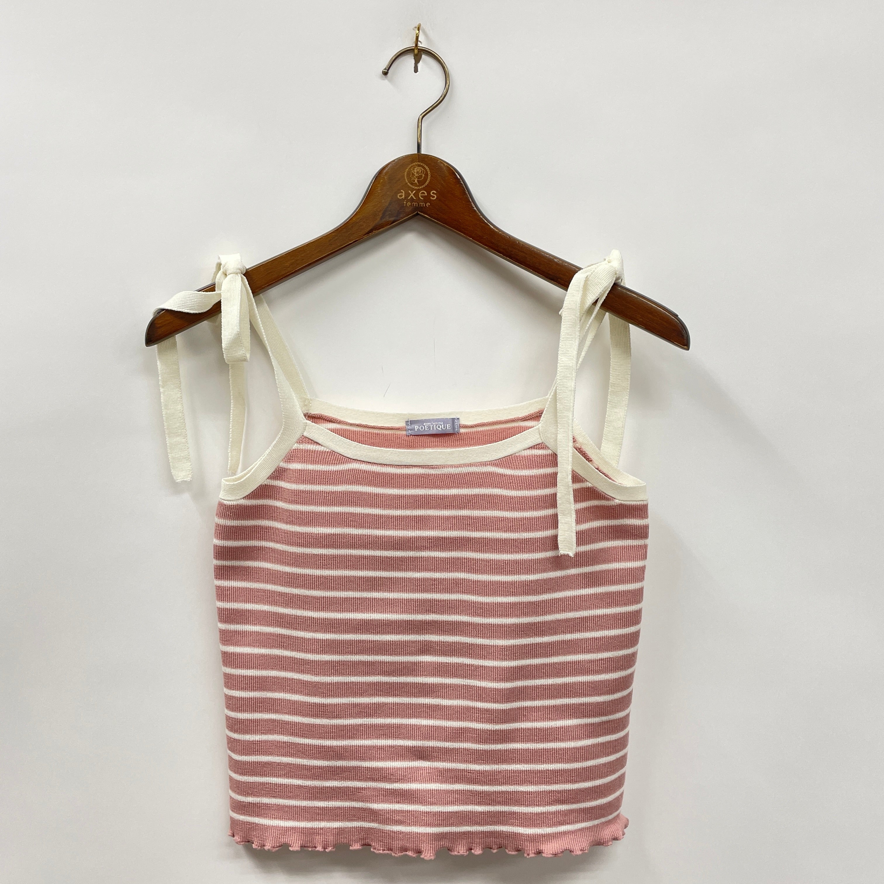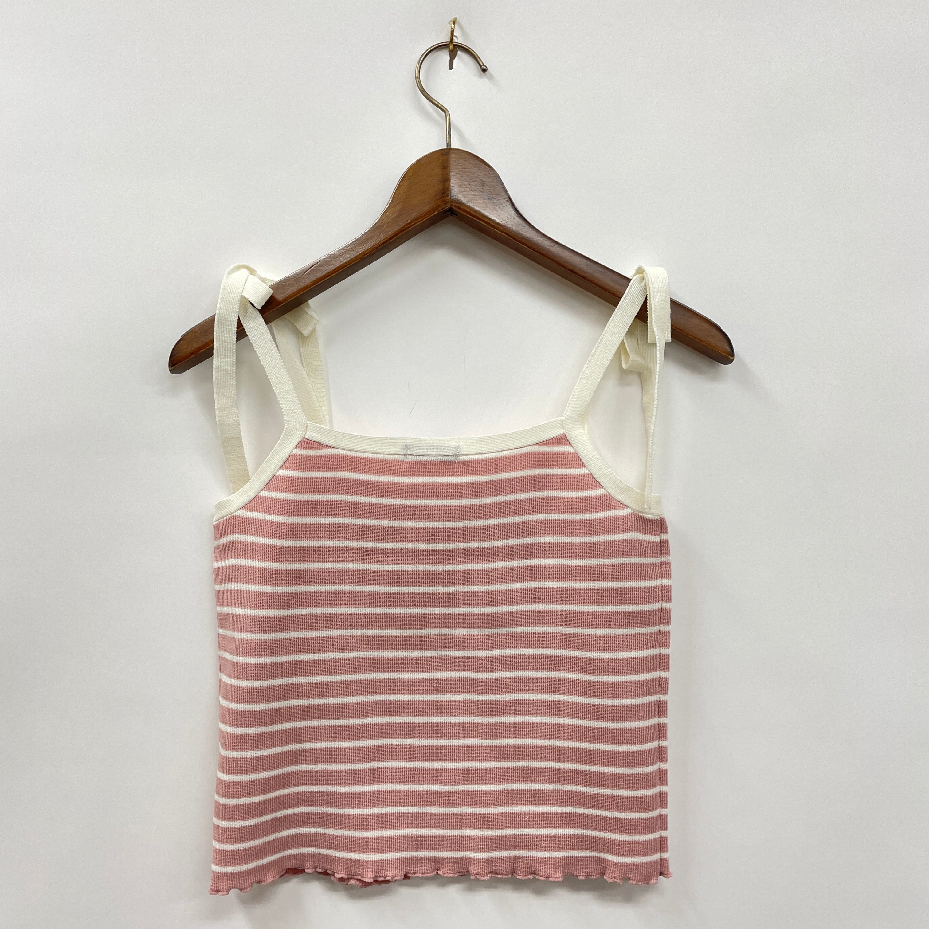 キャミの肩ヒモはリボンタイプになっているので、カーデの襟ぐりから出して着用するのも◎!