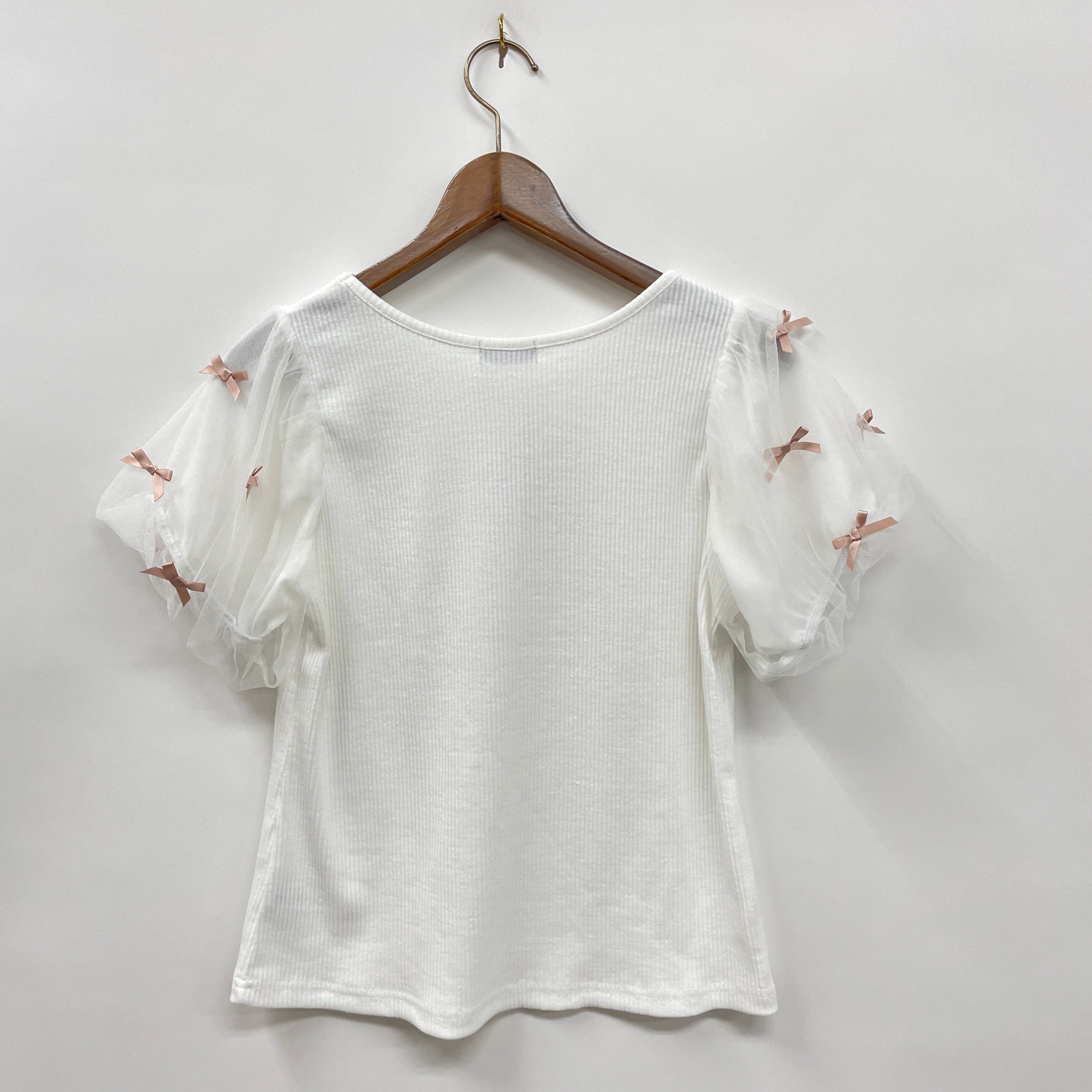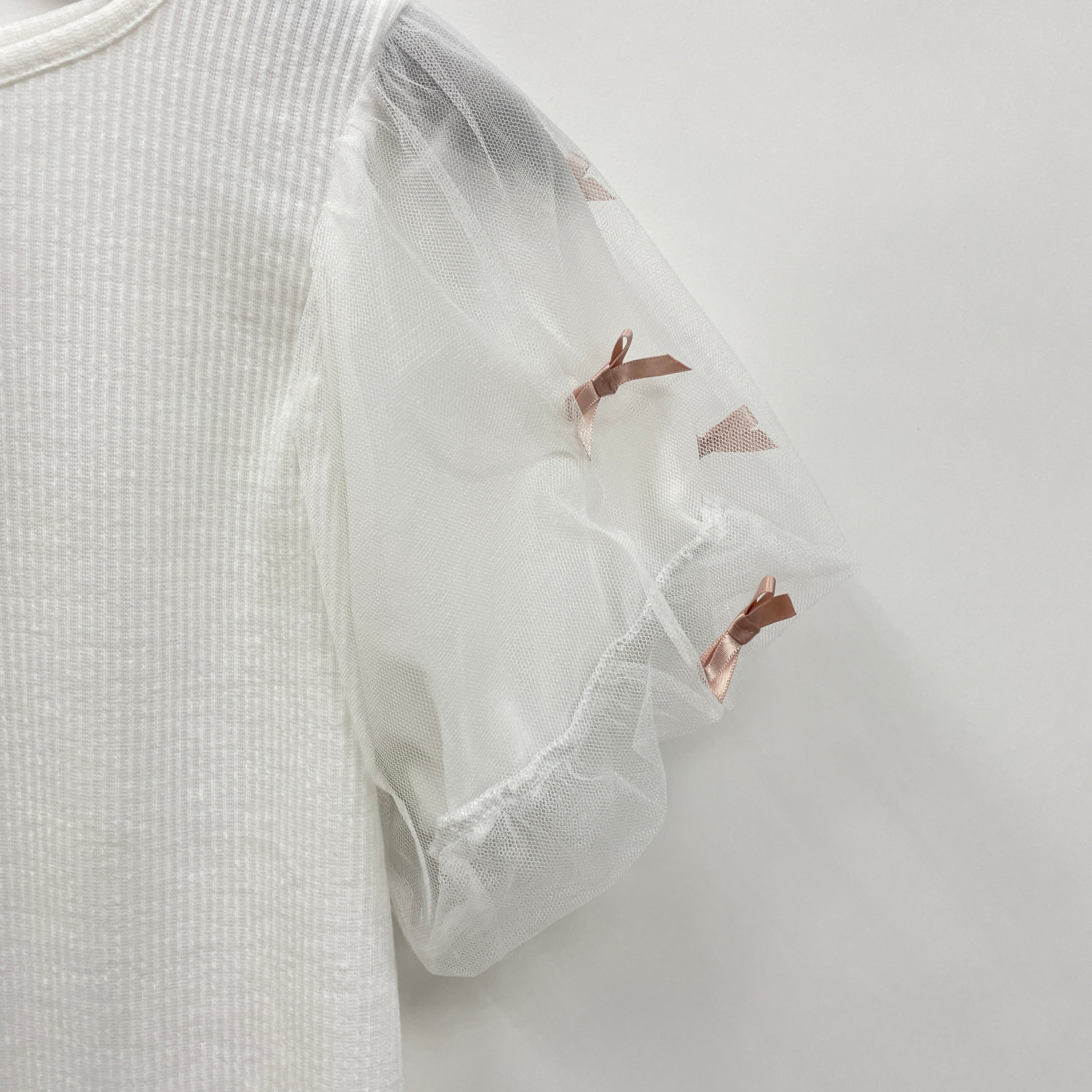 袖がシフォンとチュール生地重ねになっており、小さなサテンリボンが散りばめられたガーリーなデザインです。