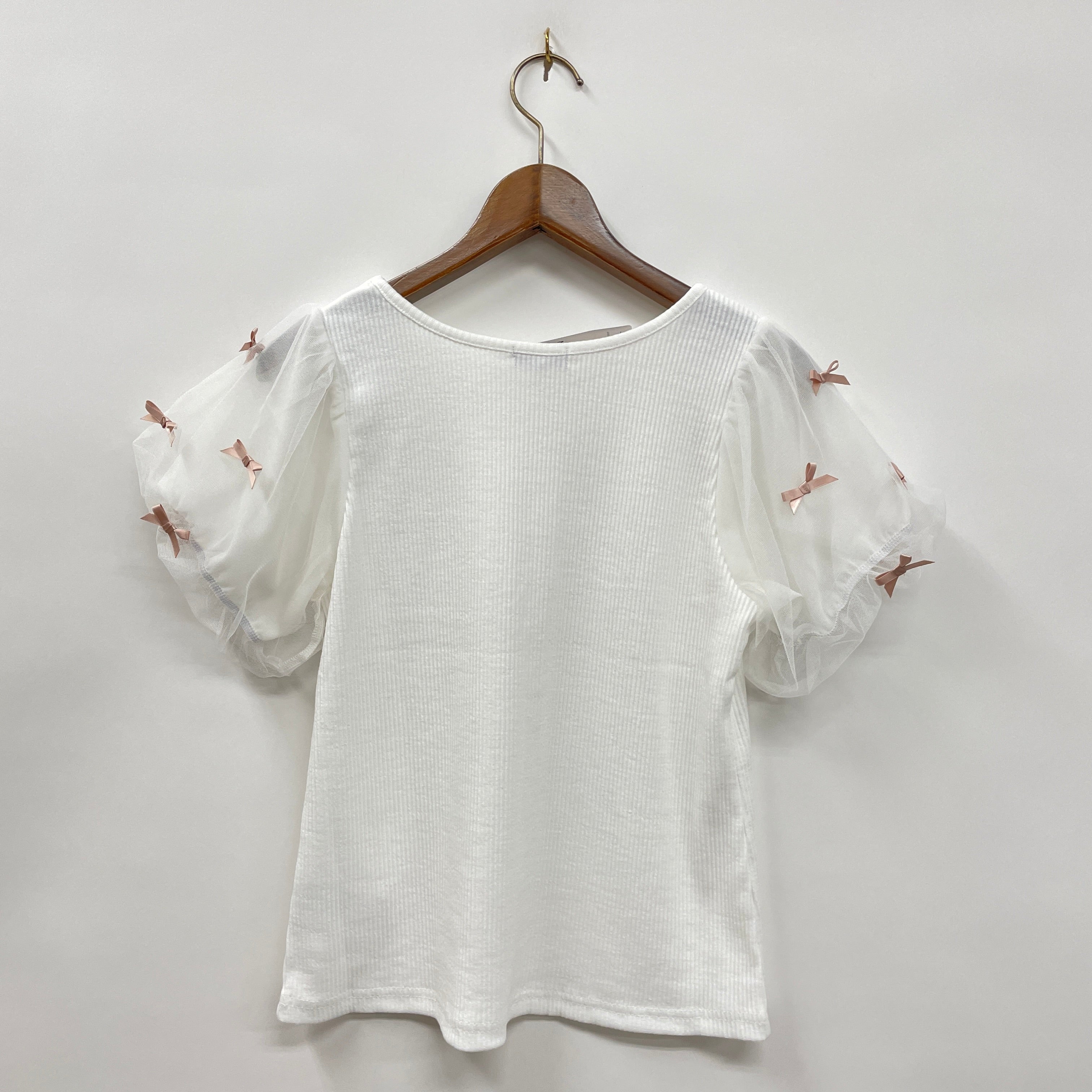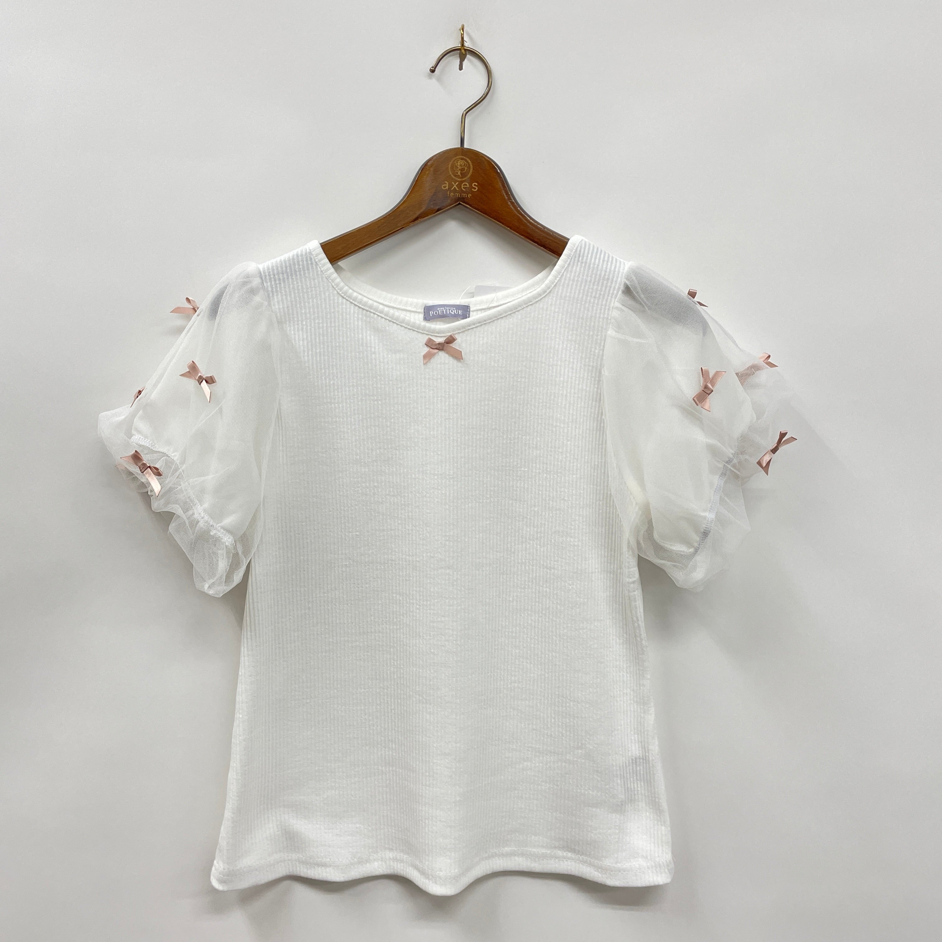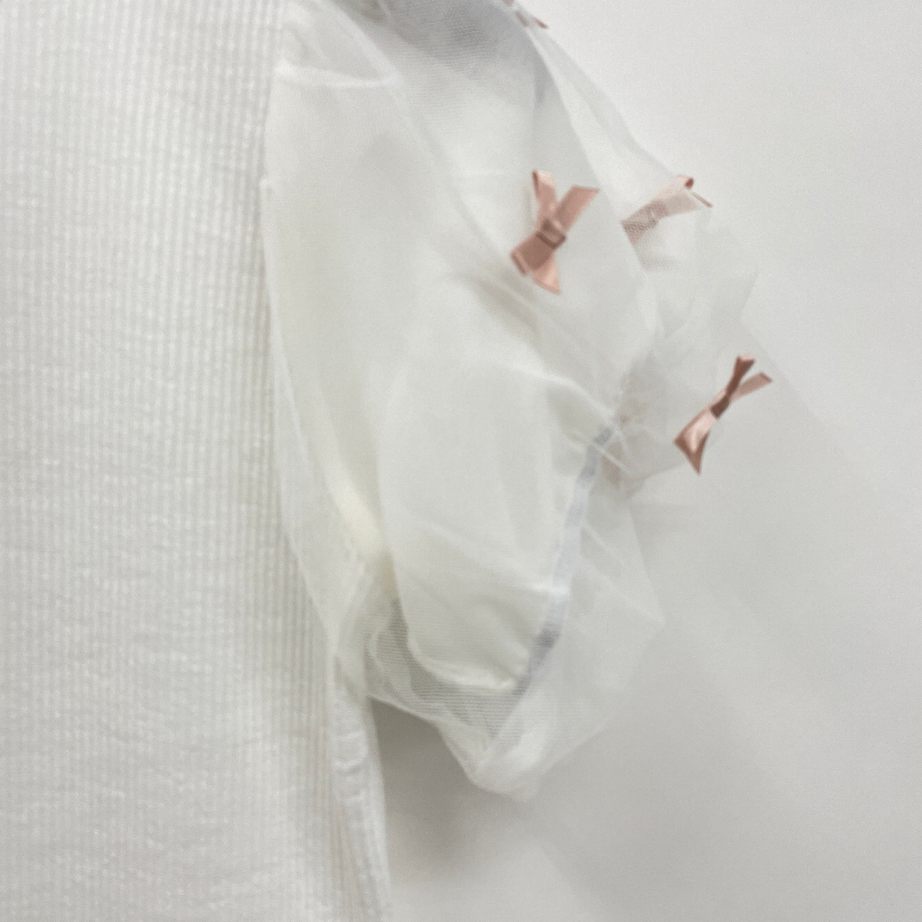 袖がシフォンとチュール生地重ねになっており、小さなサテンリボンが散りばめられたガーリーなデザインです。