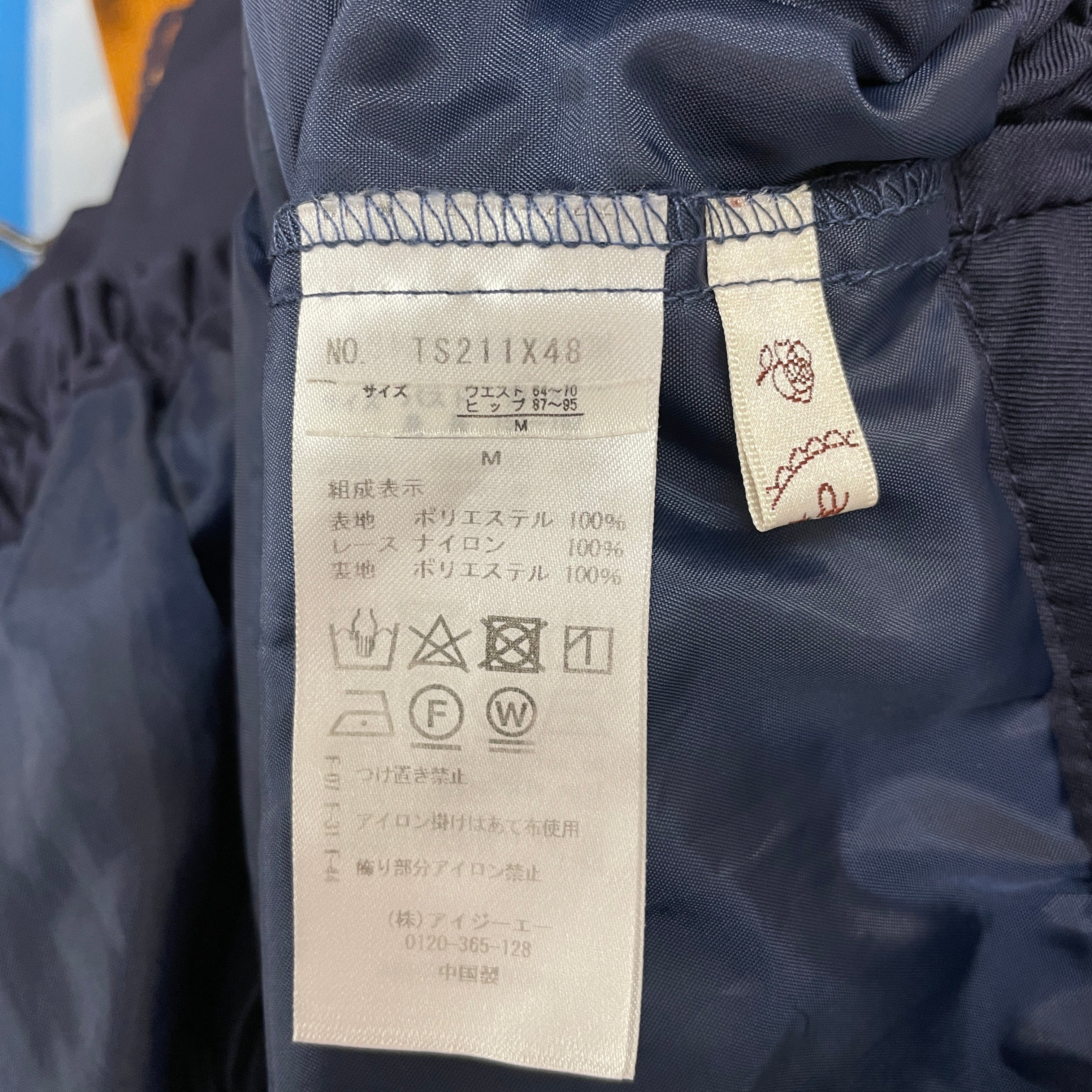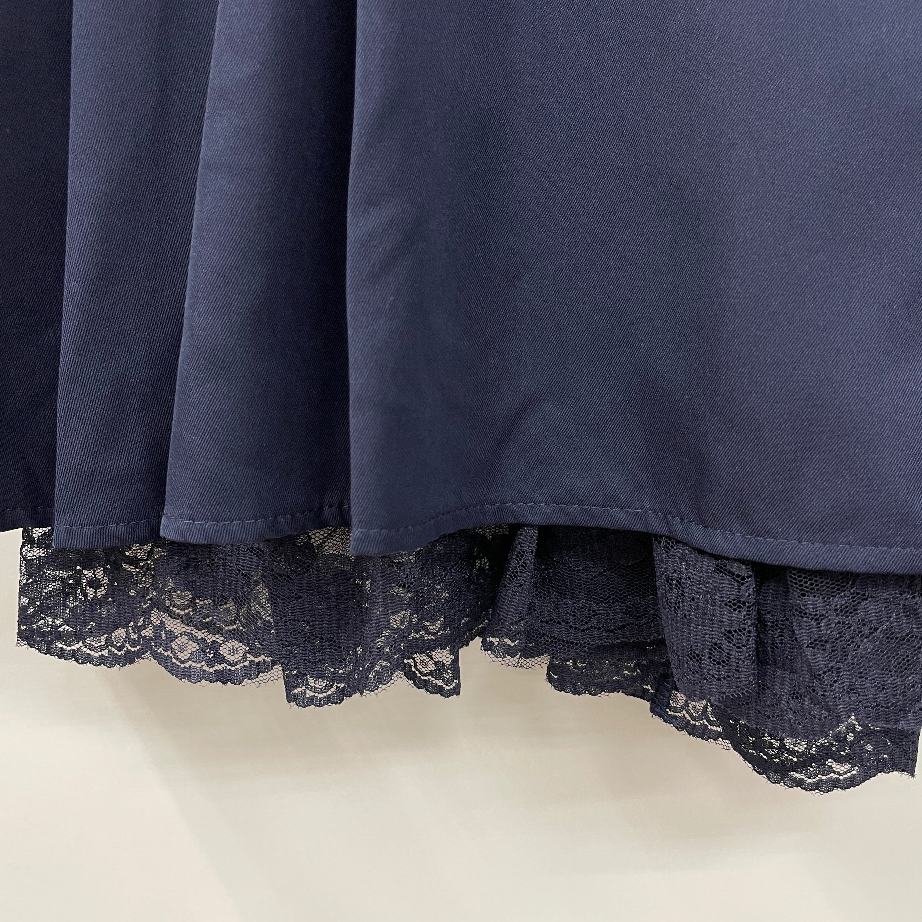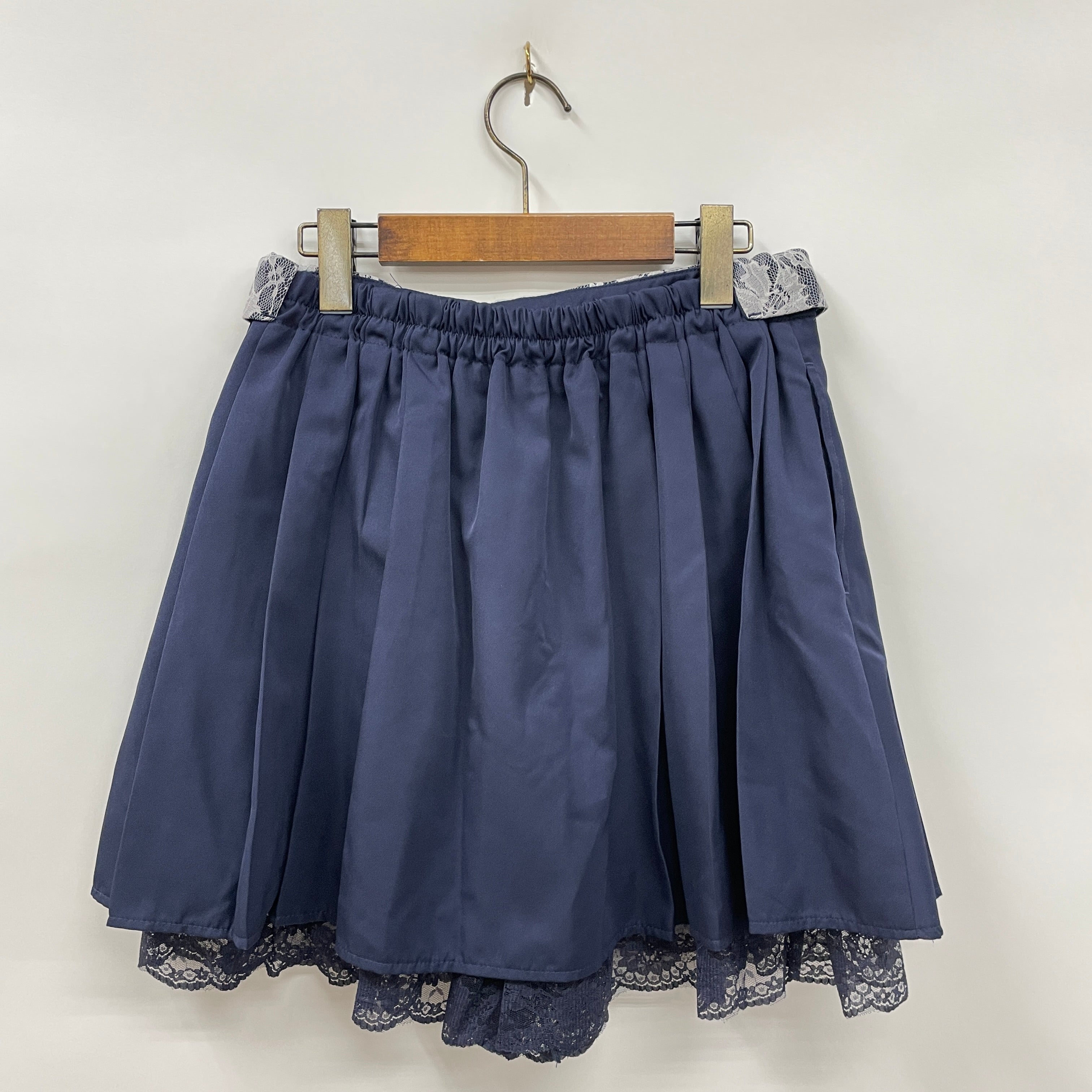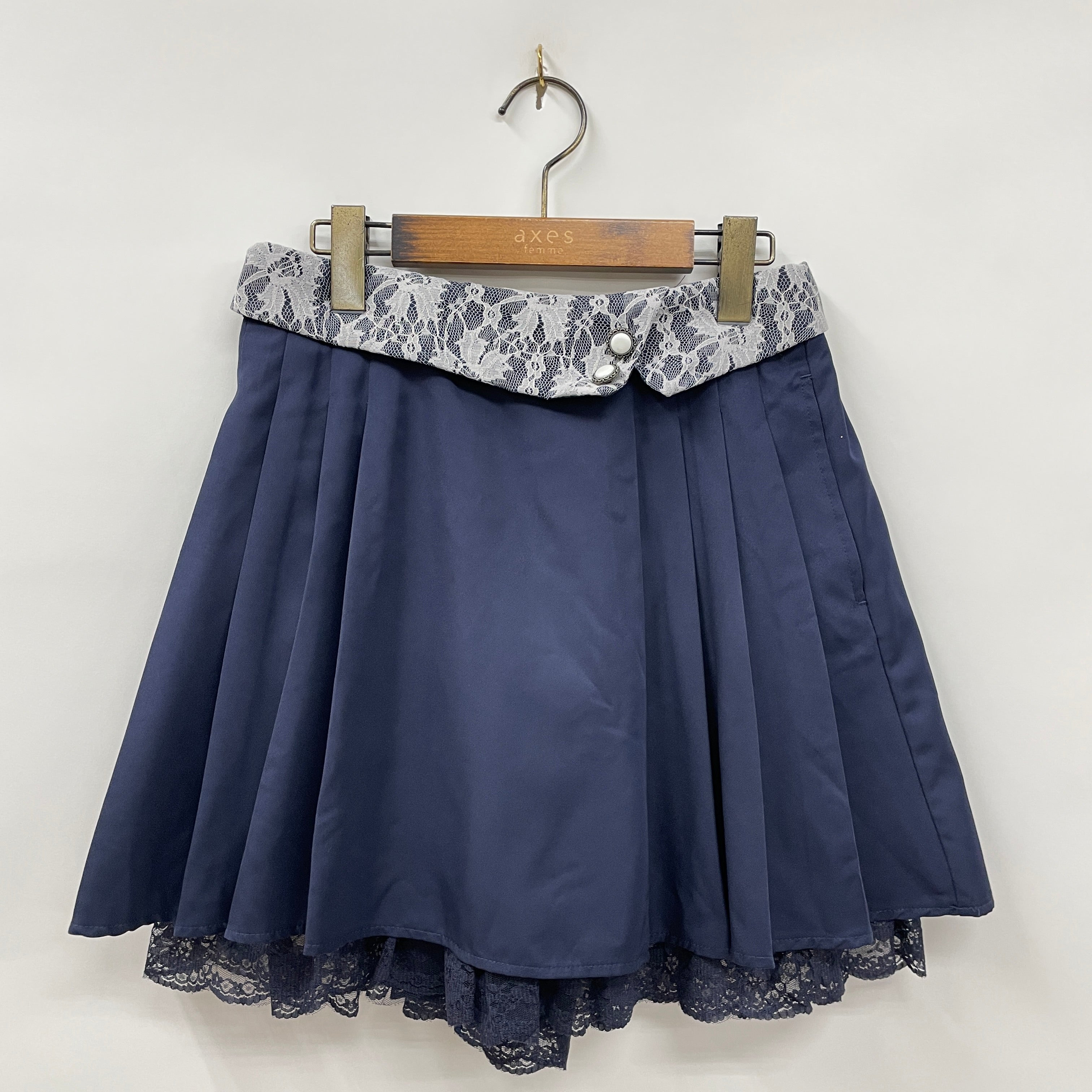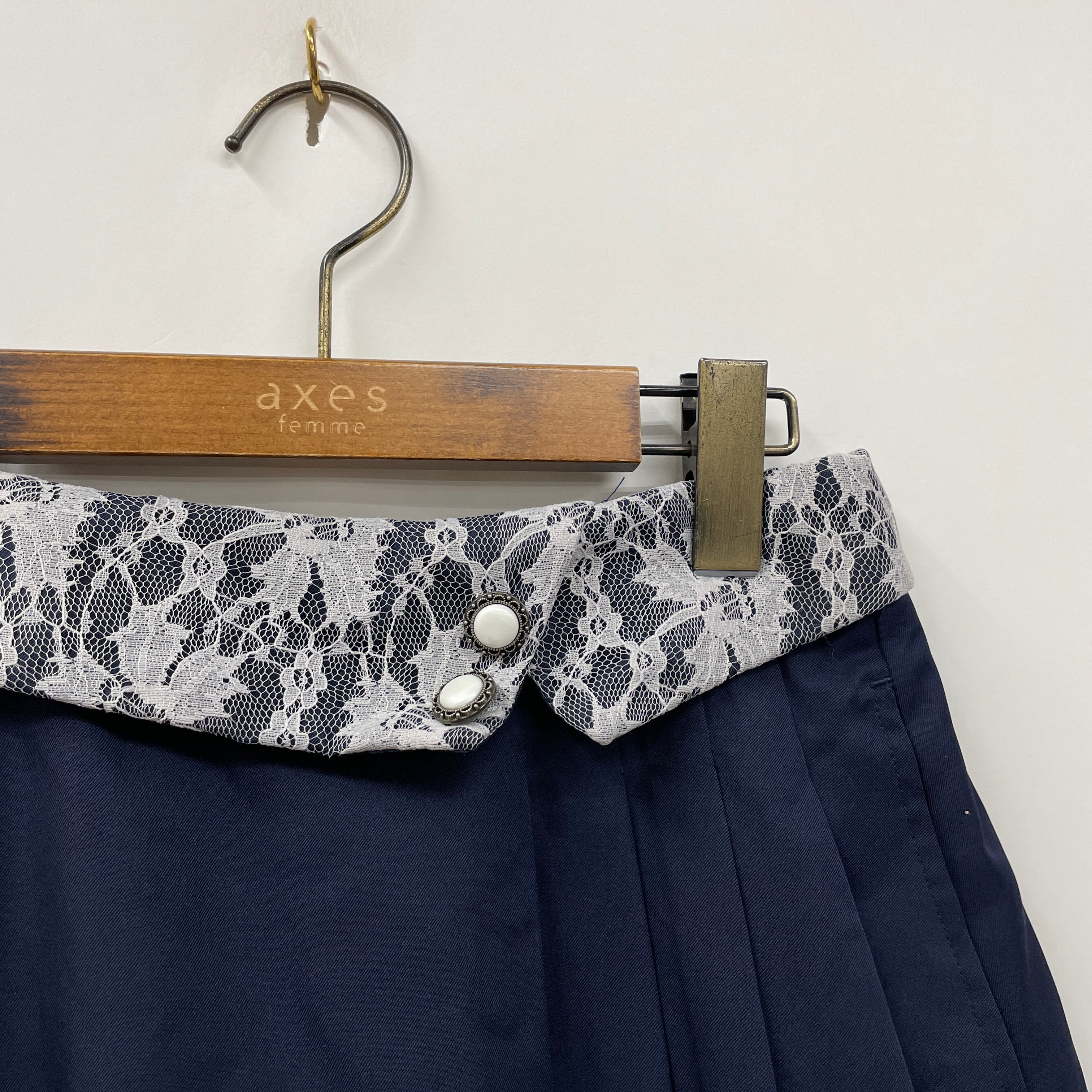 サイドプリーツのスカパンです。ウエストの折り返し部分にはレースを重ねているのがポイント。無地なので、トップスに柄物を合わせても◎