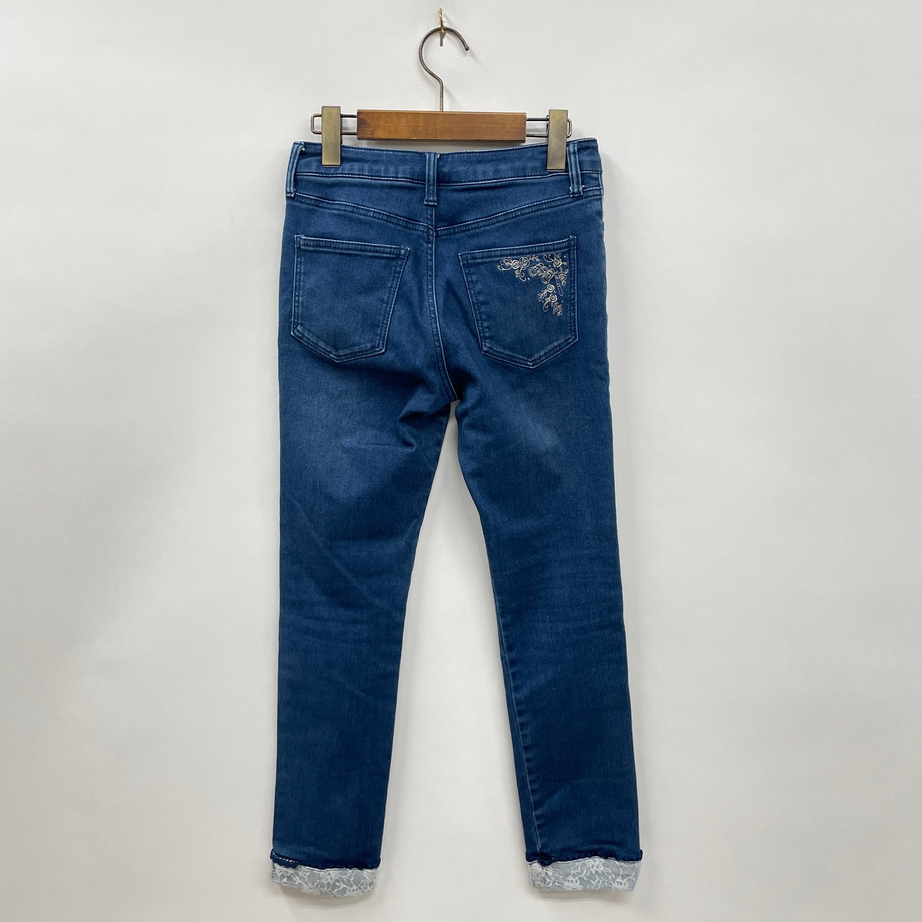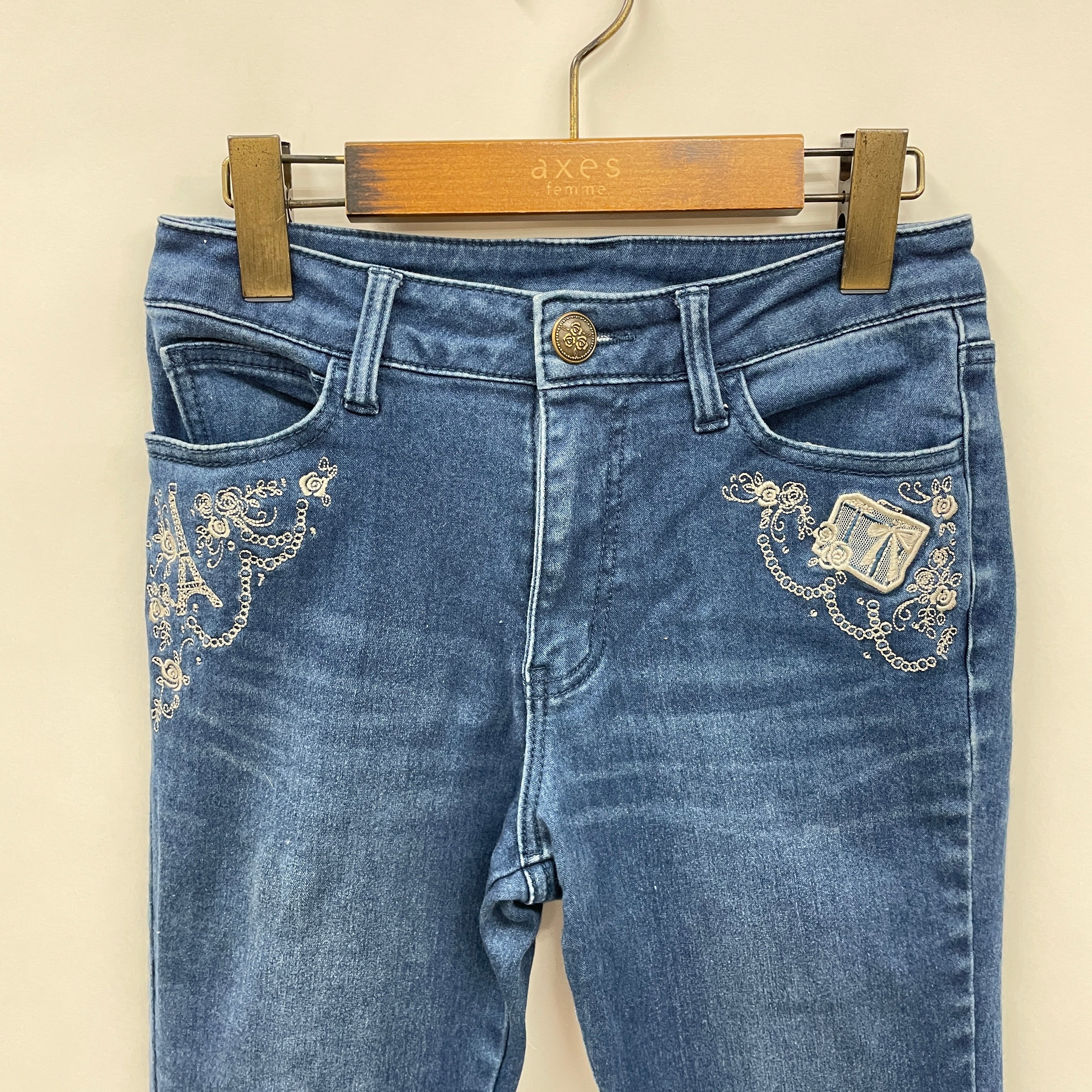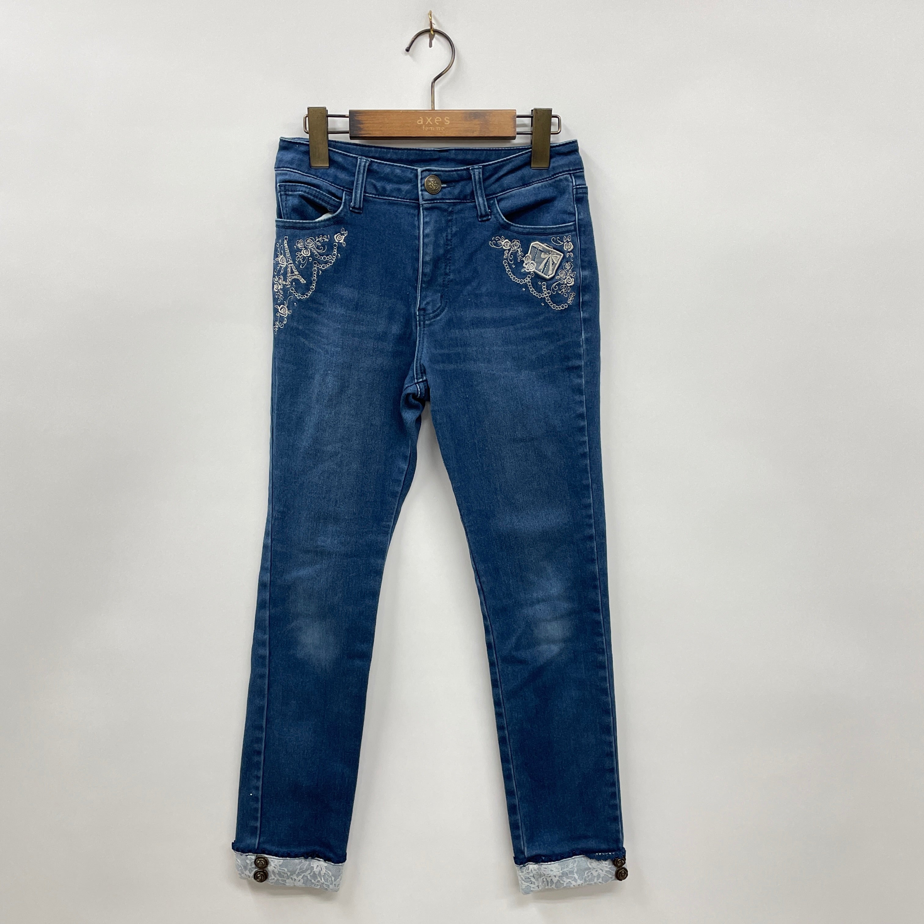 エッフェル塔やオペラグラスなどアンティークモチーフの刺繍が施されたaxes femmeらしいデニムパギンスです。トランク刺繍にはドットチュールを重ねているのがポイントです。レースを重ねた折り返しデザインの裾にはバラボタンが付いています。伸縮性の良い素材を使用しているため動きやすく履き心地も◎。裏起毛素材なので温かく履ける便利な1枚です。
