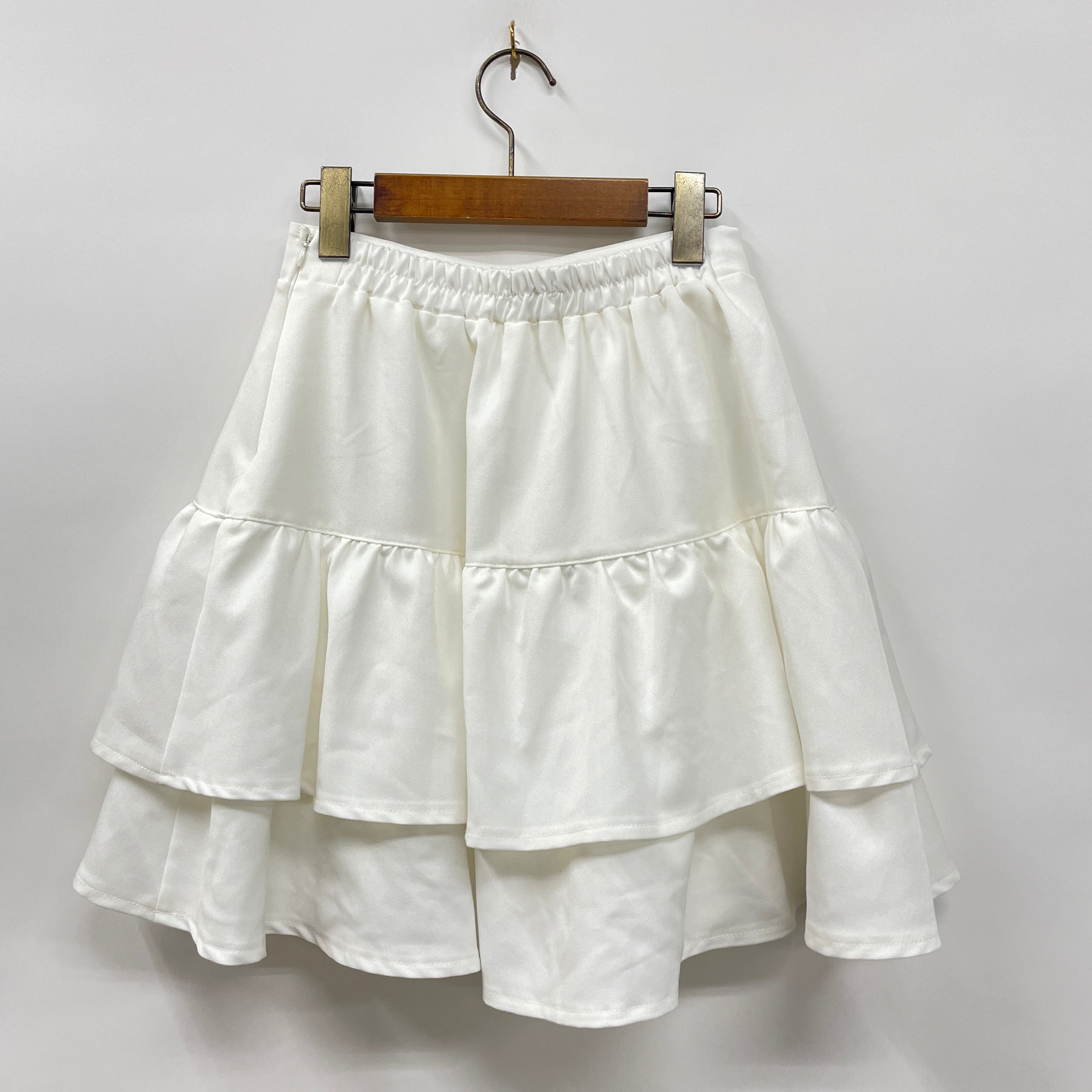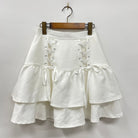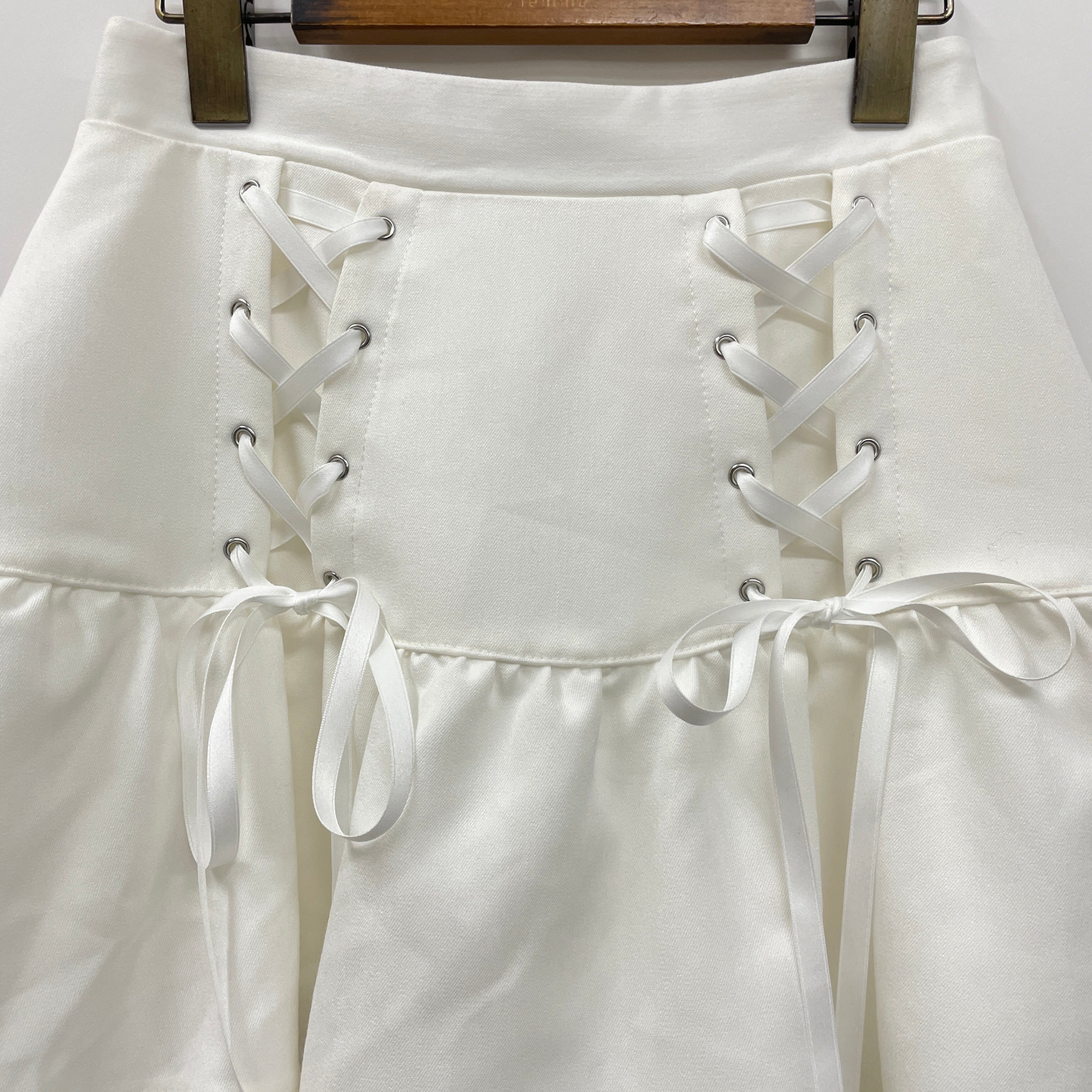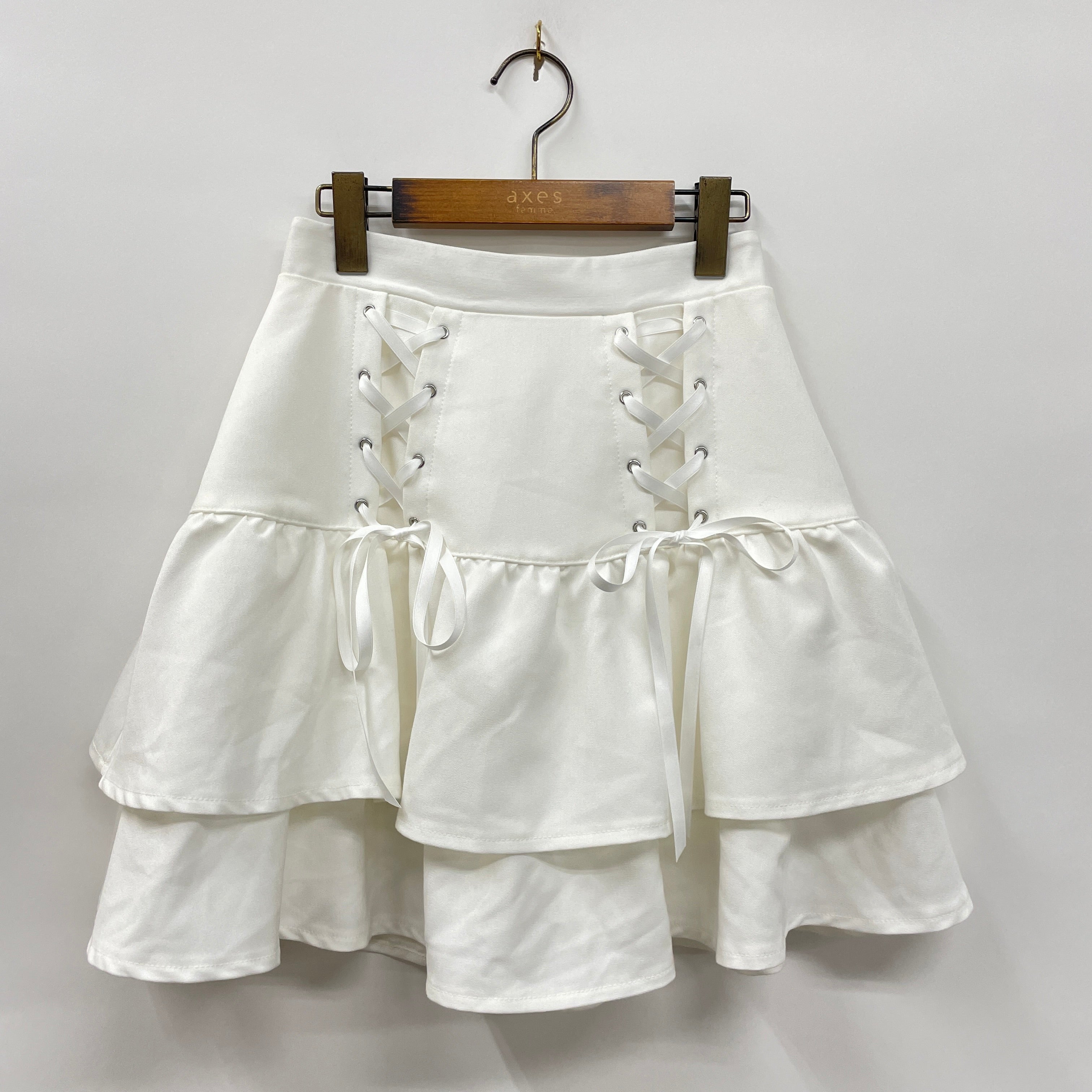両サイドにレースアップのデザインがついており、2段フリルでボリューミーに広がるシルエットが可愛い1枚です。