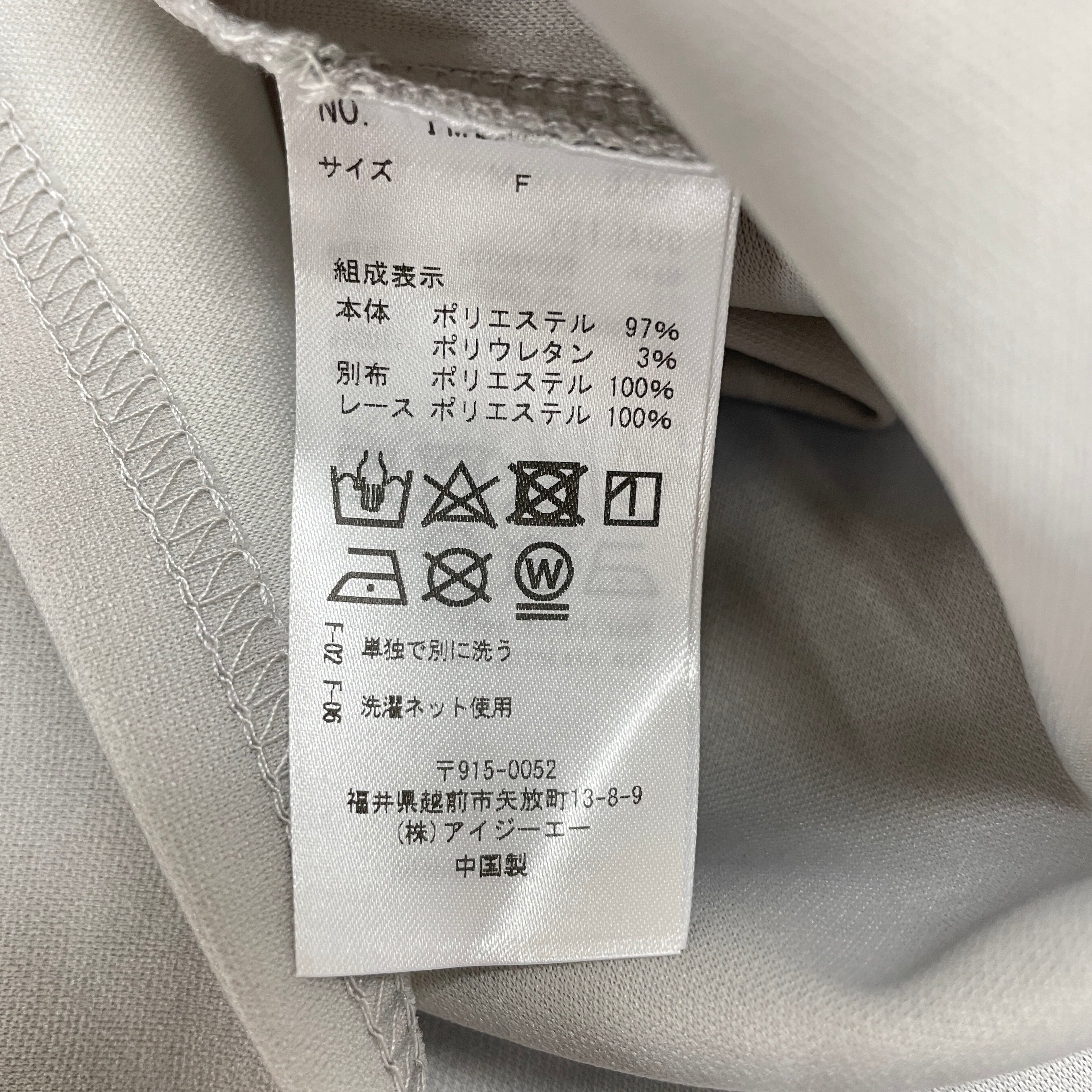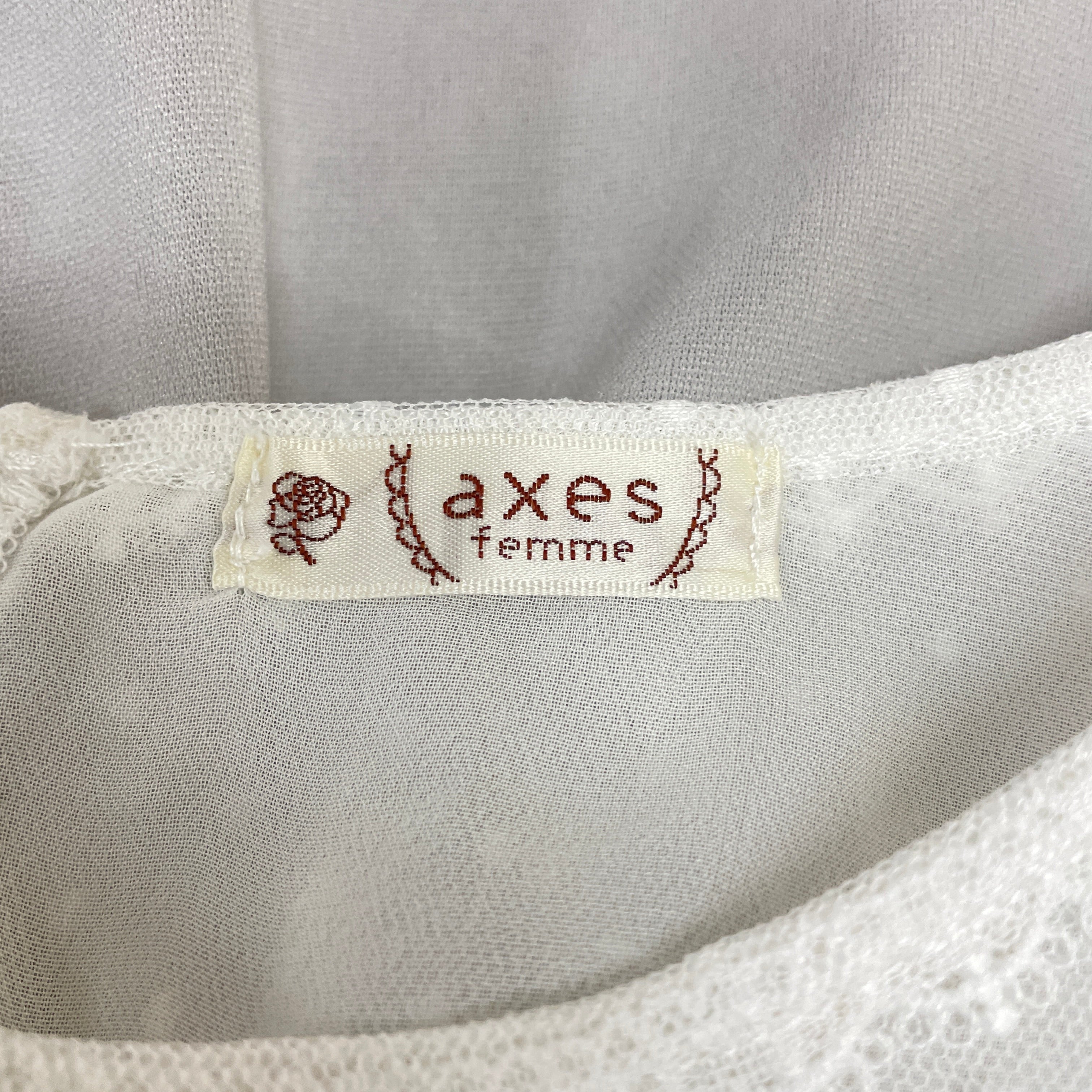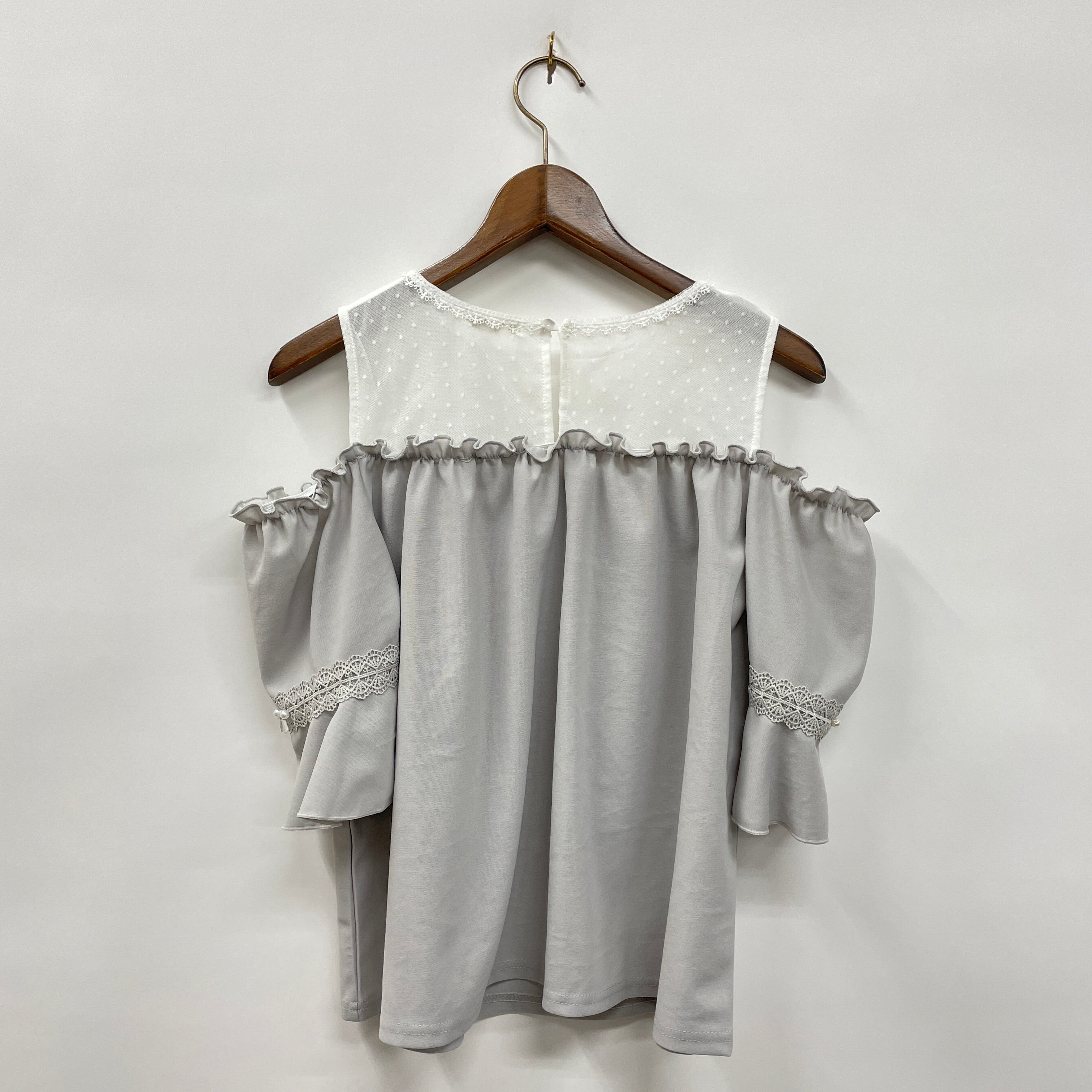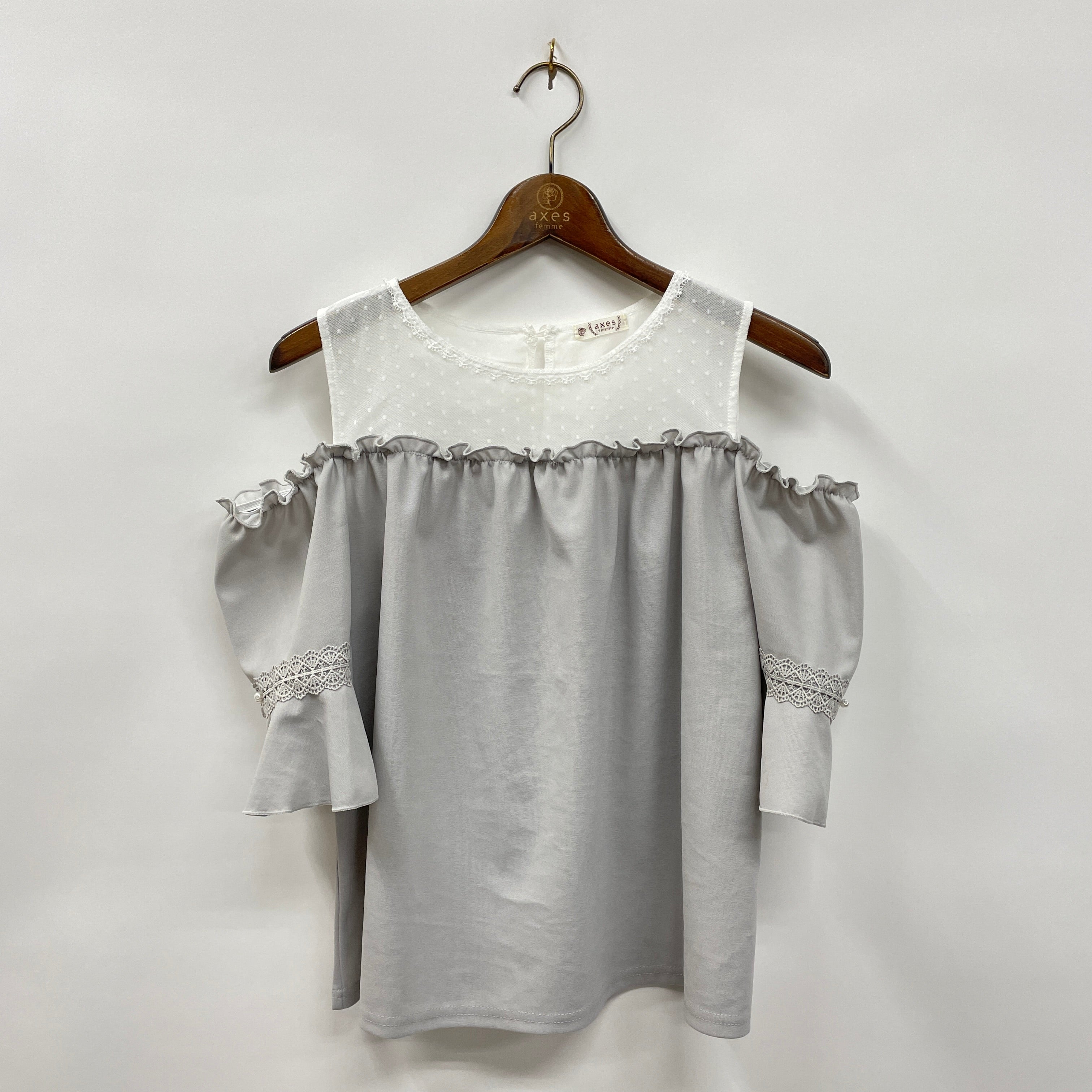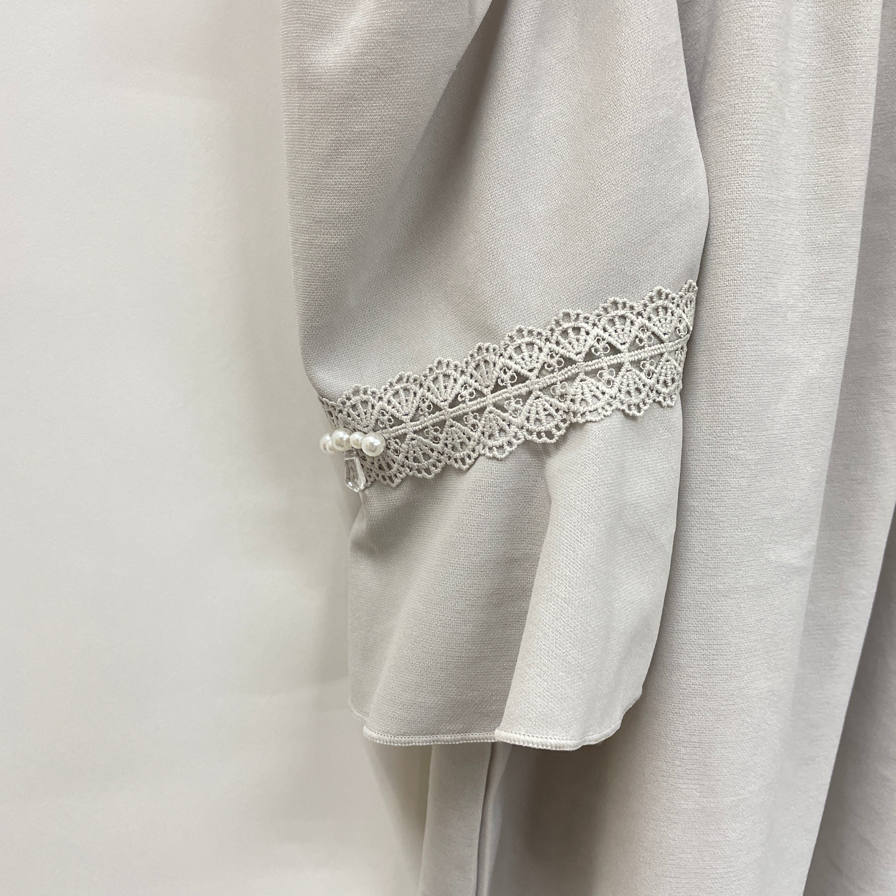 襟ぐりにはナイロンレースをさりげなく挟み込み、袖には存在感のあるケミカルレースを重ね、フェミニン感をプラス。