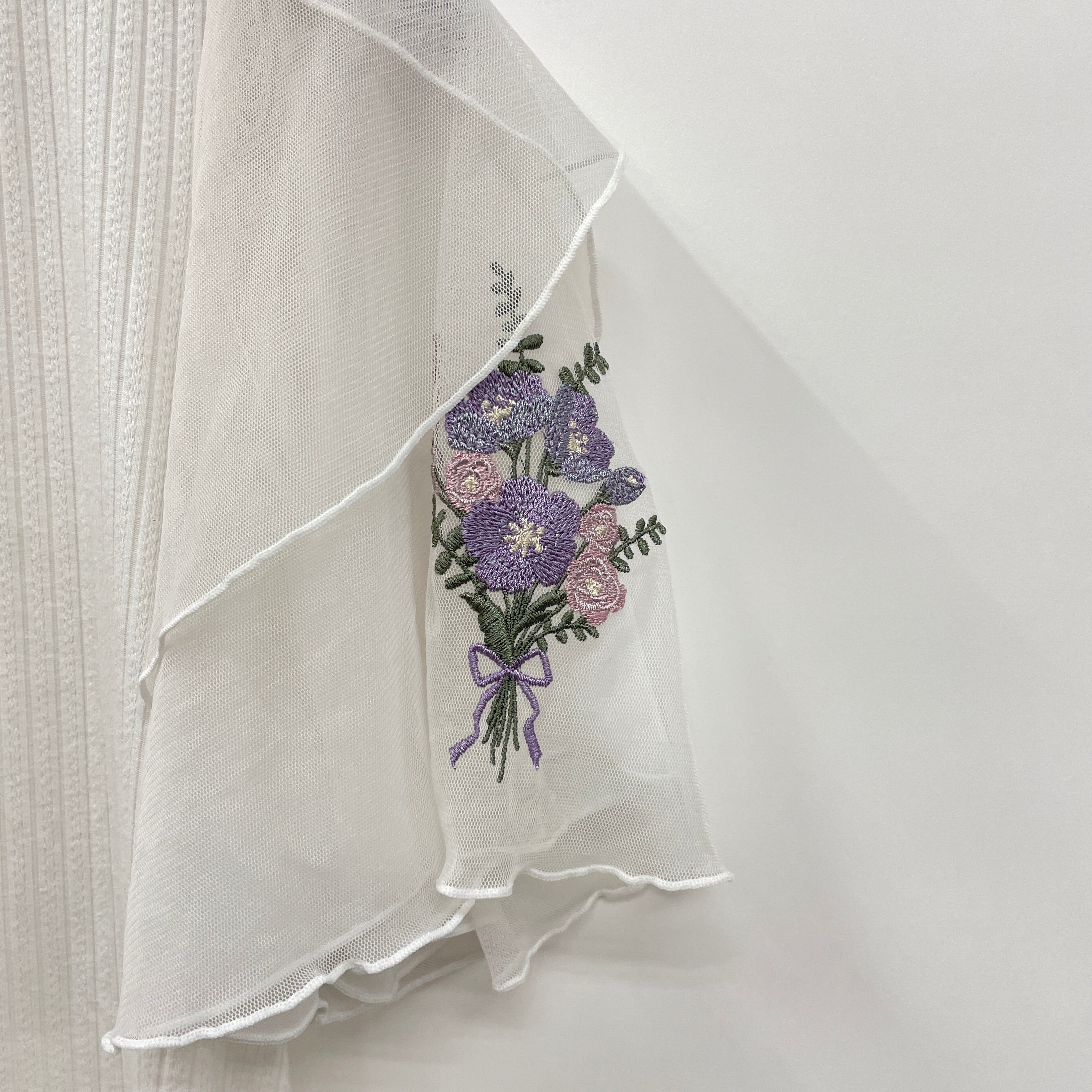華やかで存在感のあるチュール刺繍の上には、シンメトリーにチュールを重ね、ふわっとした空気感のあるシルエットに。
