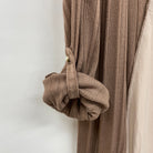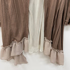 細めのプリーツチュールを重ねたバックシャンデザインのトッパーカーディガンです。ストライプ見えするランダムリブの生地は柔らかくて伸縮性がよく、着心地が良いのがポイント。長めの丈感で、パンツスタイルにもワンピーススタイルにもさらっと羽織ることができる便利なアイテムです。
