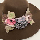 本物のような造花のブーケをあしらったつば広帽です。オーガンジーのリボンが華やかさを添える素敵な帽子です。