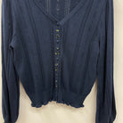 薔薇モチーフが並ぶフロントデザインがポイントのニットカーディガンです。