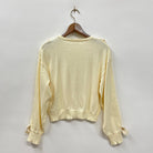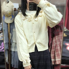 襟周りや袖に施されたサテンリボンが、甘さを加えつつ、エレガントな雰囲気を演出します。シンプルなカーディガンにリボンがアクセントとなり、フェミニンさを引き立てます。