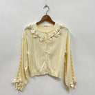 サテン生地で作られたリボンがたっぷりとあしらわれたカーディガンは、大人かわいさを引き立てるアイテムです。甘さと華やかさをプラスしてくれる一着です。