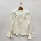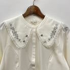 配色感のある刺繍と釦の装飾をあしらったビッグカラーのブラウスです。