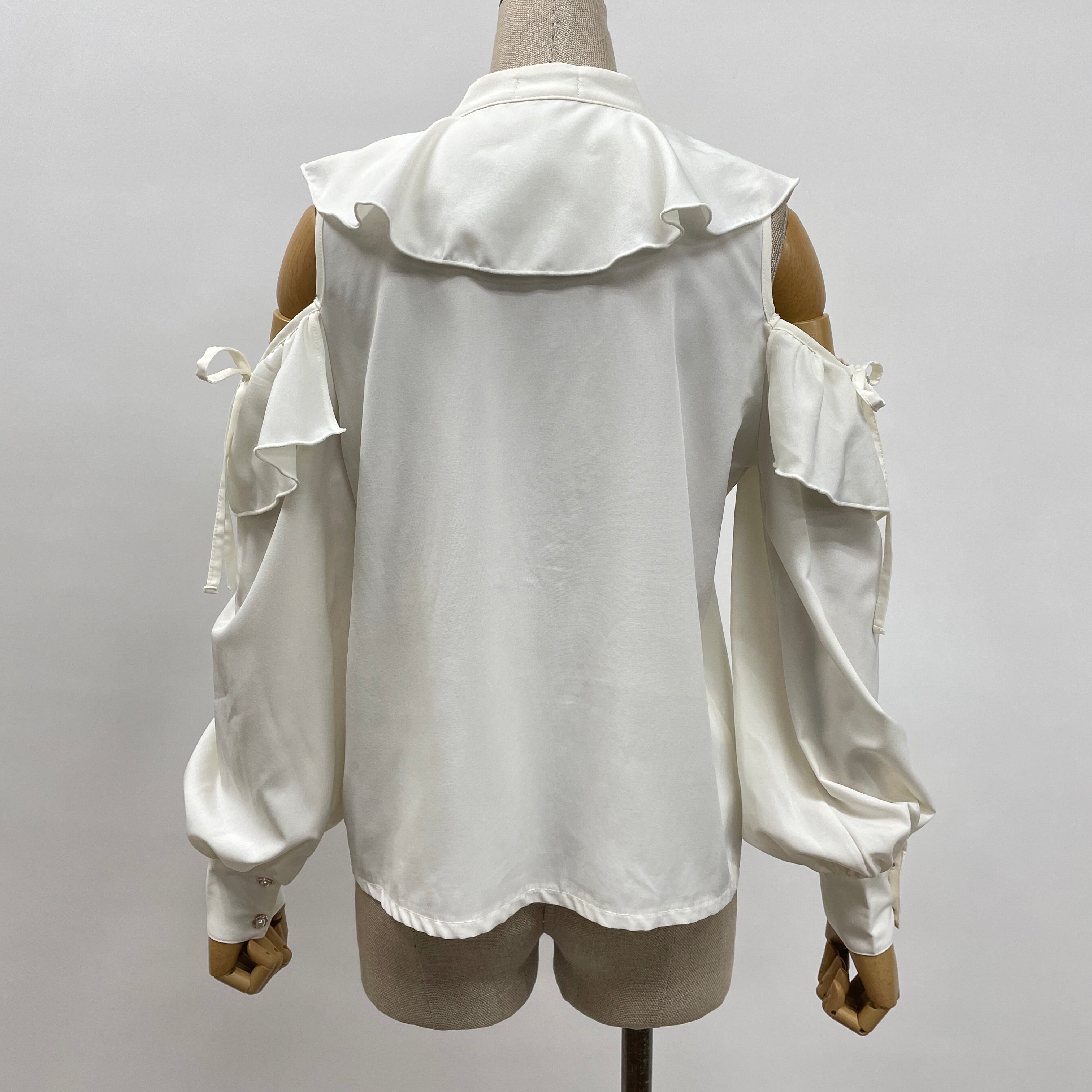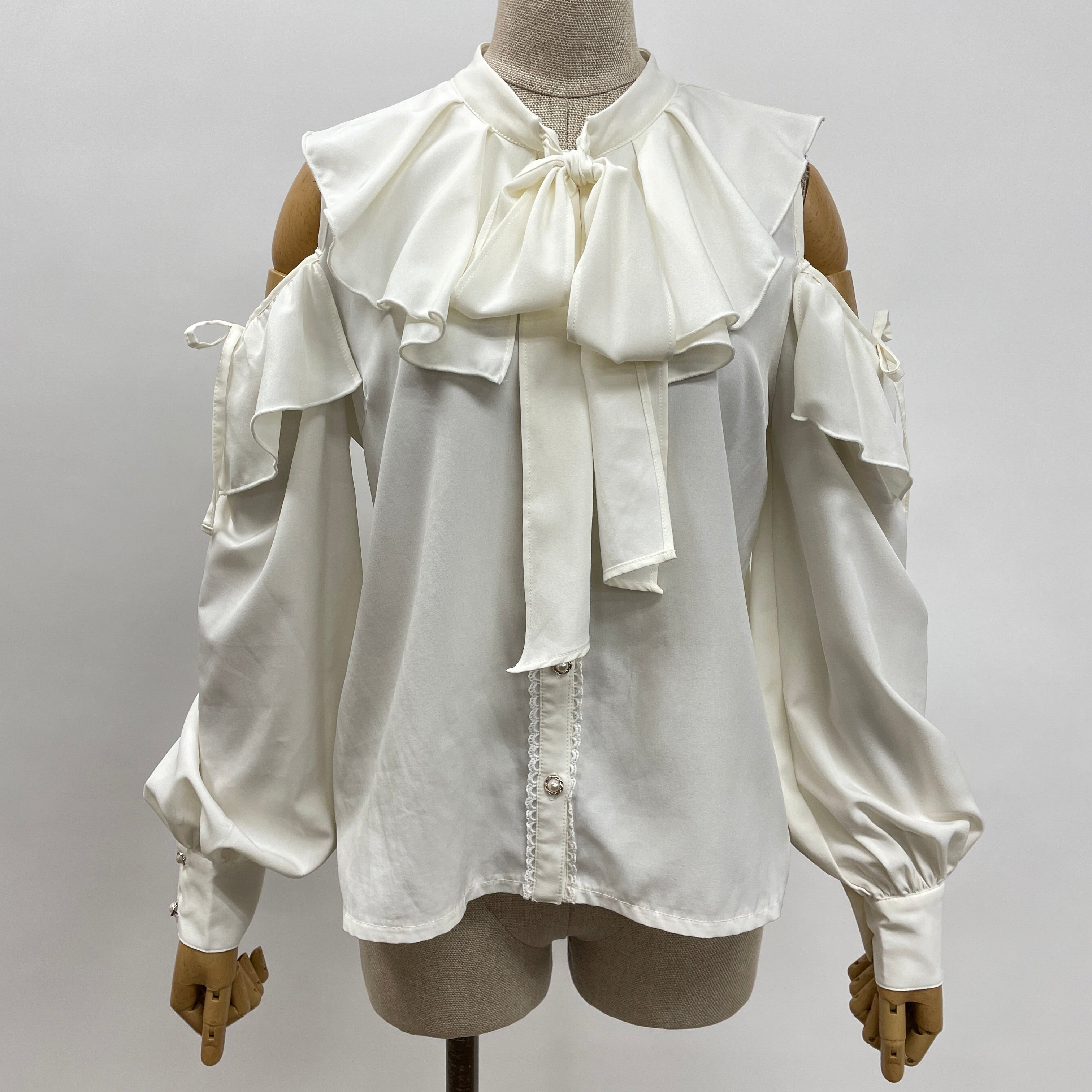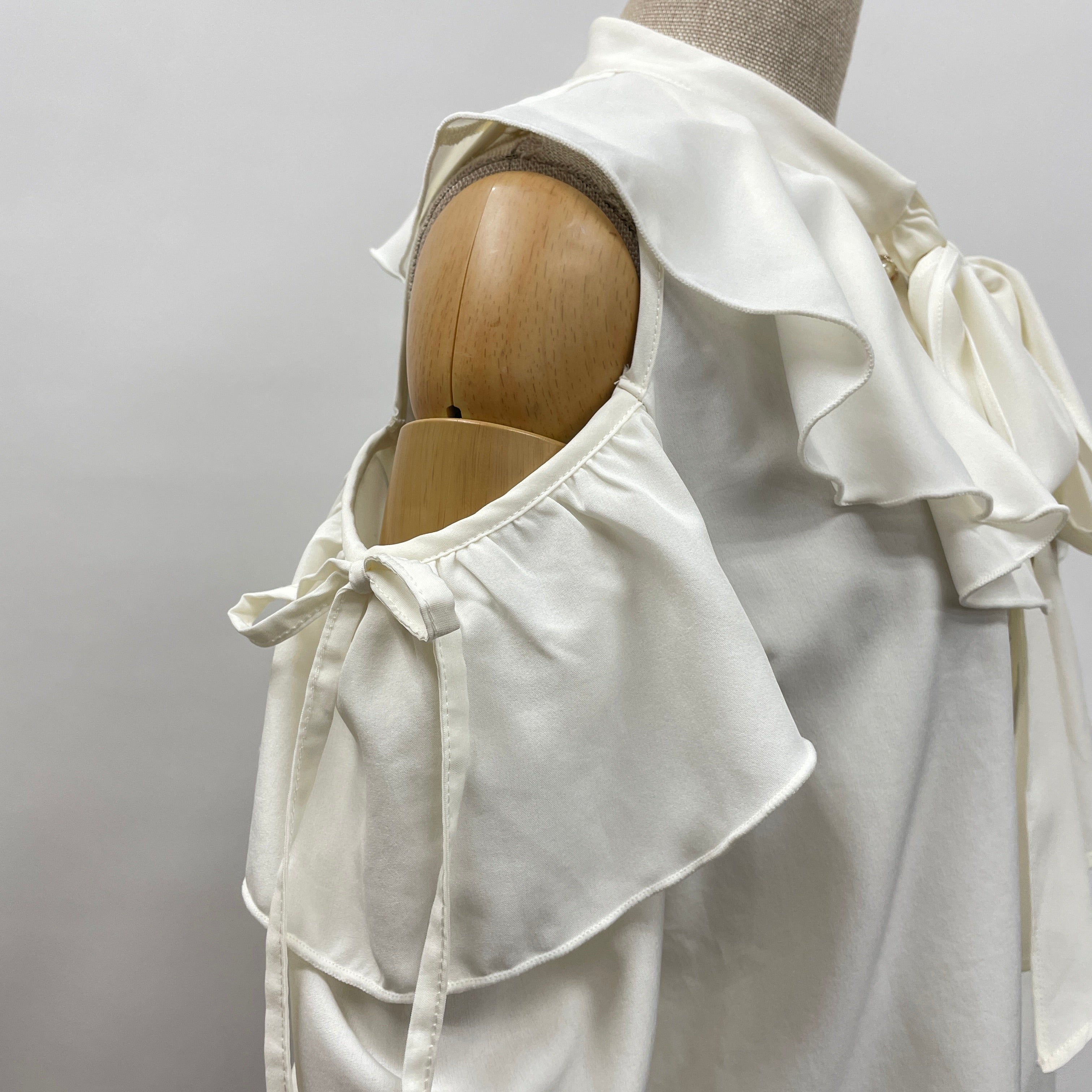 肩の内側にループがついており、袖側についている紐でオフショルに出来る2wayブラウス。紐はループに通した状態でオフショルにもできるように長めにお作りしています。大きめボウタイリボンでガーリーに着こなせます。襟元のフリルはニットカーデなどを羽織った際に出せるようになっています。