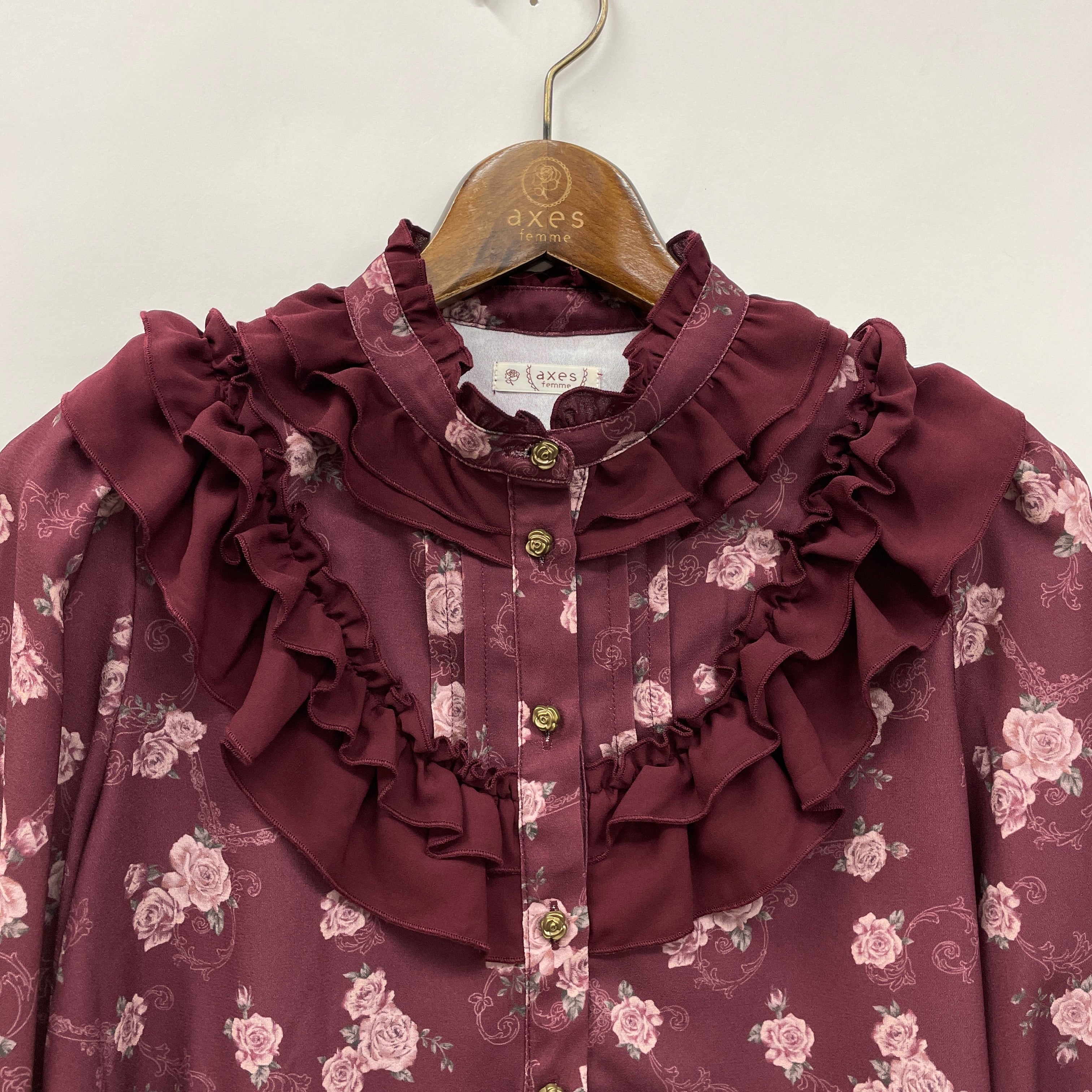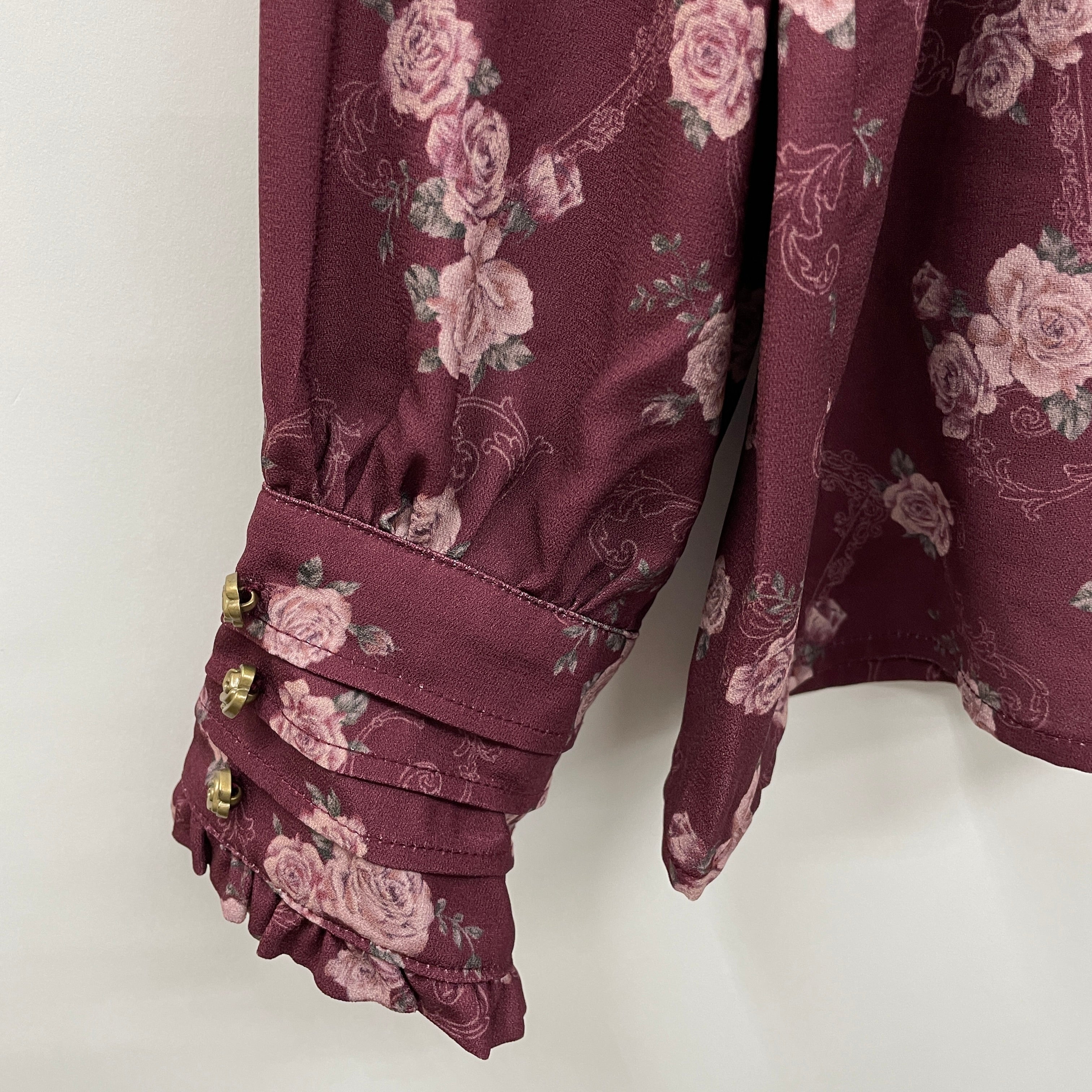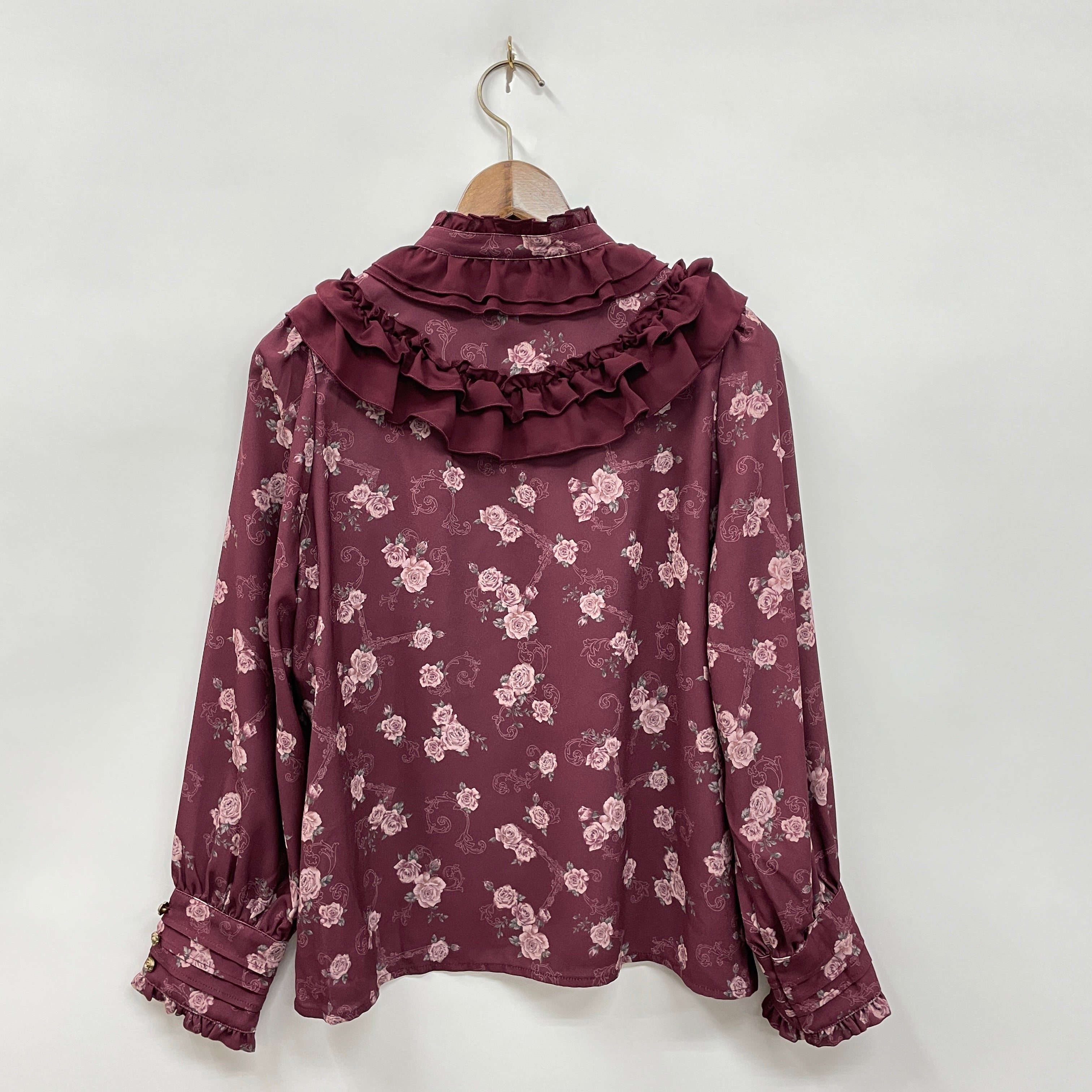 クラシックなくすみカラーのバラと、額縁風のオーナメントを組み合わせたオリジナル柄のブラウスです。